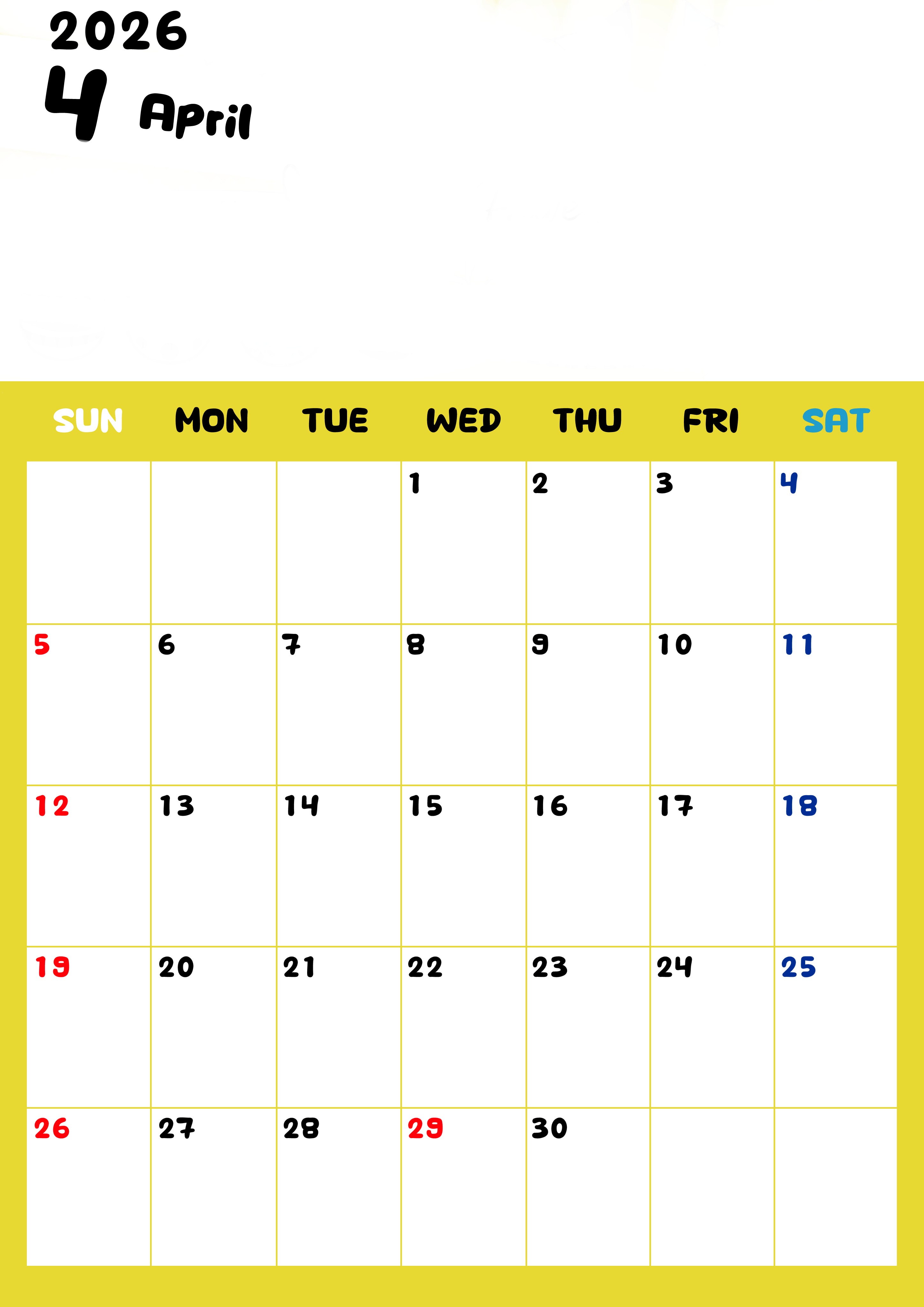 2026年・無料のカレンダーテンプレート 2026年4月縦型日曜始まり 書き込みしやすい文字が大きなA4無料シンプルなカレンダー(2026-01110410) 素材状デザイン王 2025年4月8日 2026年4月縦型日曜始まりの書き込みしやすい文字が大きなA4無料シンプルなカレンダーです。見やすいのでダウンロード利用をおすすめします。計画を立てるのに最適です。(2026-01110410) シンプル 4月 縦型のカレンダー 日曜始まり カレンダーデザイン-0111