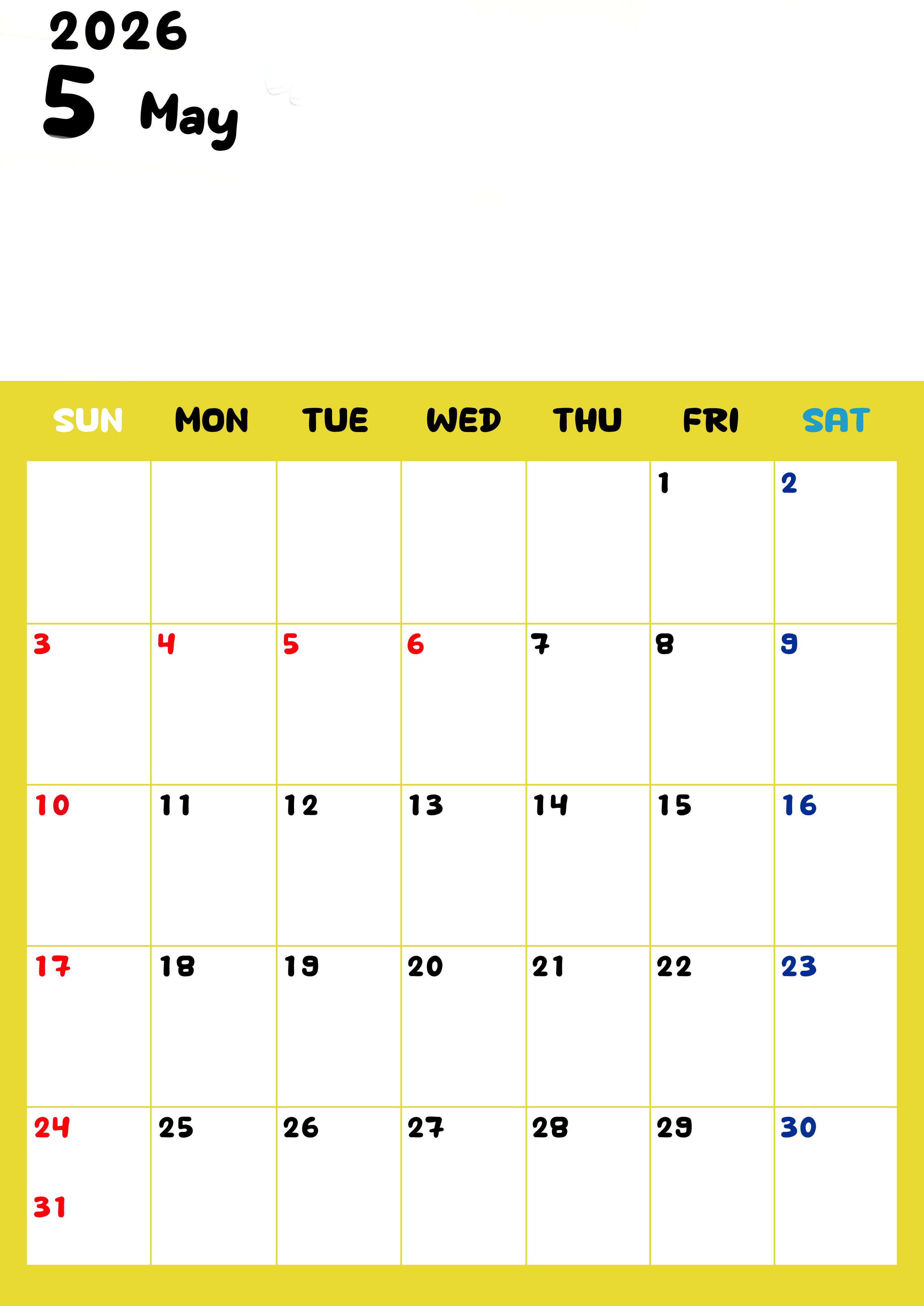 2026年・無料のカレンダーテンプレート 2026年5月縦型日曜始まり 書き込みしやすい文字が大きなA4無料シンプルなカレンダー(2026-01110510) 素材状デザイン王 2025年4月8日 2026年5月縦型日曜始まりの書き込みしやすい文字が大きなA4無料シンプルなカレンダーです。見やすいのでダウンロード利用をおすすめします。スケジュールを管理しやすいです。(2026-01110510) シンプル 5月 縦型のカレンダー 日曜始まり カレンダーデザイン-0111