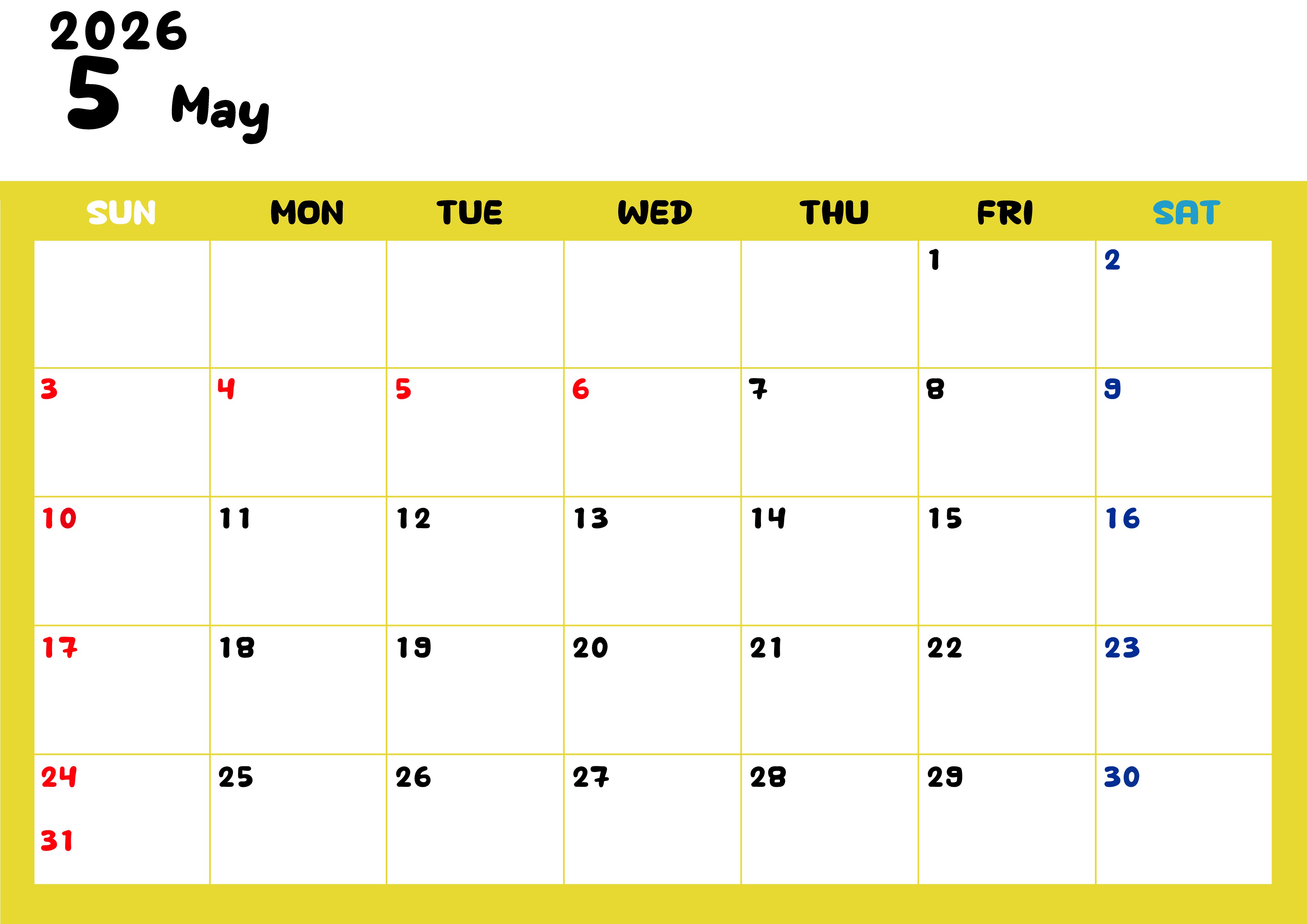 2026年5月横型日曜始まりの書き込みしやすい文字が大きなA4無料シンプルなカレンダーです。見やすいのでダウンロード利用をおすすめします。スケジュールを管理しやすいです。(2026-01110500)