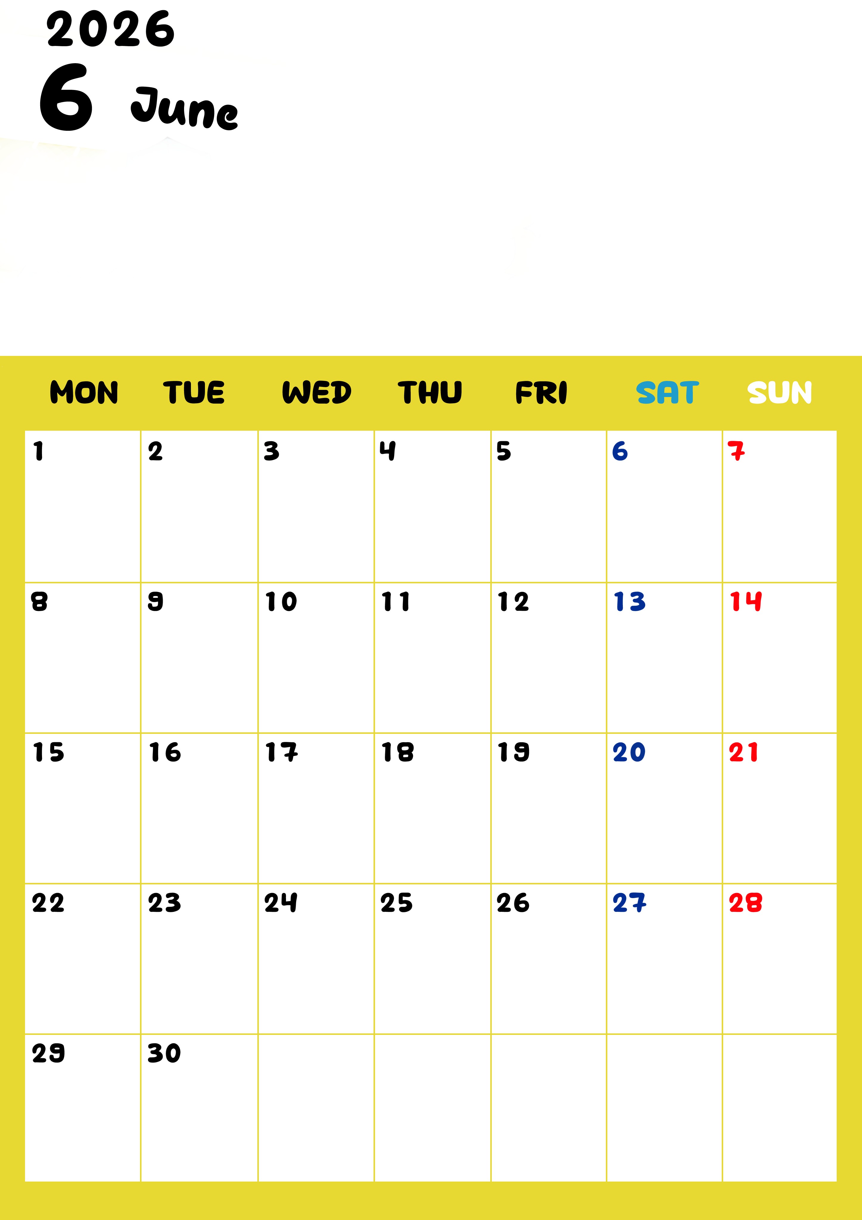 2026年6月縦型月曜始まり 書き込みしやすい文字が大きなA4無料シンプルなカレンダー(2026-01110611)