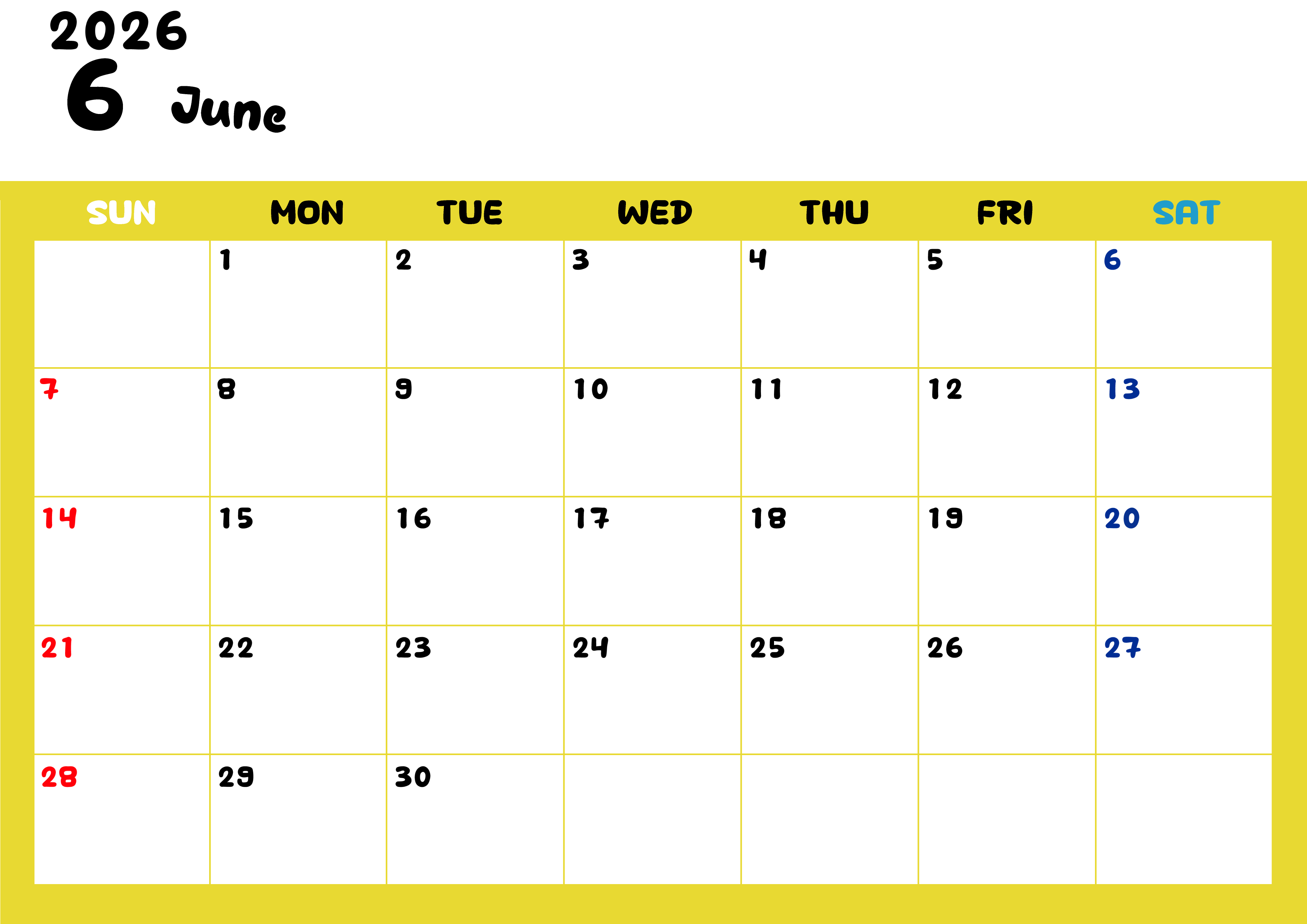 2026年・無料のカレンダーテンプレート 2026年6月横型日曜始まり 書き込みしやすい文字が大きなA4無料シンプルなカレンダー(2026-01110600) 素材状デザイン王 2025年4月8日 2026年6月横型日曜始まりの書き込みしやすい文字が大きなA4無料シンプルなカレンダーです。見やすいのでダウンロード利用をおすすめします。プランの整理にぴったりです。(2026-01110600) シンプル 6月 横型のカレンダー 日曜始まり カレンダーデザイン-0111