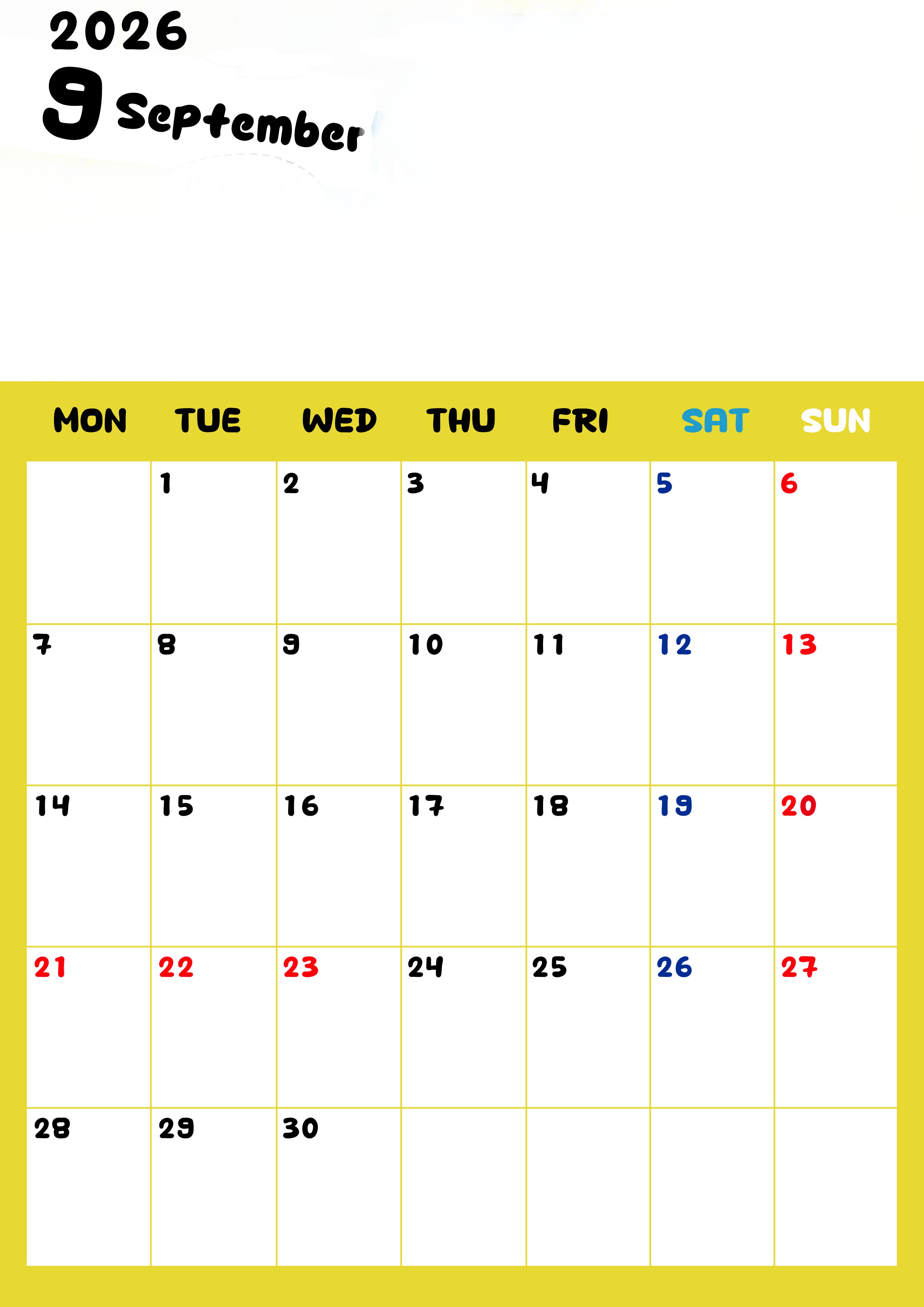 2026年・無料のカレンダーテンプレート 2026年9月縦型月曜始まり 書き込みしやすい文字が大きなA4無料シンプルなカレンダー(2026-01110911) 素材状デザイン王 2025年4月8日 2026年9月縦型月曜始まりの書き込みしやすい文字が大きなA4無料シンプルなカレンダーです。見やすいのでダウンロード利用をおすすめします。プランの整理にぴったりです。(2026-01110911) シンプル 9月 縦型のカレンダー 月曜始まり カレンダーデザイン-0111