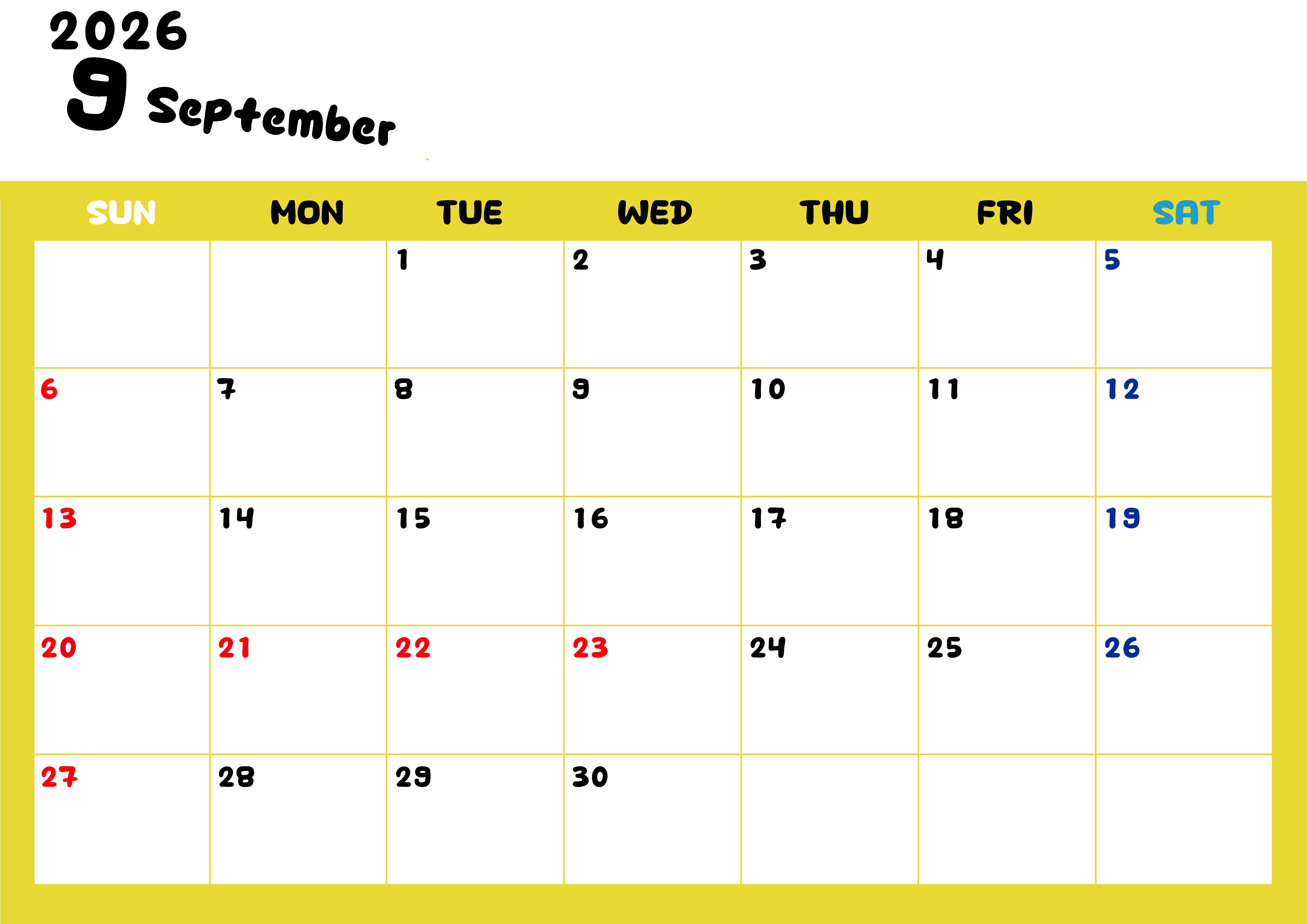 2026年9月横型日曜始まりの書き込みしやすい文字が大きなA4無料シンプルなカレンダーです。見やすいのでダウンロード利用をおすすめします。プランの整理にぴったりです。(2026-01110900)