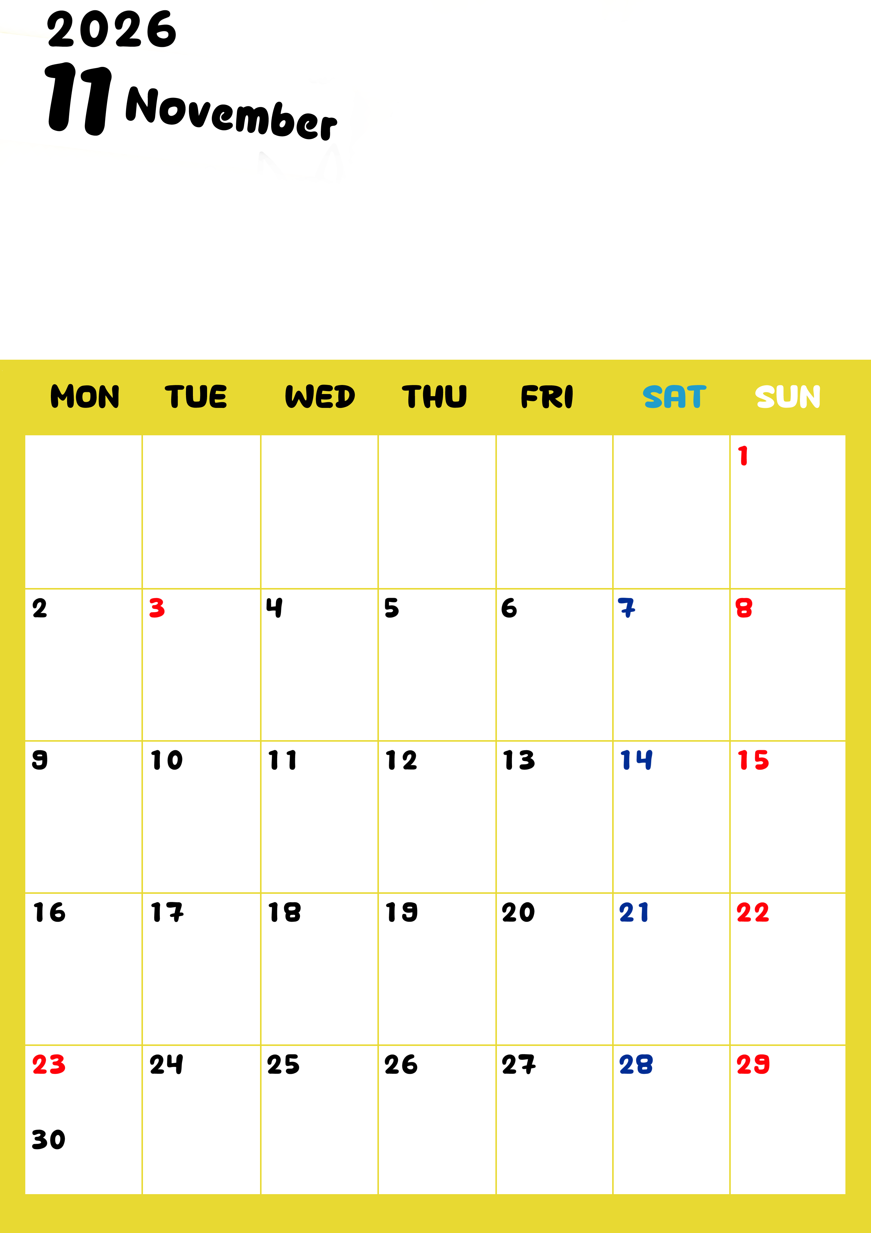 2026年・無料のカレンダーテンプレート 2026年11月縦型月曜始まり 書き込みしやすい文字が大きなA4無料シンプルなカレンダー(2026-01111111) 素材状デザイン王 2025年4月8日 2026年11月縦型月曜始まりの書き込みしやすい文字が大きなA4無料シンプルなカレンダーです。見やすいのでダウンロード利用をおすすめします。スケジュールを管理しやすいです。(2026-01111111) シンプル 11月 縦型のカレンダー 月曜始まり カレンダーデザイン-0111