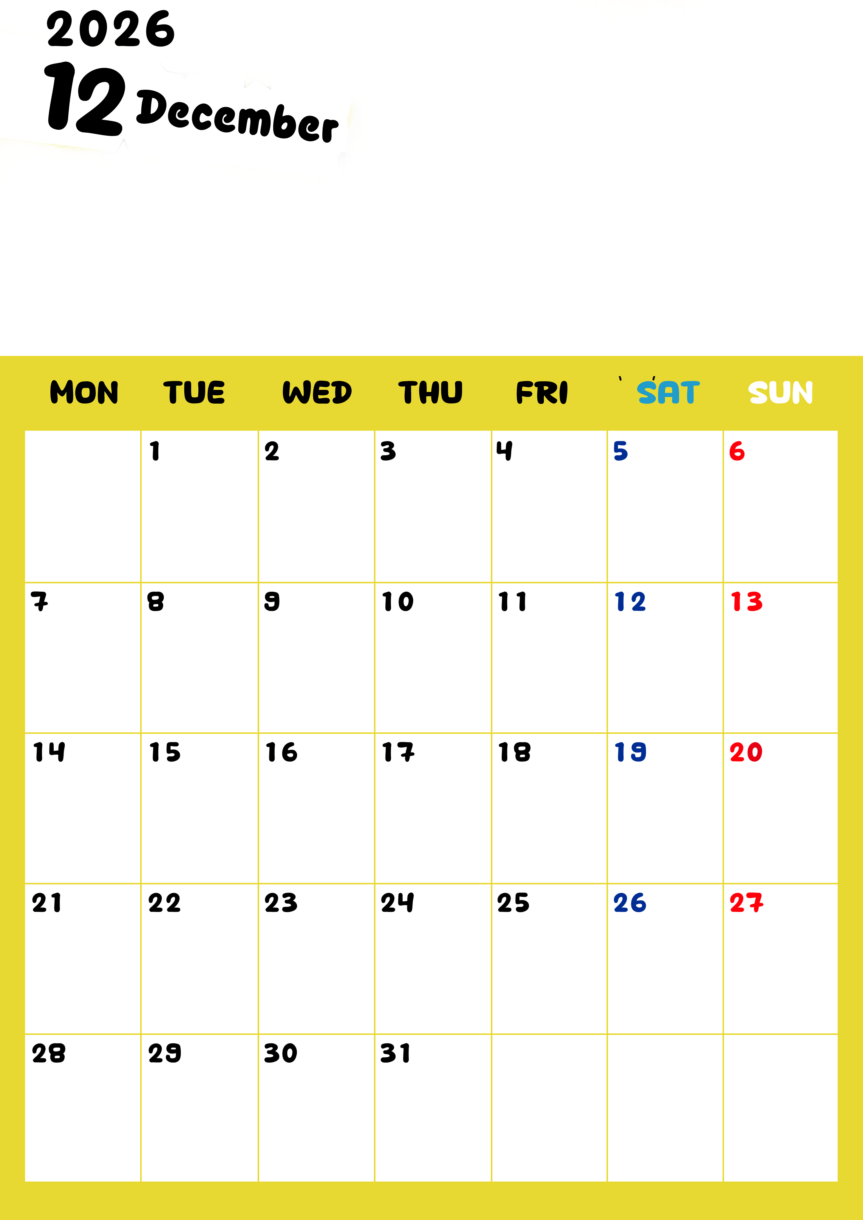 2026年12月縦型月曜始まりの書き込みしやすい文字が大きなA4無料シンプルなカレンダーです。見やすいのでダウンロード利用をおすすめします。プランの整理にぴったりです。(2026-01111211)