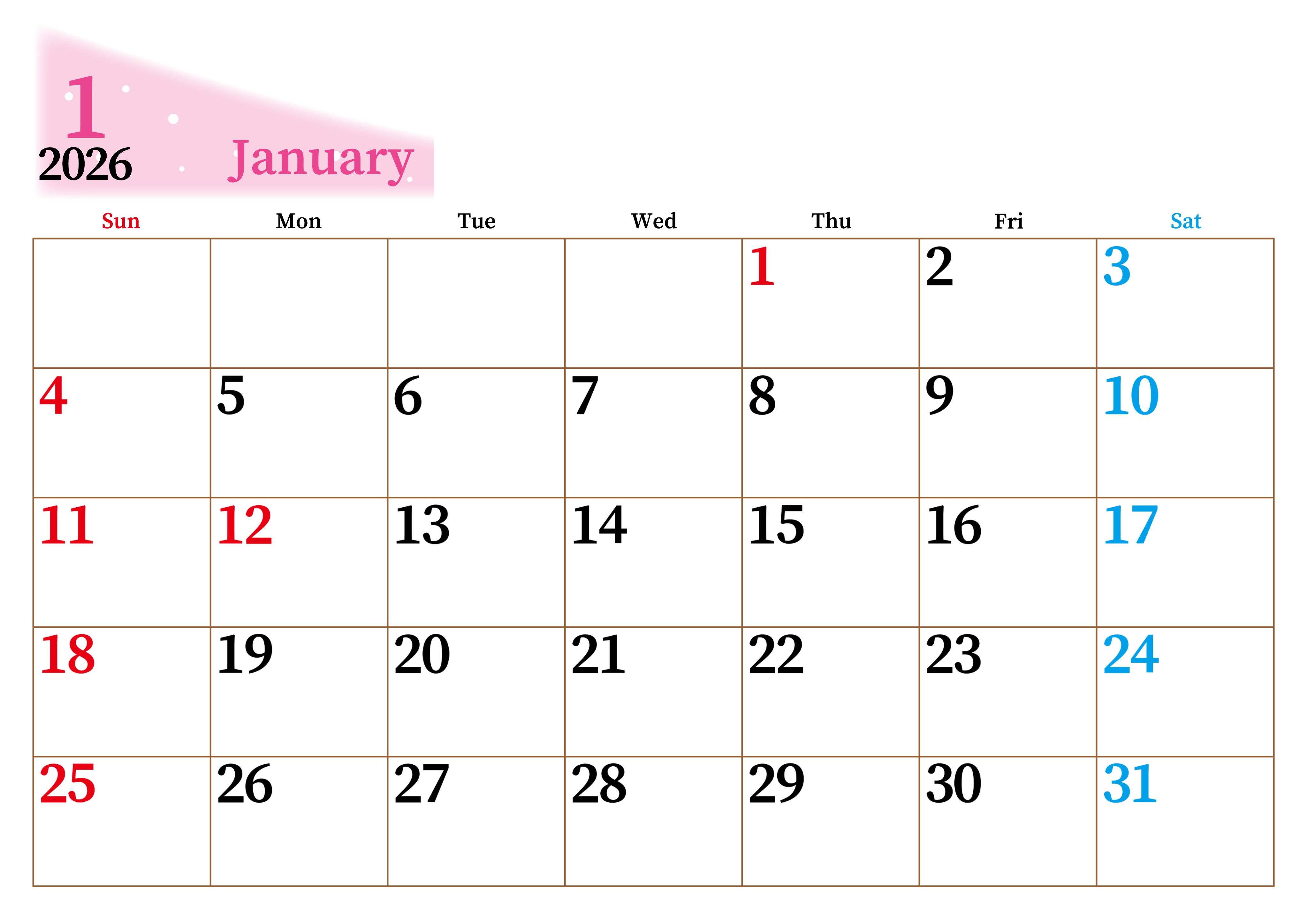 2026年1月横型日曜始まりの大きい文字が見やすく書き込みも楽なA4無料シンプルカレンダーです。見やすいのでダウンロード利用をおすすめします。計画を効率的に立てましょう。(2026-01120100)