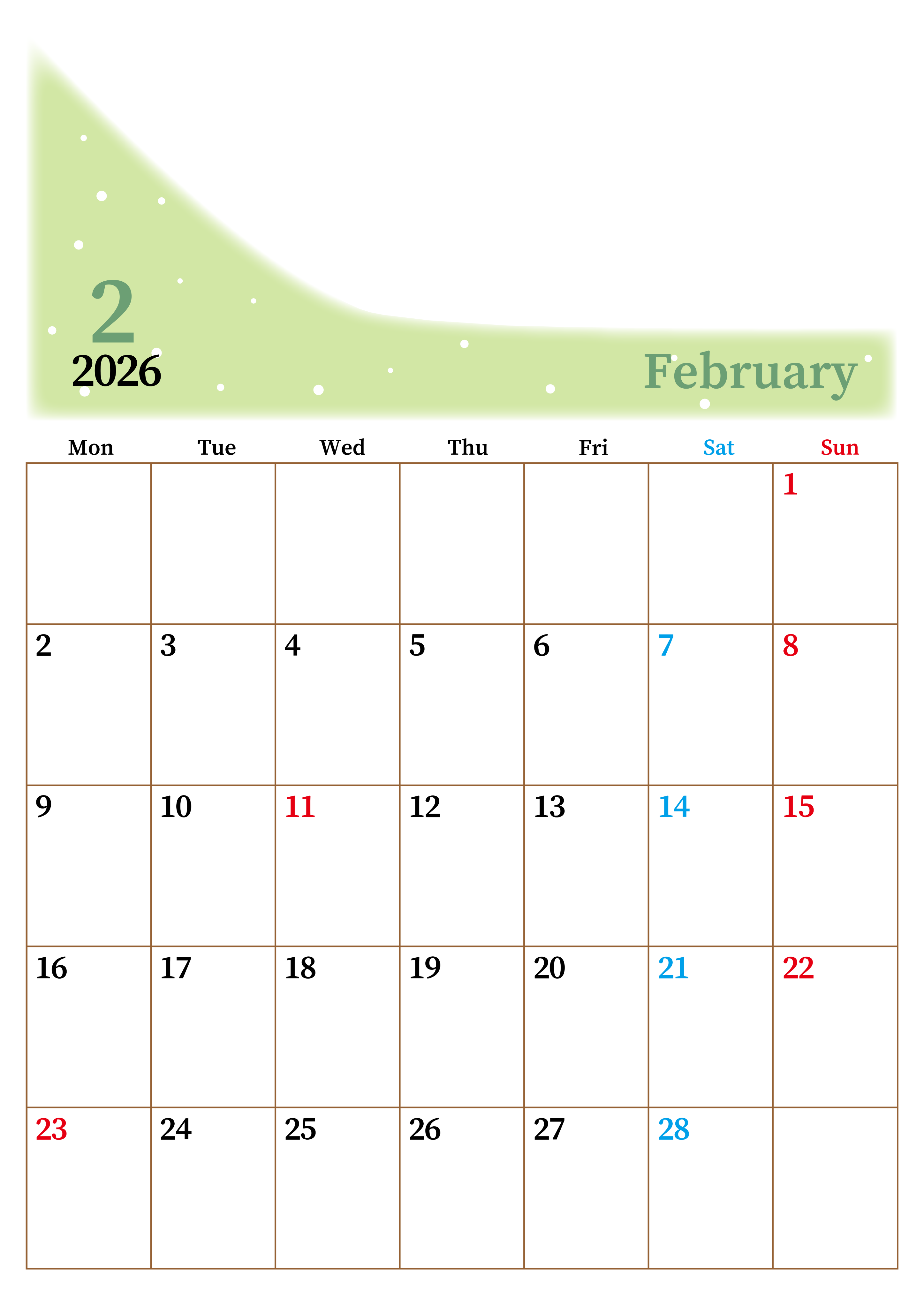 2026年・無料のカレンダーテンプレート 2026年2月縦型月曜始まり 大きい文字が見やすく書き込みも楽なA4無料シンプルカレンダー(2026-01120211) 素材状デザイン王 2025年4月8日 2026年2月縦型月曜始まりの大きい文字が見やすく書き込みも楽なA4無料シンプルカレンダーです。スケジュールの整理におすすめのフリー素材です。忙しいスケジュールを簡単にまとめて書き込みましょう。(2026-01120211) シンプル 2月 縦型のカレンダー 月曜始まり カレンダーデザイン-0112