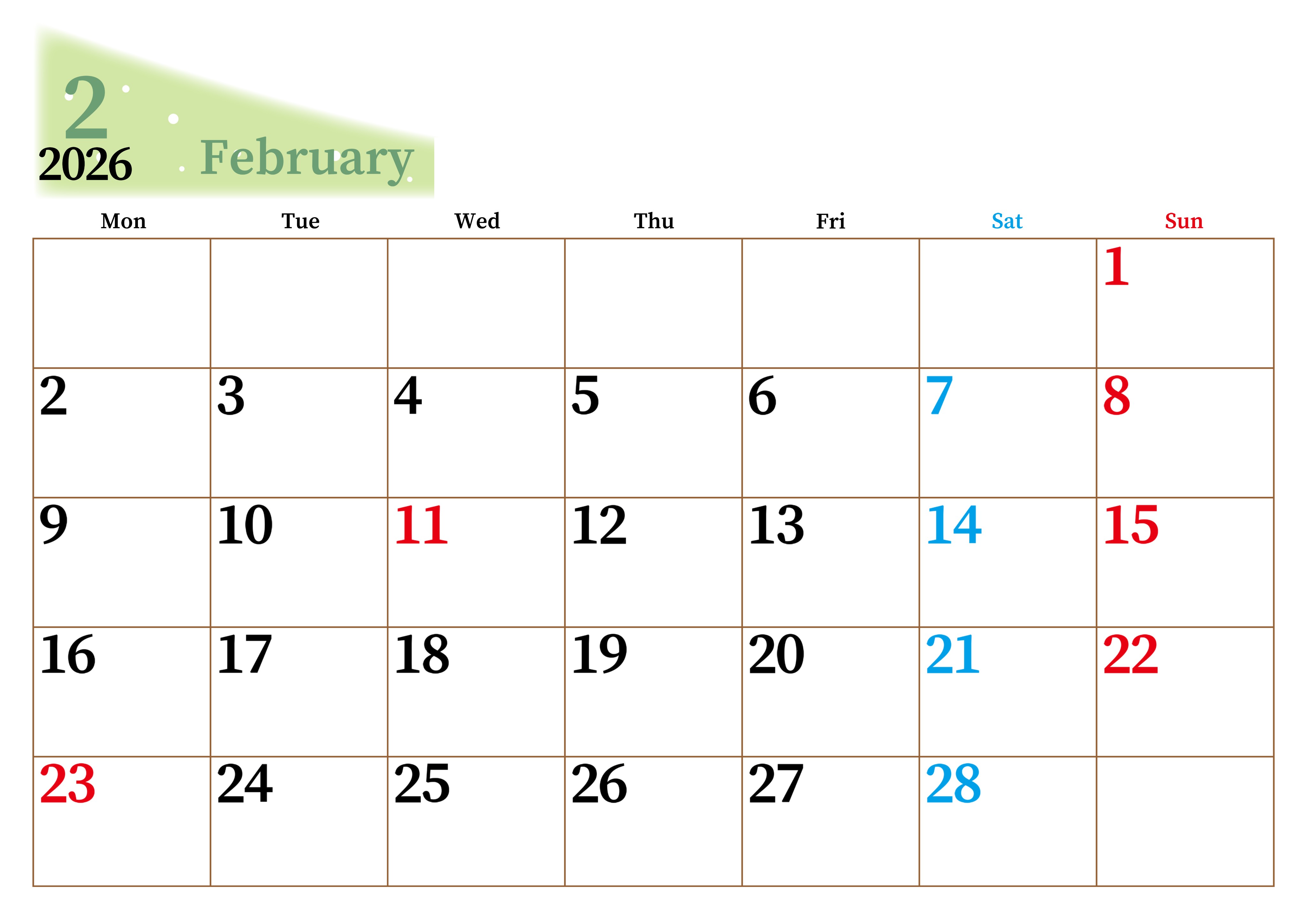 2026年2月横型月曜始まり 大きい文字が見やすく書き込みも楽なA4無料シンプルカレンダー(2026-01120201)