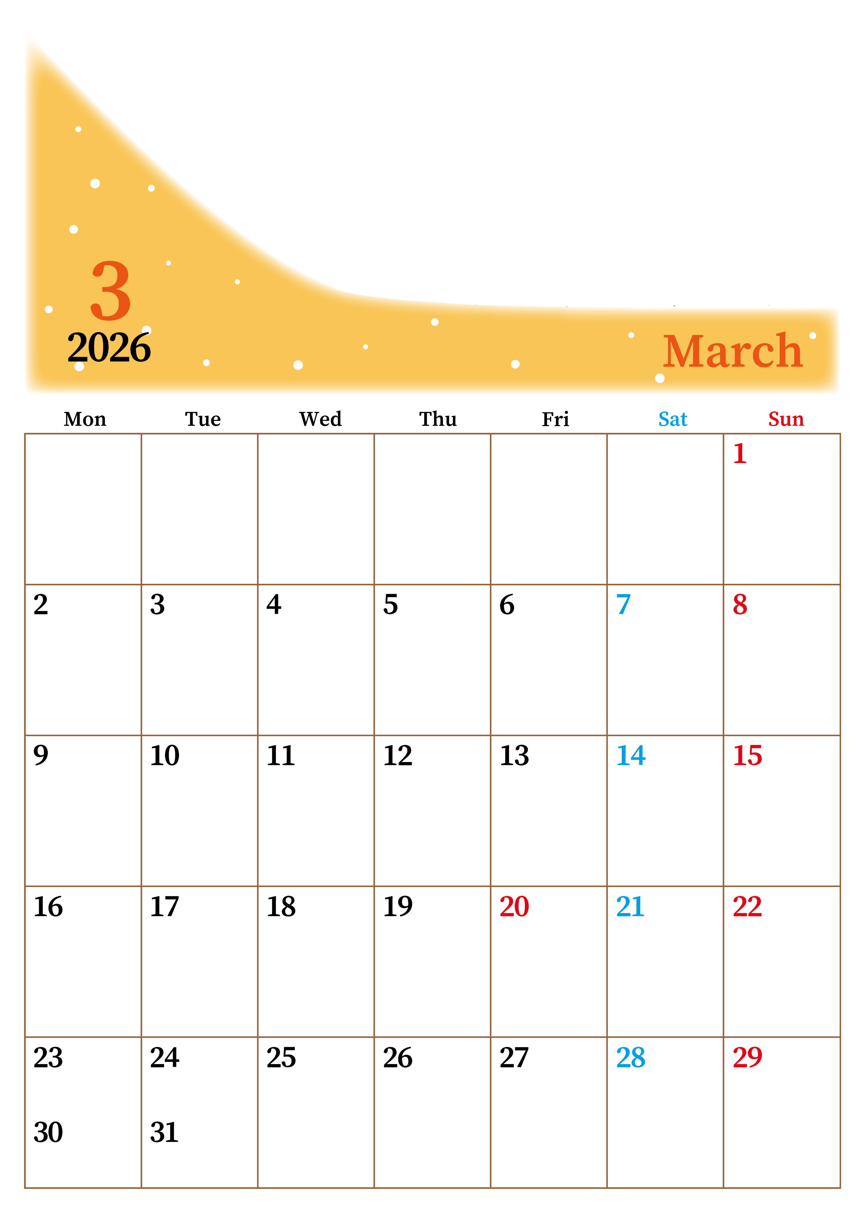 2026年・無料のカレンダーテンプレート 2026年3月縦型月曜始まり 大きい文字が見やすく書き込みも楽なA4無料シンプルカレンダー(2026-01120311) 素材状デザイン王 2025年4月8日 2026年3月縦型月曜始まりの大きい文字が見やすく書き込みも楽なA4無料シンプルカレンダーです。スケジュールの整理におすすめのフリー素材です。多忙なプランの可視化に役立ちます。(2026-01120311) シンプル 3月 縦型のカレンダー 月曜始まり カレンダーデザイン-0112