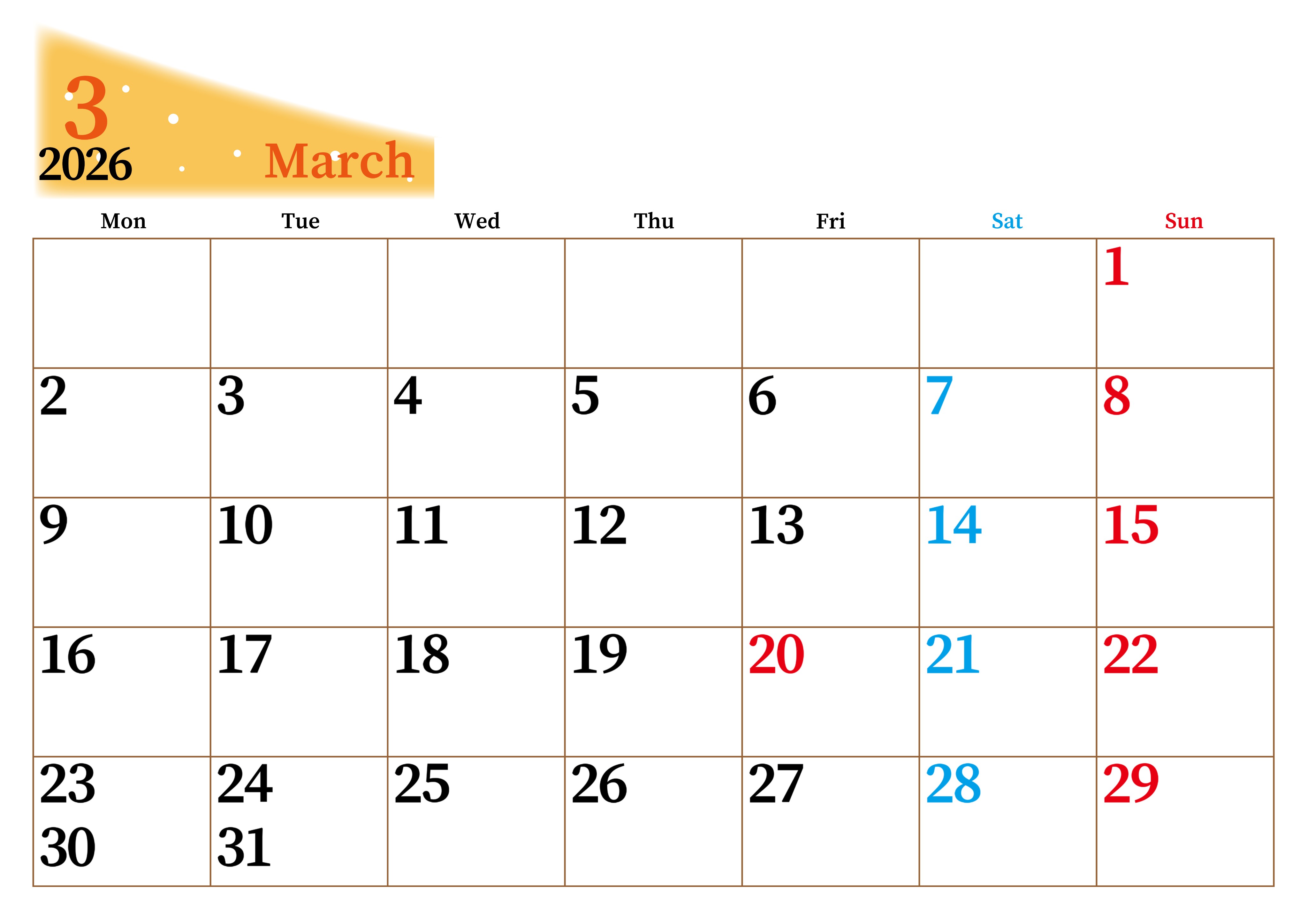 2026年・無料のカレンダーテンプレート 2026年3月横型月曜始まり 大きい文字が見やすく書き込みも楽なA4無料シンプルカレンダー(2026-01120301) 素材状デザイン王 2025年4月8日 2026年3月横型月曜始まりの大きい文字が見やすく書き込みも楽なA4無料シンプルカレンダーです。スケジュールの整理におすすめのフリー素材です。多忙なプランの可視化に役立ちます。(2026-01120301) シンプル 3月 横型のカレンダー 月曜始まり カレンダーデザイン-0112