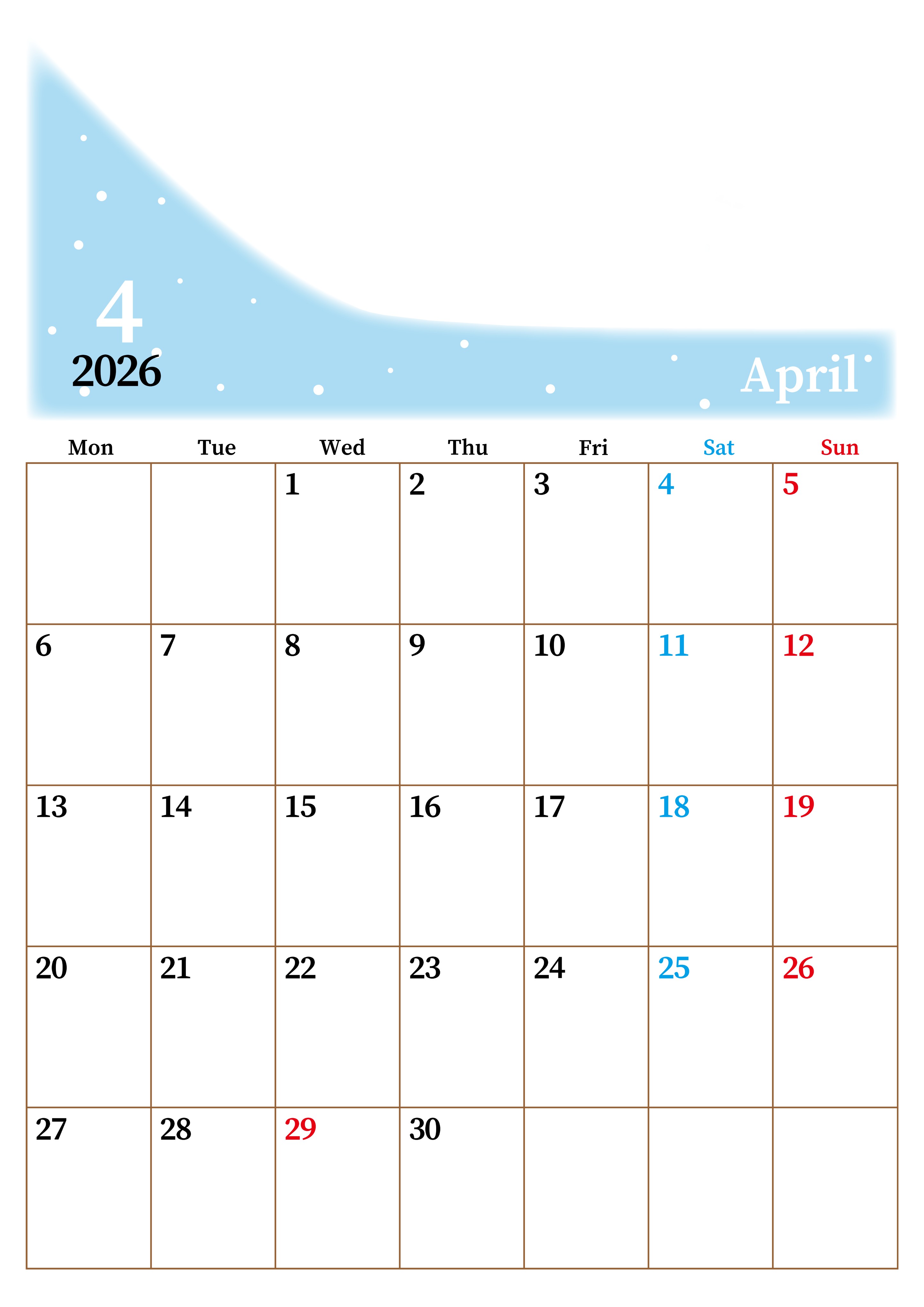 2026年・無料のカレンダーテンプレート 2026年4月縦型月曜始まり 大きい文字が見やすく書き込みも楽なA4無料シンプルカレンダー(2026-01120411) 素材状デザイン王 2025年4月8日 2026年4月縦型月曜始まりの大きい文字が見やすく書き込みも楽なA4無料シンプルカレンダーです。スケジュールの整理におすすめのフリー素材です。計画を効率的に立てましょう。(2026-01120411) シンプル 4月 縦型のカレンダー 月曜始まり カレンダーデザイン-0112