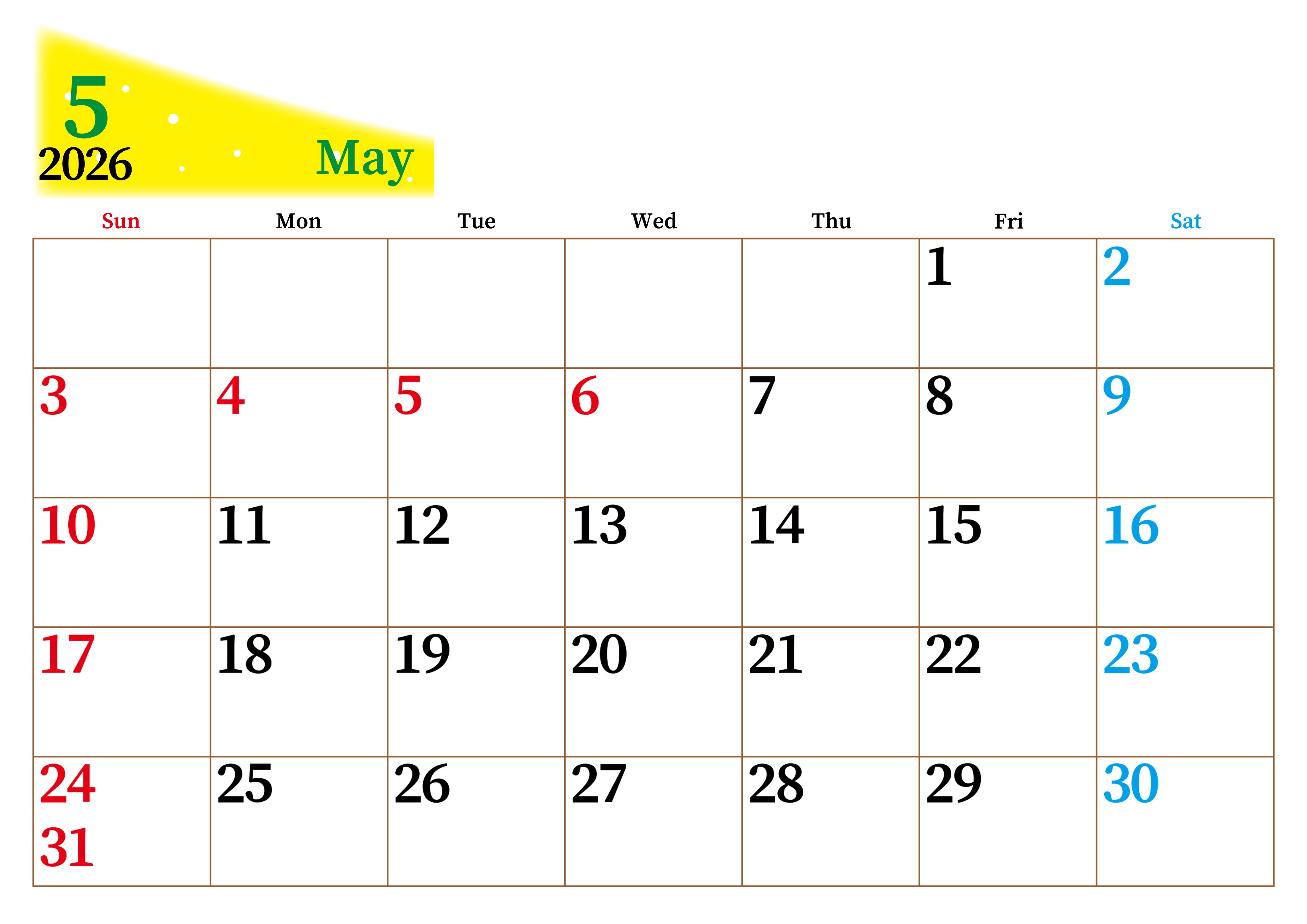 2026年5月横型日曜始まりの大きい文字が見やすく書き込みも楽なA4無料シンプルカレンダーです。スケジュールの整理におすすめのフリー素材です。忙しいスケジュールを簡単にまとめて書き込みましょう。(2026-01120500)