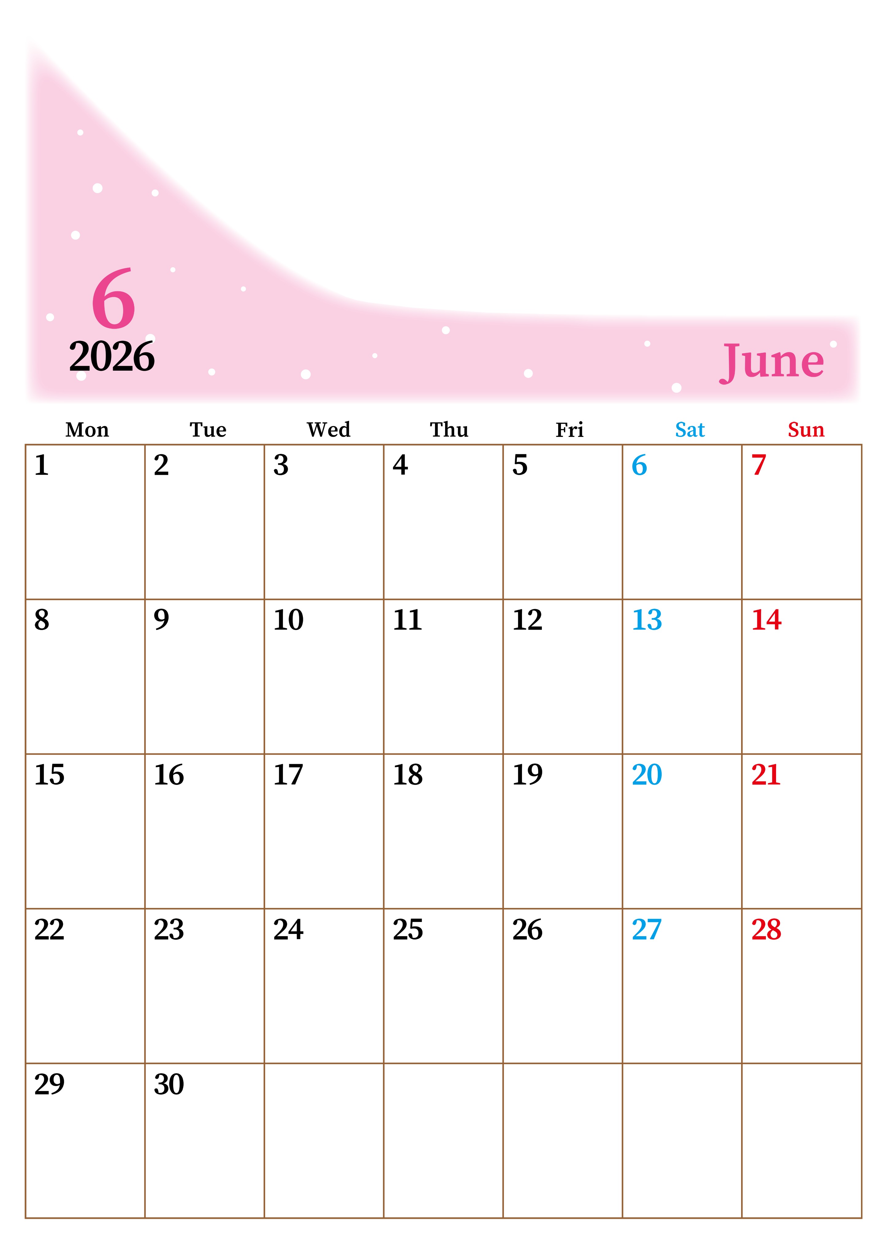 2026年・無料のカレンダーテンプレート 2026年6月縦型月曜始まり 大きい文字が見やすく書き込みも楽なA4無料シンプルカレンダー(2026-01120611) 素材状デザイン王 2025年4月8日 2026年6月縦型月曜始まりの大きい文字が見やすく書き込みも楽なA4無料シンプルカレンダーです。スケジュールの整理におすすめのフリー素材です。多忙なプランの可視化に役立ちます。(2026-01120611) シンプル 6月 縦型のカレンダー 月曜始まり カレンダーデザイン-0112