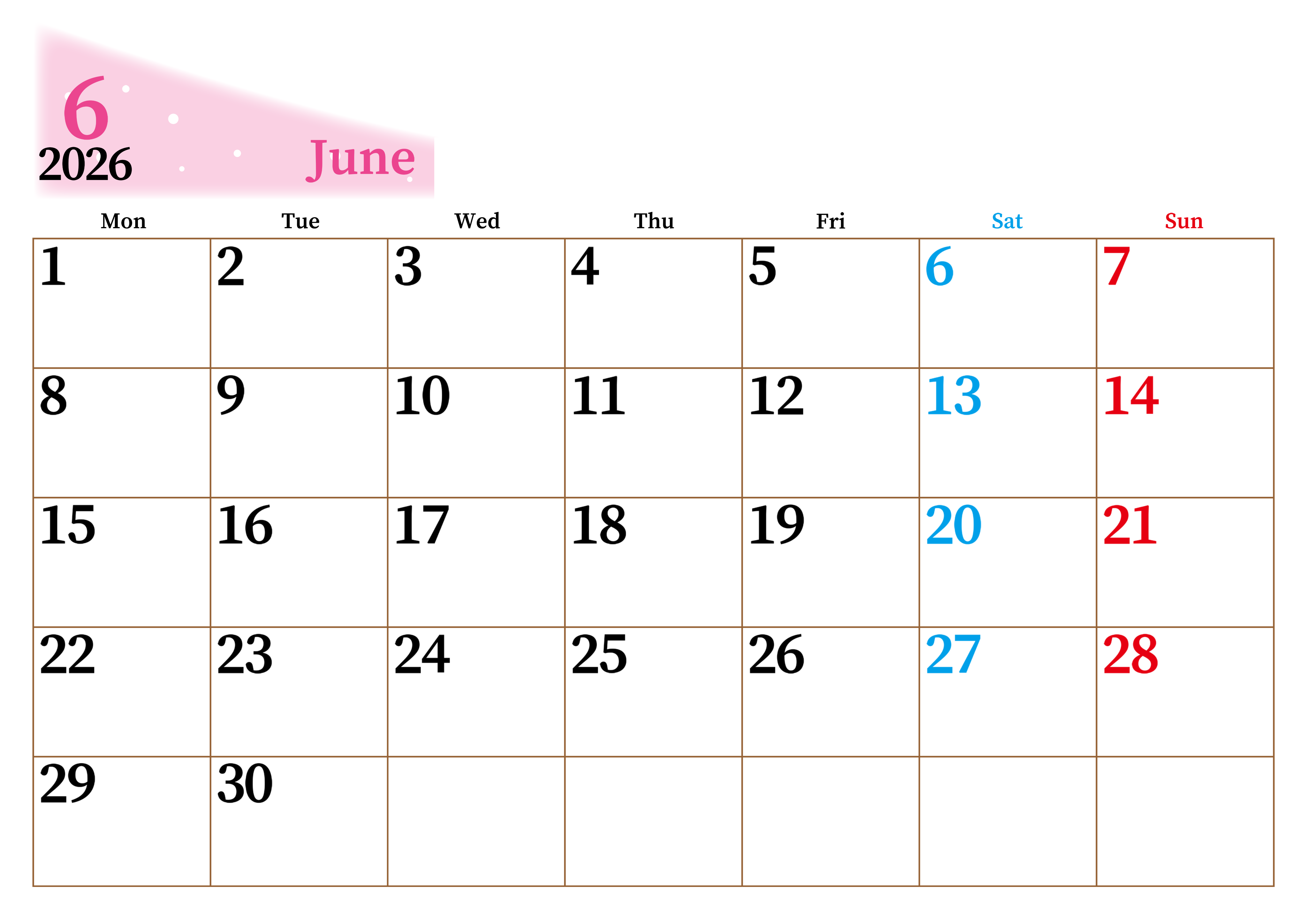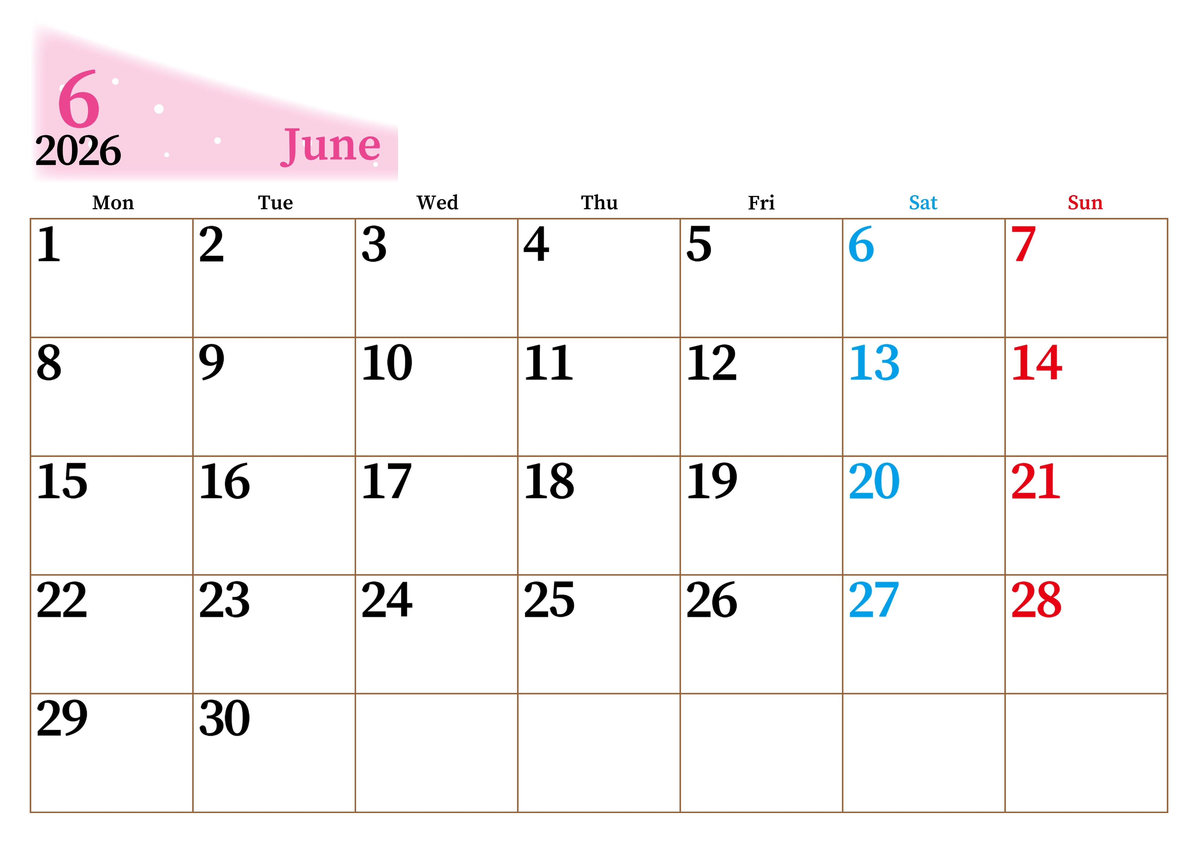 2026年・無料のカレンダーテンプレート 2026年6月横型月曜始まり 大きい文字が見やすく書き込みも楽なA4無料シンプルカレンダー(2026-01120601) 素材状デザイン王 2025年4月8日 2026年6月横型月曜始まりの大きい文字が見やすく書き込みも楽なA4無料シンプルカレンダーです。スケジュールの整理におすすめのフリー素材です。多忙なプランの可視化に役立ちます。(2026-01120601) シンプル 6月 横型のカレンダー 月曜始まり カレンダーデザイン-0112