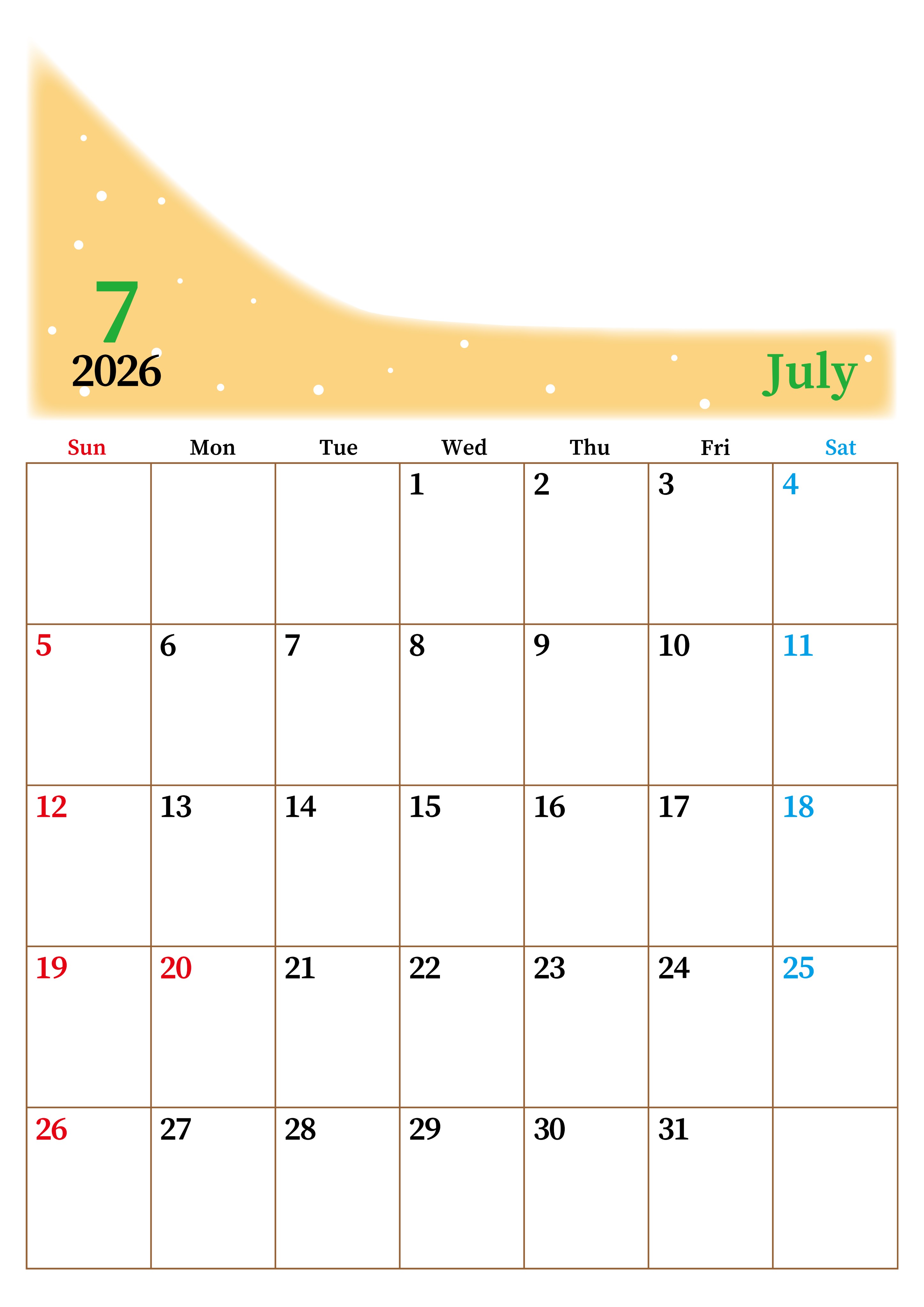 2026年・無料のカレンダーテンプレート 2026年7月縦型日曜始まり 大きい文字が見やすく書き込みも楽なA4無料シンプルカレンダー(2026-01120710) 素材状デザイン王 2025年4月8日 2026年7月縦型日曜始まりの大きい文字が見やすく書き込みも楽なA4無料シンプルカレンダーです。スケジュールの整理におすすめのフリー素材です。計画を効率的に立てましょう。(2026-01120710) シンプル 7月 縦型のカレンダー 日曜始まり カレンダーデザイン-0112