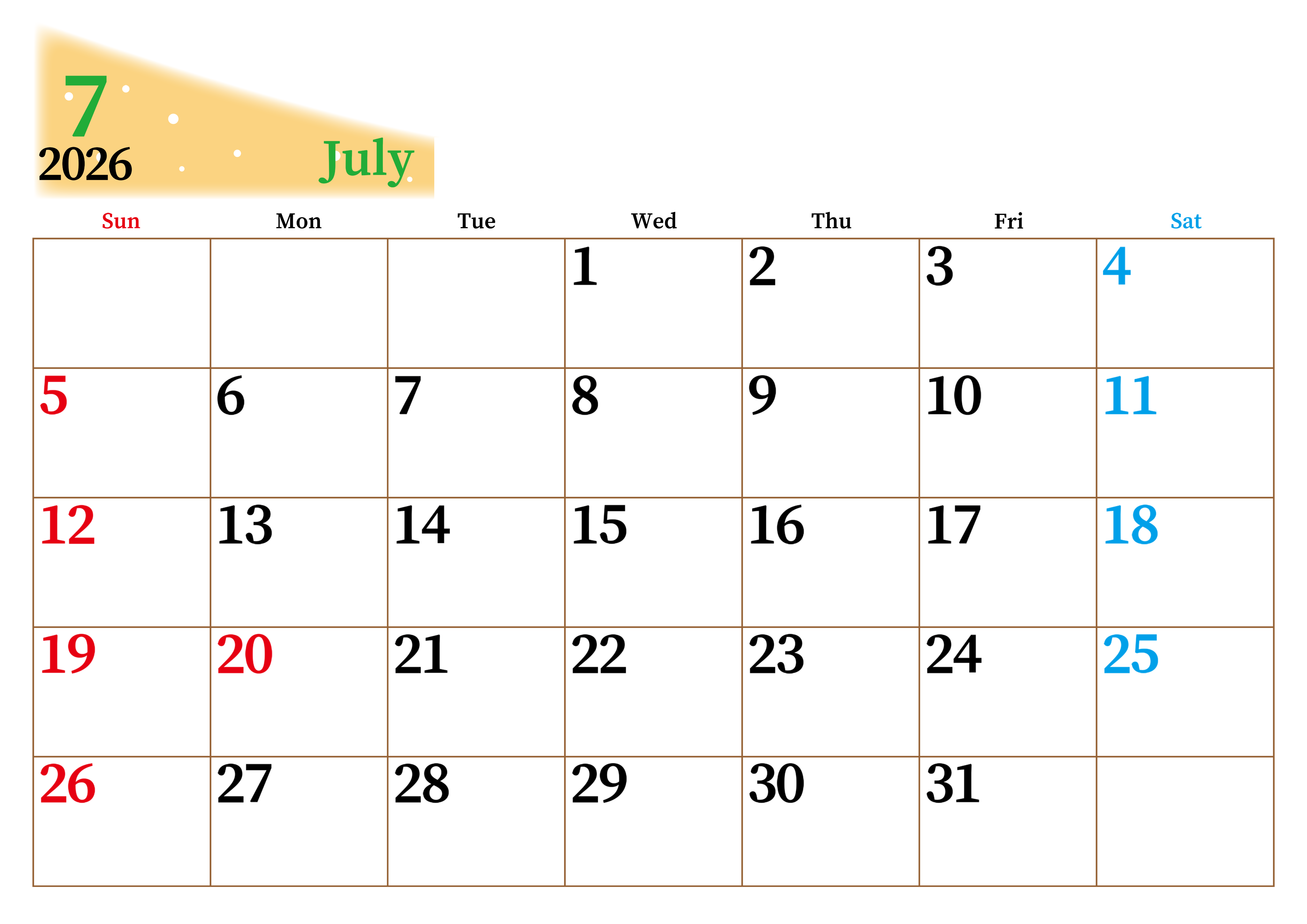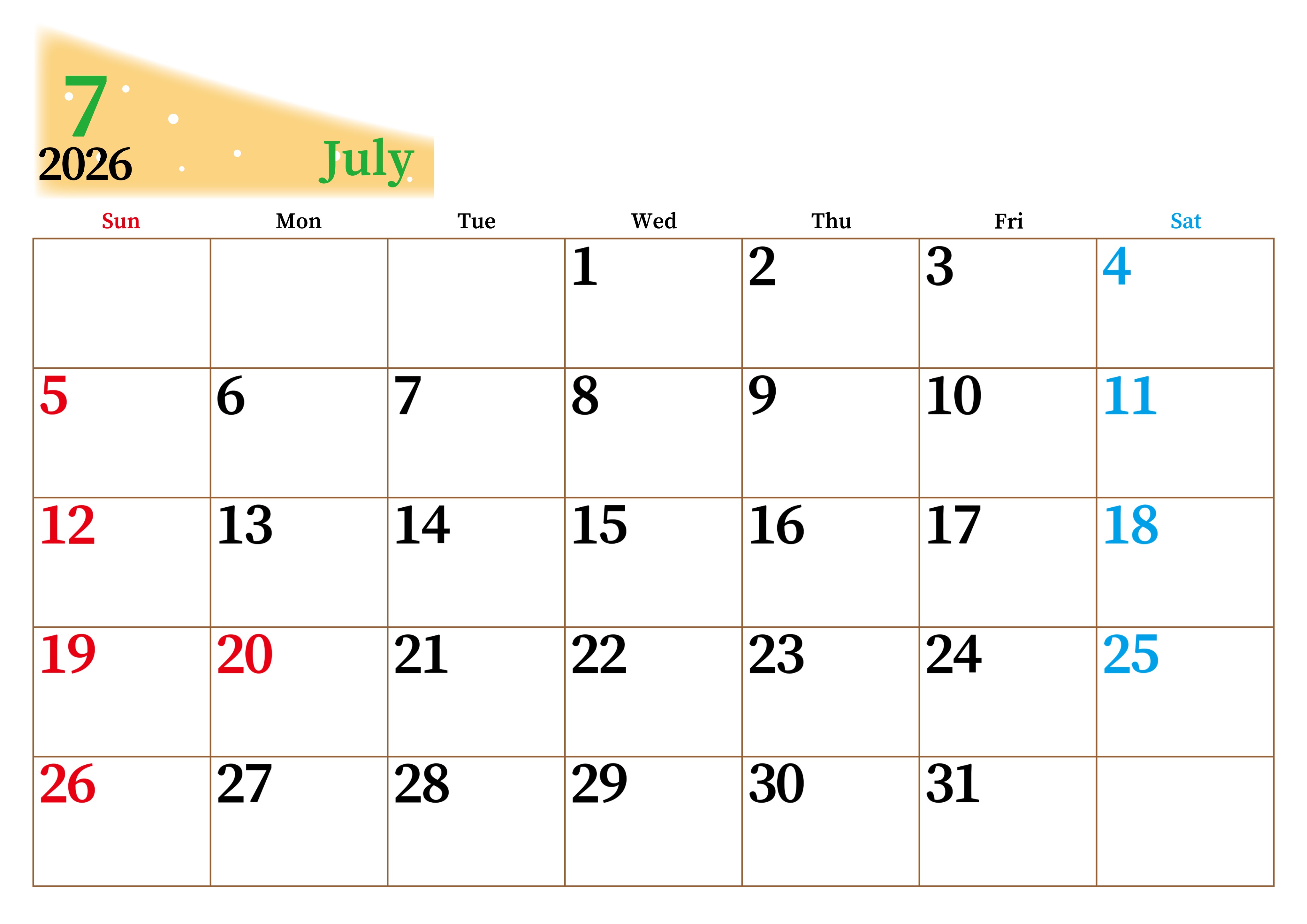 2026年7月横型日曜始まり 大きい文字が見やすく書き込みも楽なA4無料シンプルカレンダー(2026-01120700)