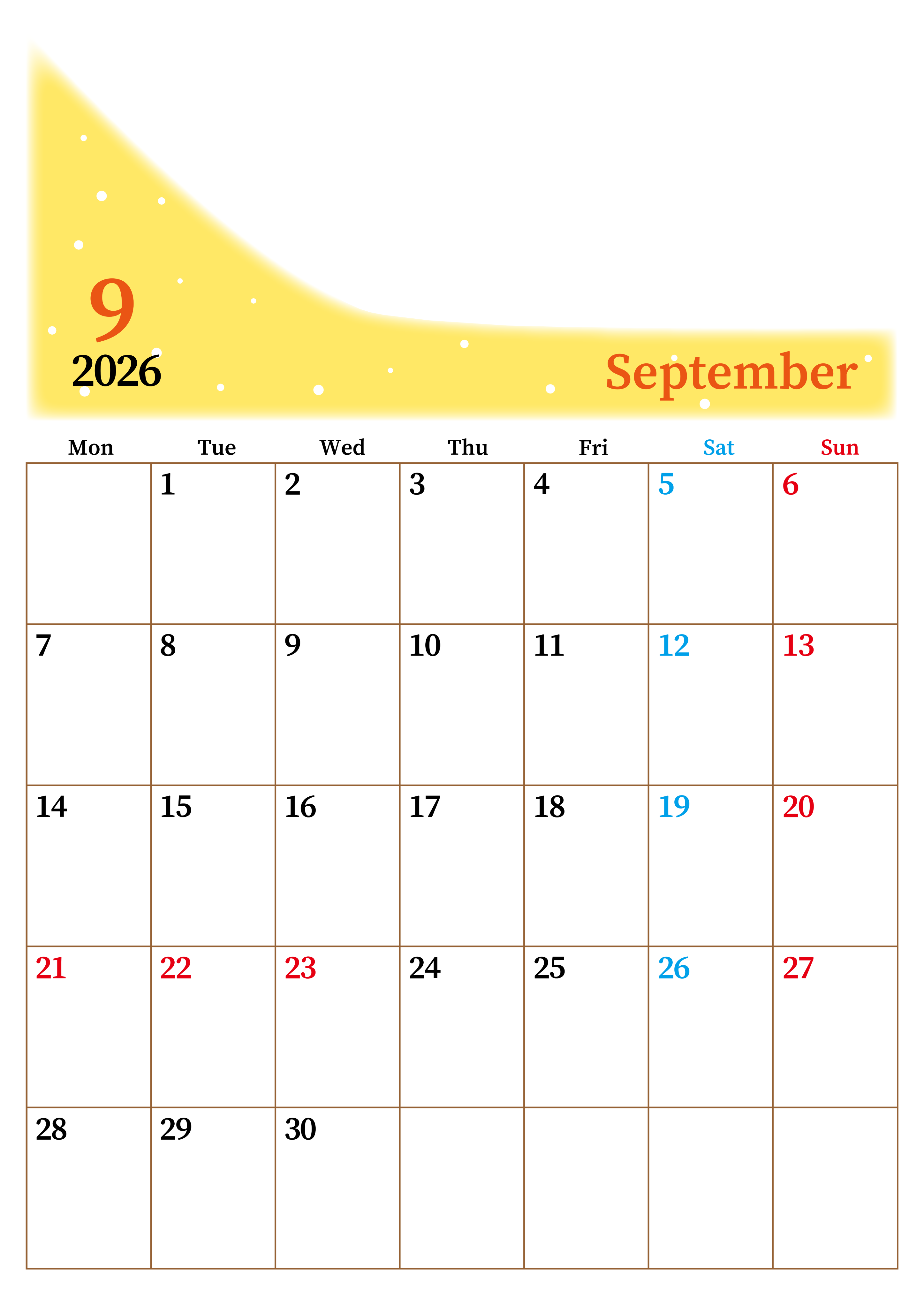 2026年・無料のカレンダーテンプレート 2026年9月縦型月曜始まり 大きい文字が見やすく書き込みも楽なA4無料シンプルカレンダー(2026-01120911) 素材状デザイン王 2025年4月8日 2026年9月縦型月曜始まりの大きい文字が見やすく書き込みも楽なA4無料シンプルカレンダーです。スケジュールの整理におすすめのフリー素材です。多忙なプランの可視化に役立ちます。(2026-01120911) シンプル 9月 縦型のカレンダー 月曜始まり カレンダーデザイン-0112