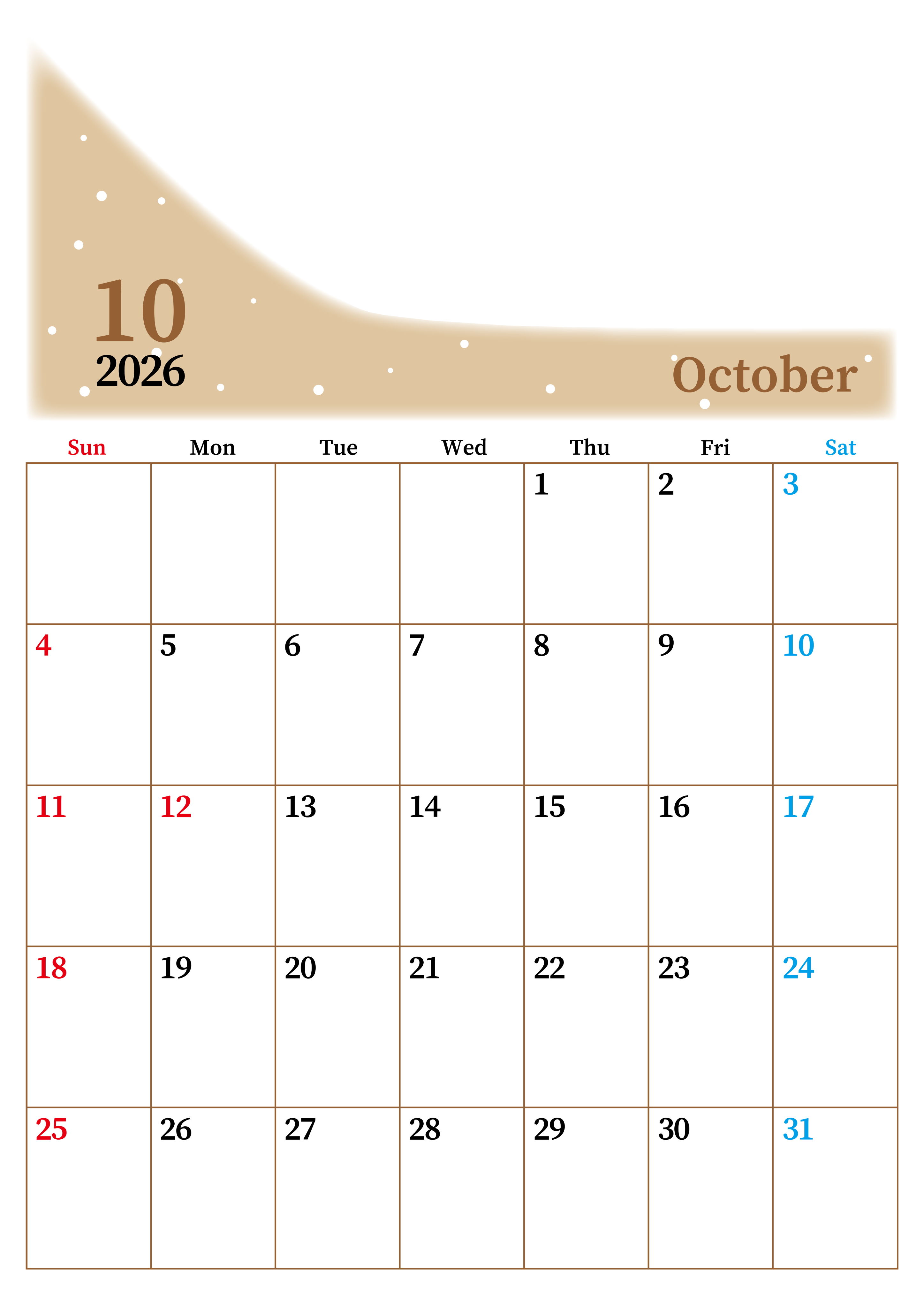 2026年・無料のカレンダーテンプレート 2026年10月縦型日曜始まり 大きい文字が見やすく書き込みも楽なA4無料シンプルカレンダー(2026-01121010) 素材状デザイン王 2025年4月8日 2026年10月縦型日曜始まりの大きい文字が見やすく書き込みも楽なA4無料シンプルカレンダーです。スケジュールの整理におすすめのフリー素材です。計画を効率的に立てましょう。(2026-01121010) シンプル 10月 縦型のカレンダー 日曜始まり カレンダーデザイン-0112