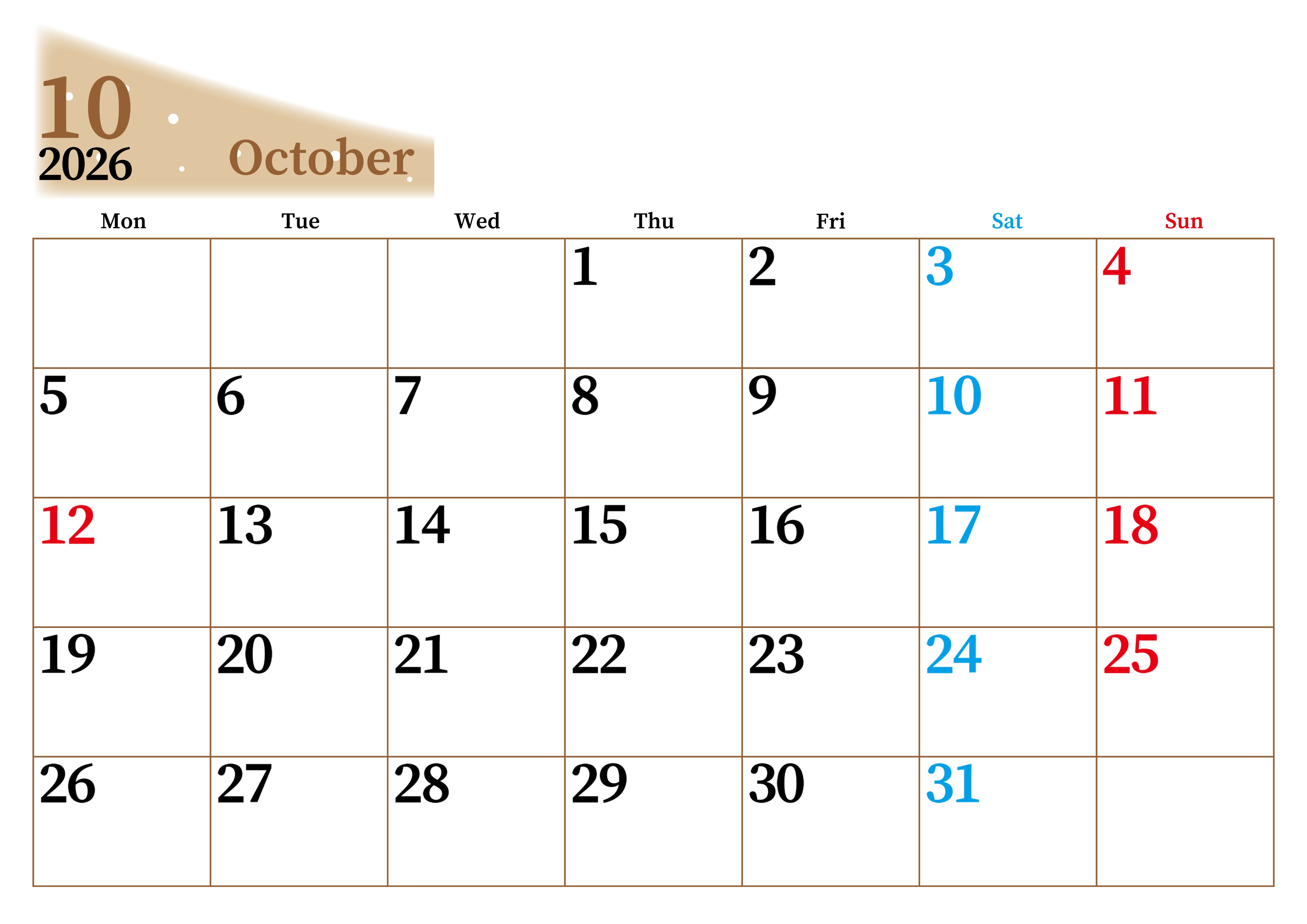 2026年・無料のカレンダーテンプレート 2026年10月横型月曜始まり 大きい文字が見やすく書き込みも楽なA4無料シンプルカレンダー(2026-01121001) 素材状デザイン王 2025年4月8日 2026年10月横型月曜始まりの大きい文字が見やすく書き込みも楽なA4無料シンプルカレンダーです。スケジュールの整理におすすめのフリー素材です。計画を効率的に立てましょう。(2026-01121001) シンプル 10月 横型のカレンダー 月曜始まり カレンダーデザイン-0112