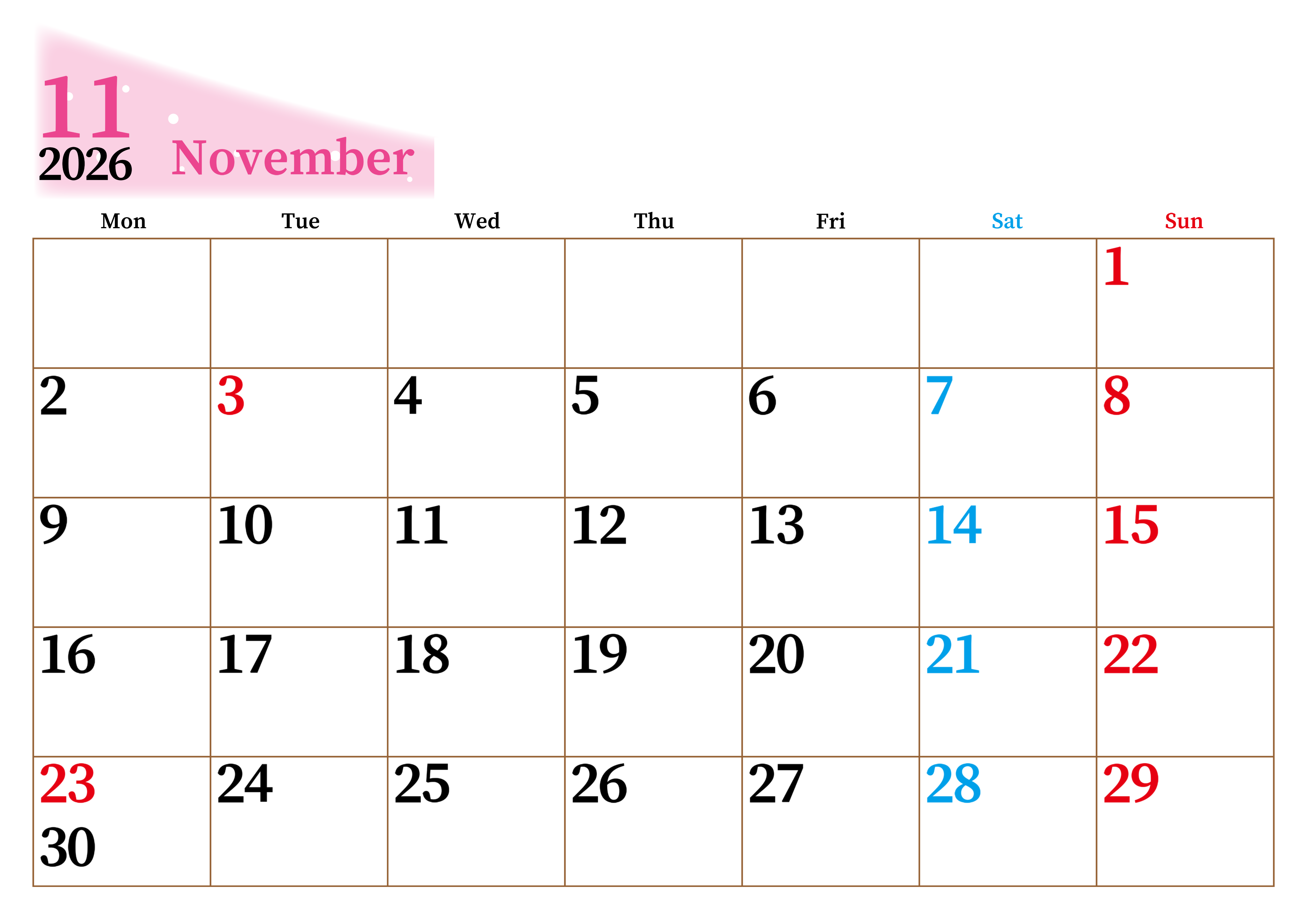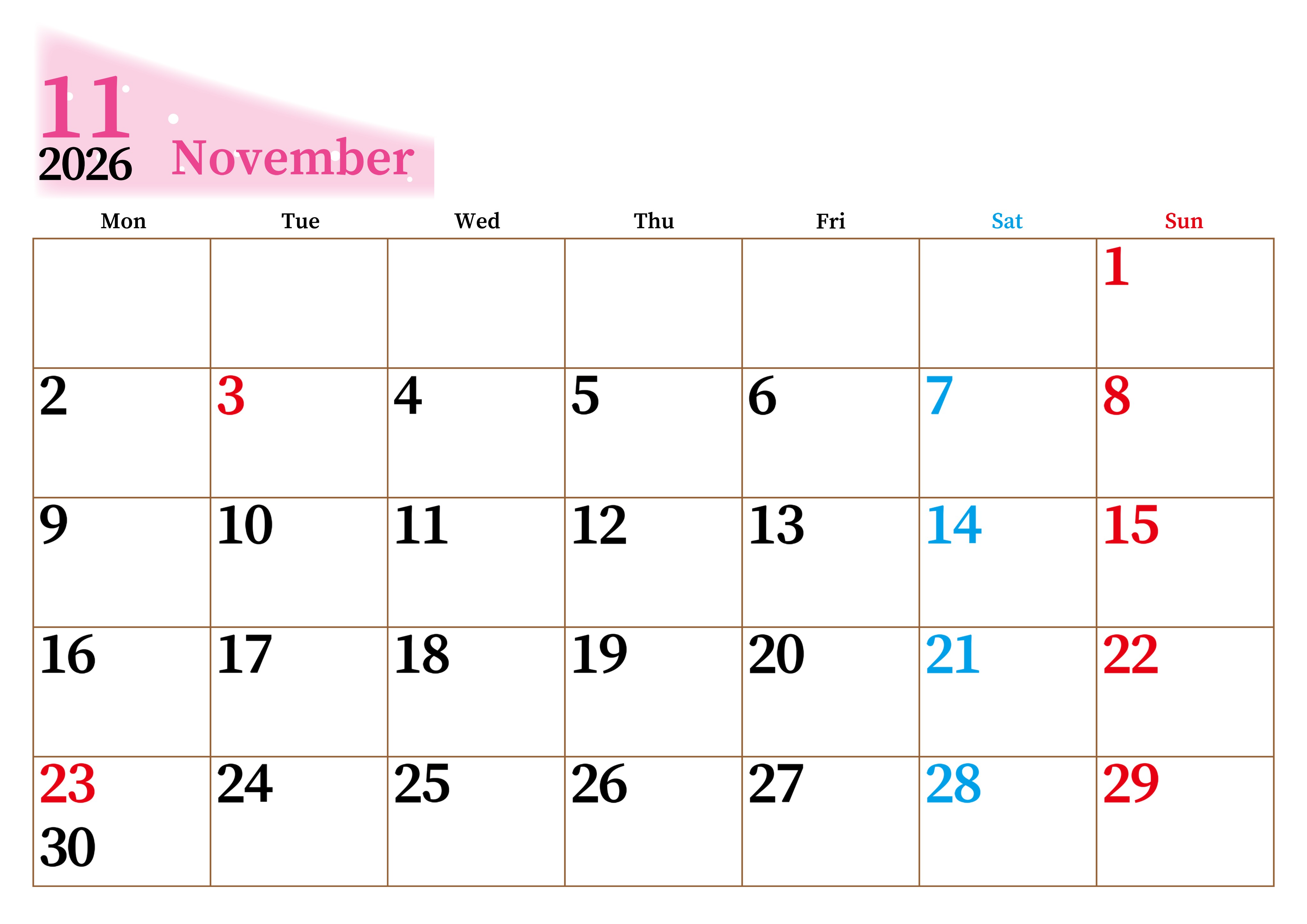 2026年・無料のカレンダーテンプレート 2026年11月横型月曜始まり 大きい文字が見やすく書き込みも楽なA4無料シンプルカレンダー(2026-01121101) 素材状デザイン王 2025年4月8日 2026年11月横型月曜始まりの大きい文字が見やすく書き込みも楽なA4無料シンプルカレンダーです。スケジュールの整理におすすめのフリー素材です。忙しいスケジュールを簡単にまとめて書き込みましょう。(2026-01121101) シンプル 11月 横型のカレンダー 月曜始まり カレンダーデザイン-0112