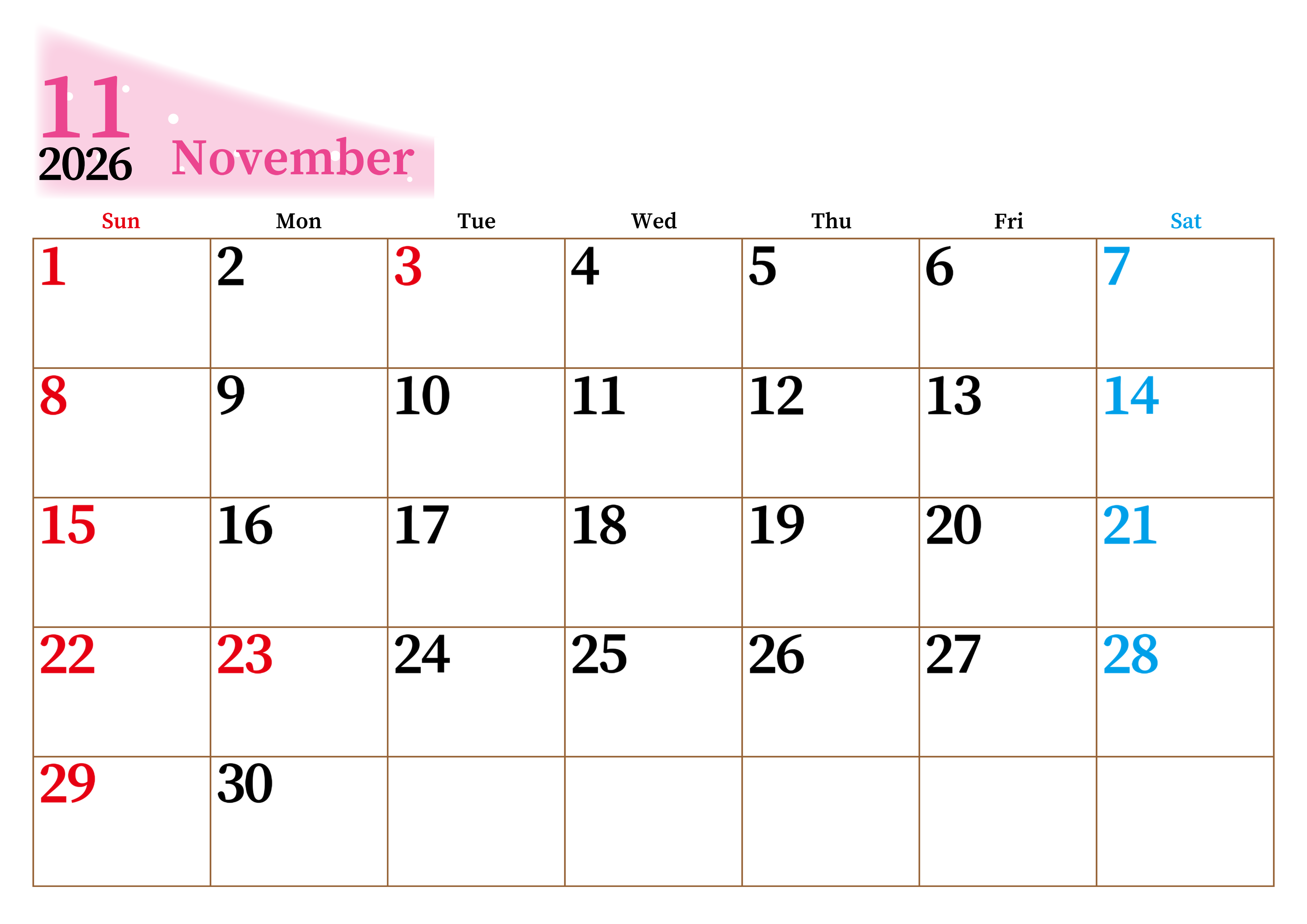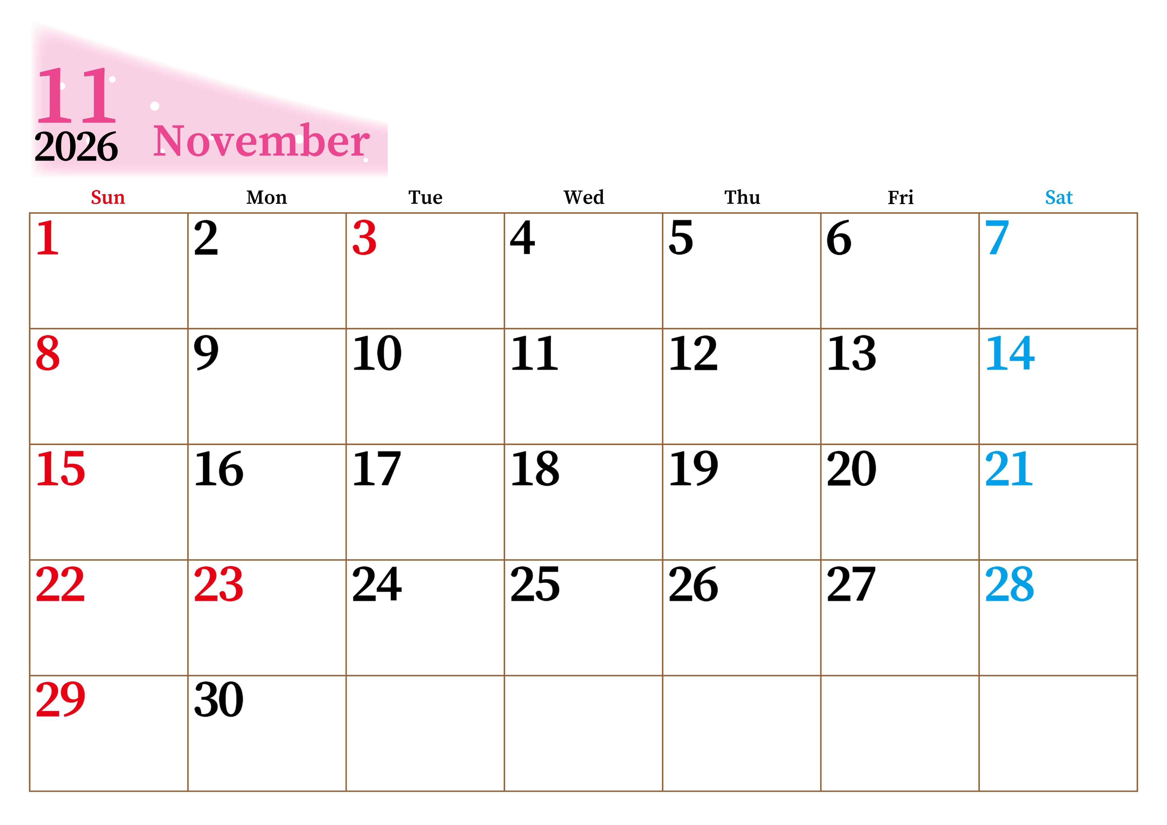 2026年・無料のカレンダーテンプレート 2026年11月横型日曜始まり 大きい文字が見やすく書き込みも楽なA4無料シンプルカレンダー(2026-01121100) 素材状デザイン王 2025年4月8日 2026年11月横型日曜始まりの大きい文字が見やすく書き込みも楽なA4無料シンプルカレンダーです。スケジュールの整理におすすめのフリー素材です。忙しいスケジュールを簡単にまとめて書き込みましょう。(2026-01121100) シンプル 11月 横型のカレンダー 日曜始まり カレンダーデザイン-0112