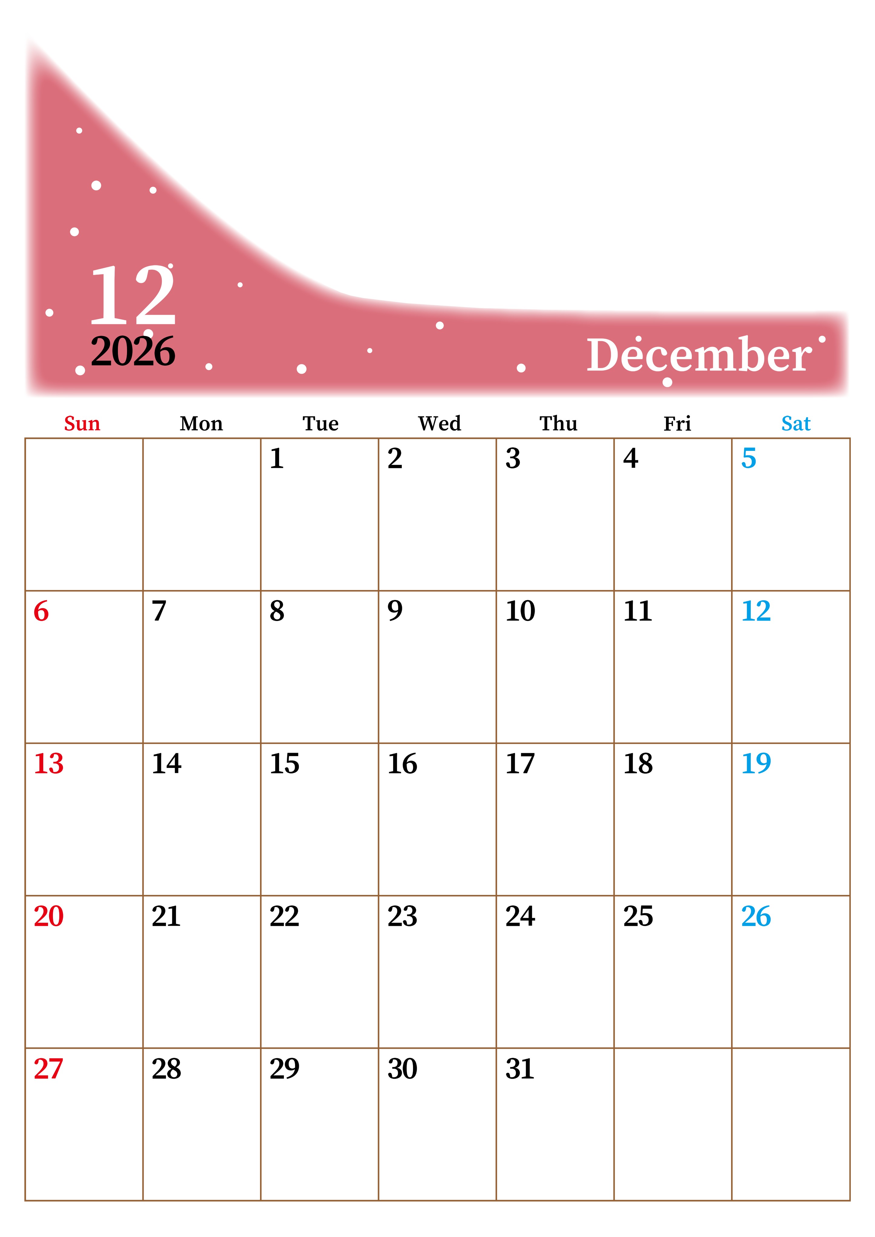 2026年12月縦型日曜始まりの大きい文字が見やすく書き込みも楽なA4無料シンプルカレンダーです。スケジュールの整理におすすめのフリー素材です。多忙なプランの可視化に役立ちます。(2026-01121210)