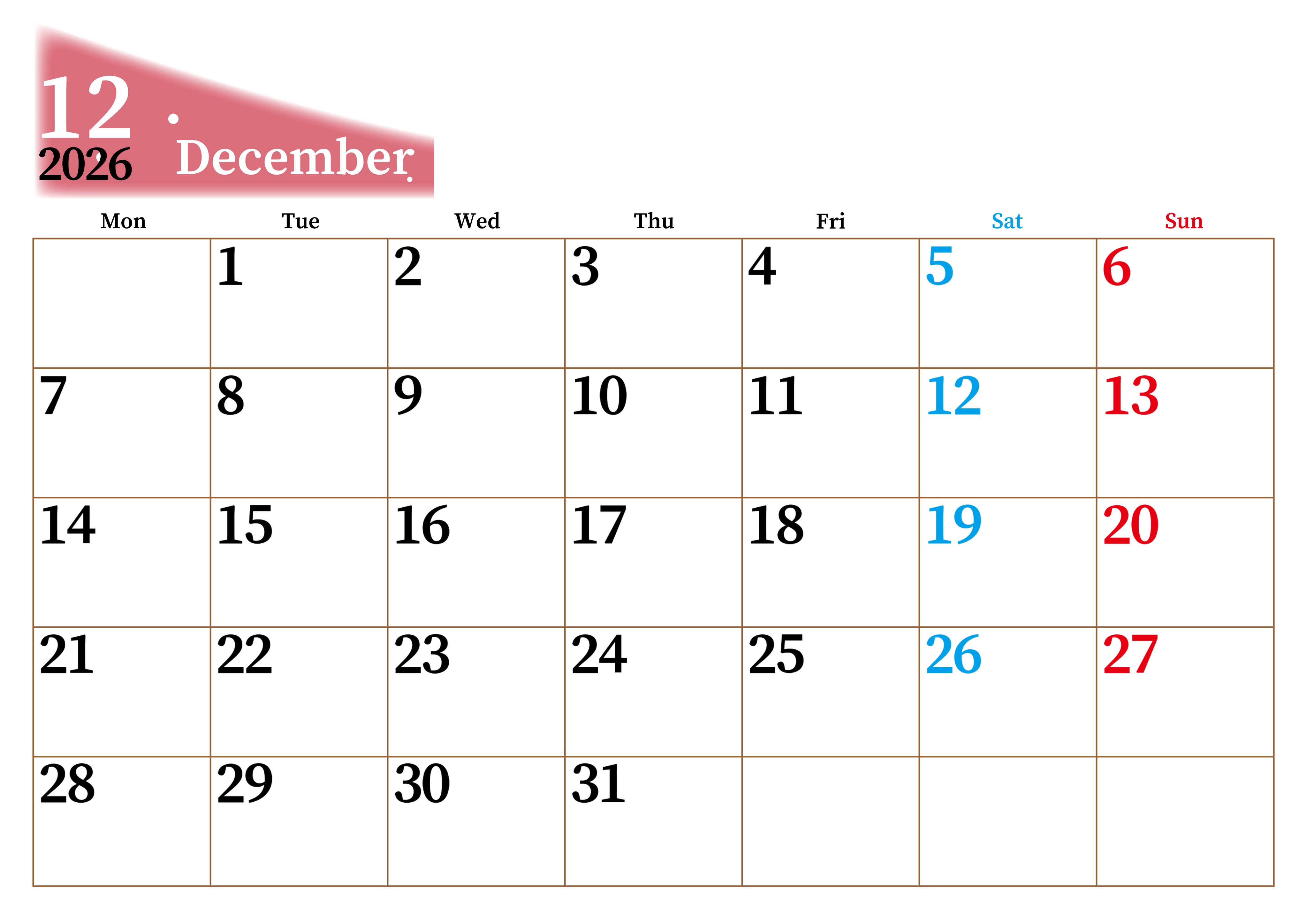 2026年・無料のカレンダーテンプレート 2026年12月横型月曜始まり 大きい文字が見やすく書き込みも楽なA4無料シンプルカレンダー(2026-01121201) 素材状デザイン王 2025年4月8日 2026年12月横型月曜始まりの大きい文字が見やすく書き込みも楽なA4無料シンプルカレンダーです。スケジュールの整理におすすめのフリー素材です。多忙なプランの可視化に役立ちます。(2026-01121201) シンプル 12月 横型のカレンダー 月曜始まり カレンダーデザイン-0112