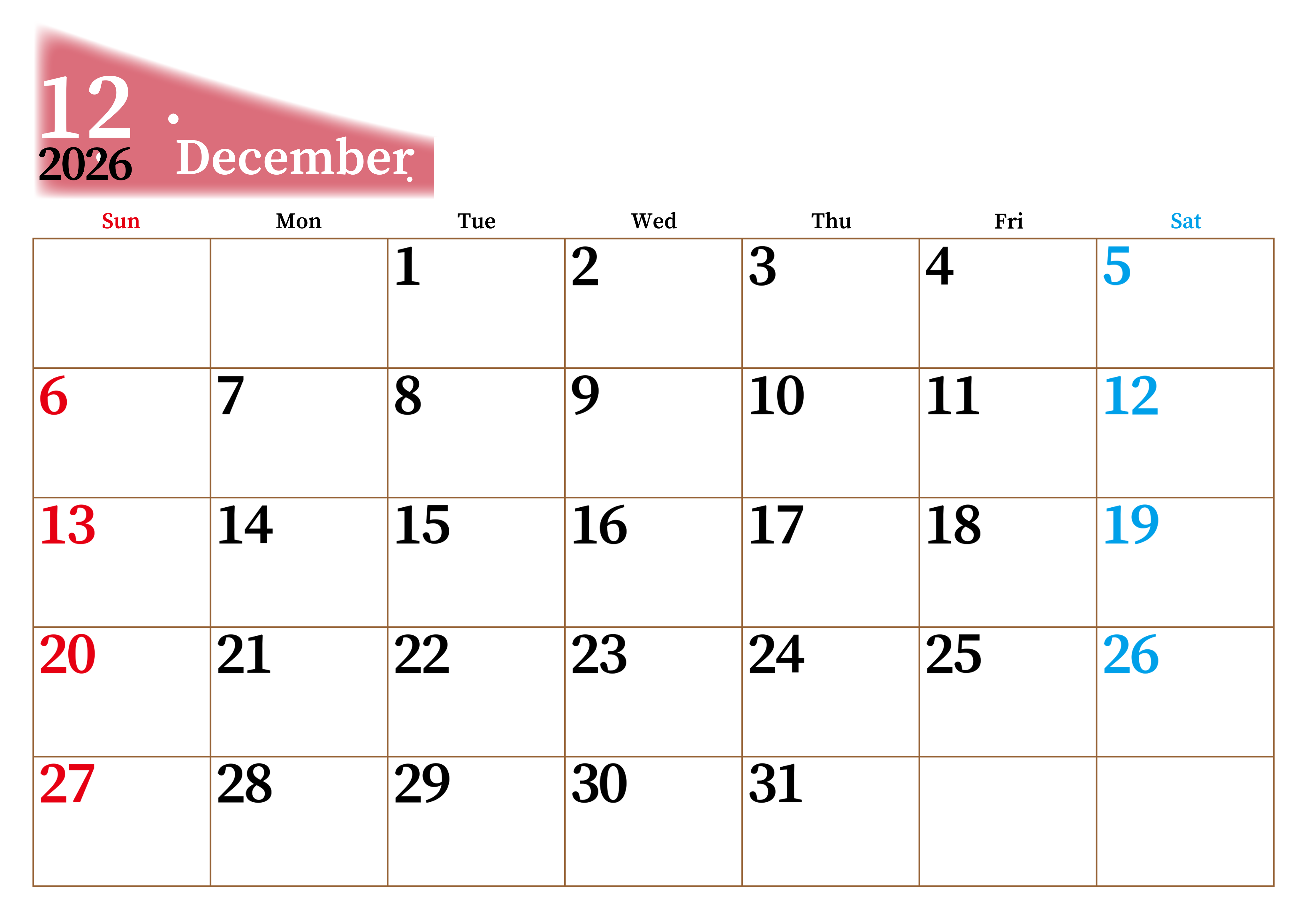 2026年・無料のカレンダーテンプレート 2026年12月横型日曜始まり 大きい文字が見やすく書き込みも楽なA4無料シンプルカレンダー(2026-01121200) 素材状デザイン王 2025年4月8日 2026年12月横型日曜始まりの大きい文字が見やすく書き込みも楽なA4無料シンプルカレンダーです。スケジュールの整理におすすめのフリー素材です。多忙なプランの可視化に役立ちます。(2026-01121200) シンプル 12月 横型のカレンダー 日曜始まり カレンダーデザイン-0112