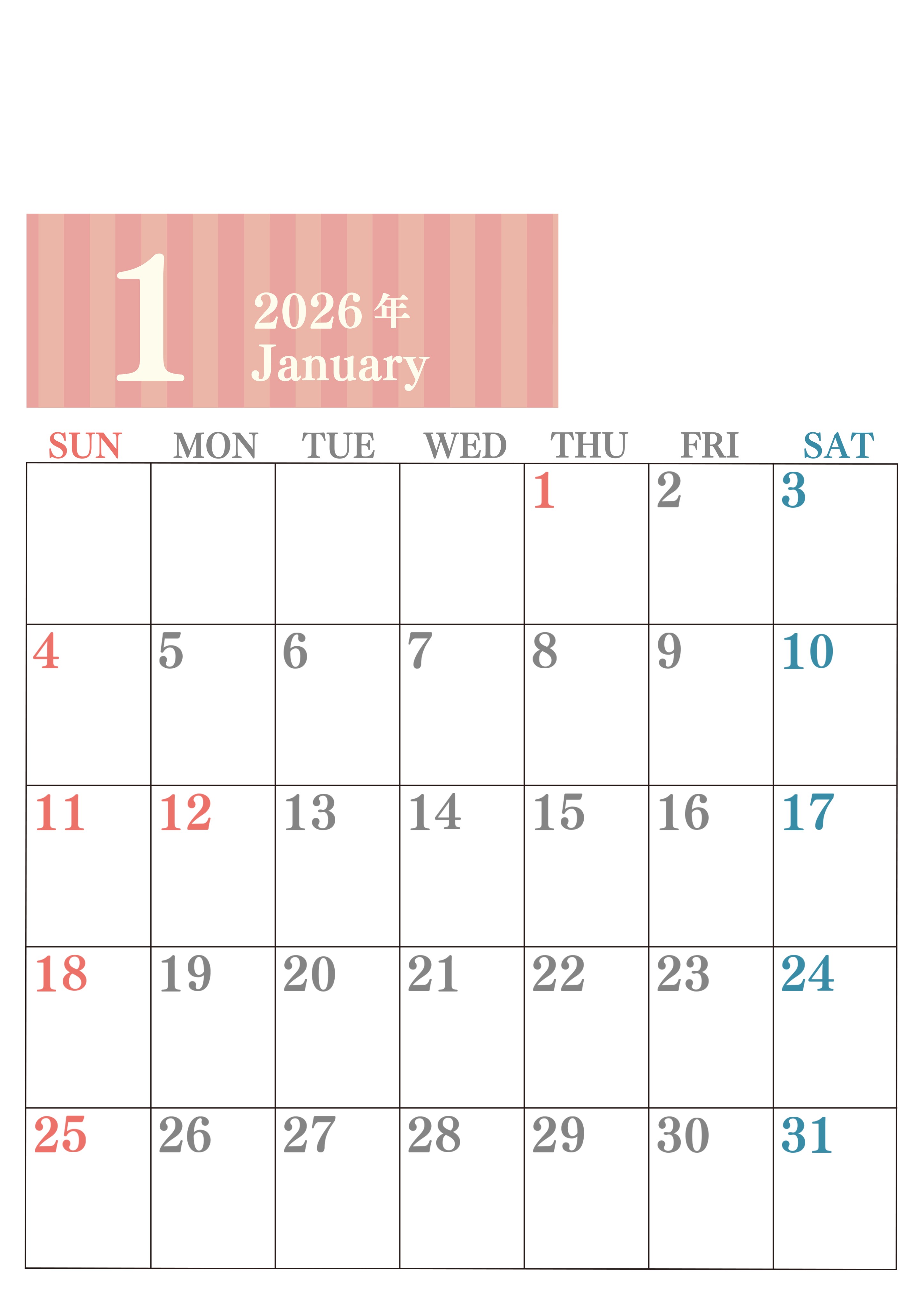 2026年・無料のカレンダーテンプレート 2026年1月縦型日曜始まり 書き込みしやすい文字が大きなA4無料シンプルなカレンダー(2026-01130110) 素材状デザイン王 2025年4月8日 2026年1月縦型日曜始まりの書き込みしやすい文字が大きなA4無料シンプルなカレンダーです。見やすいのでダウンロード利用をおすすめします。計画を立てるのに最適です。(2026-01130110) シンプル 1月 縦型のカレンダー 日曜始まり カレンダーデザイン-0113