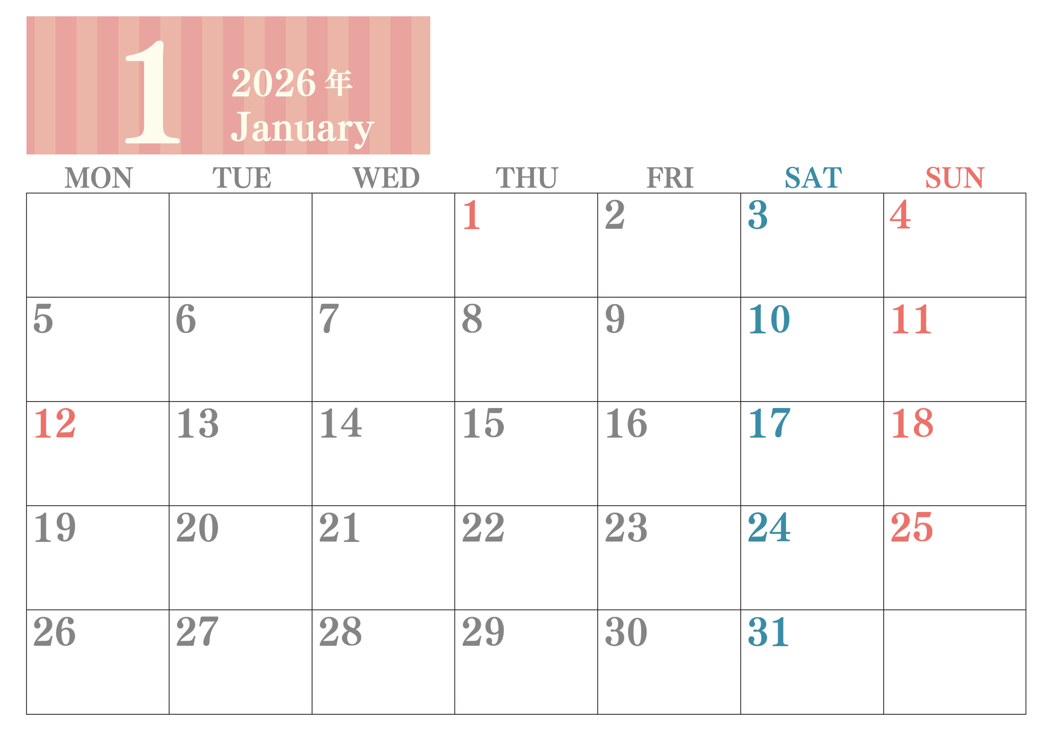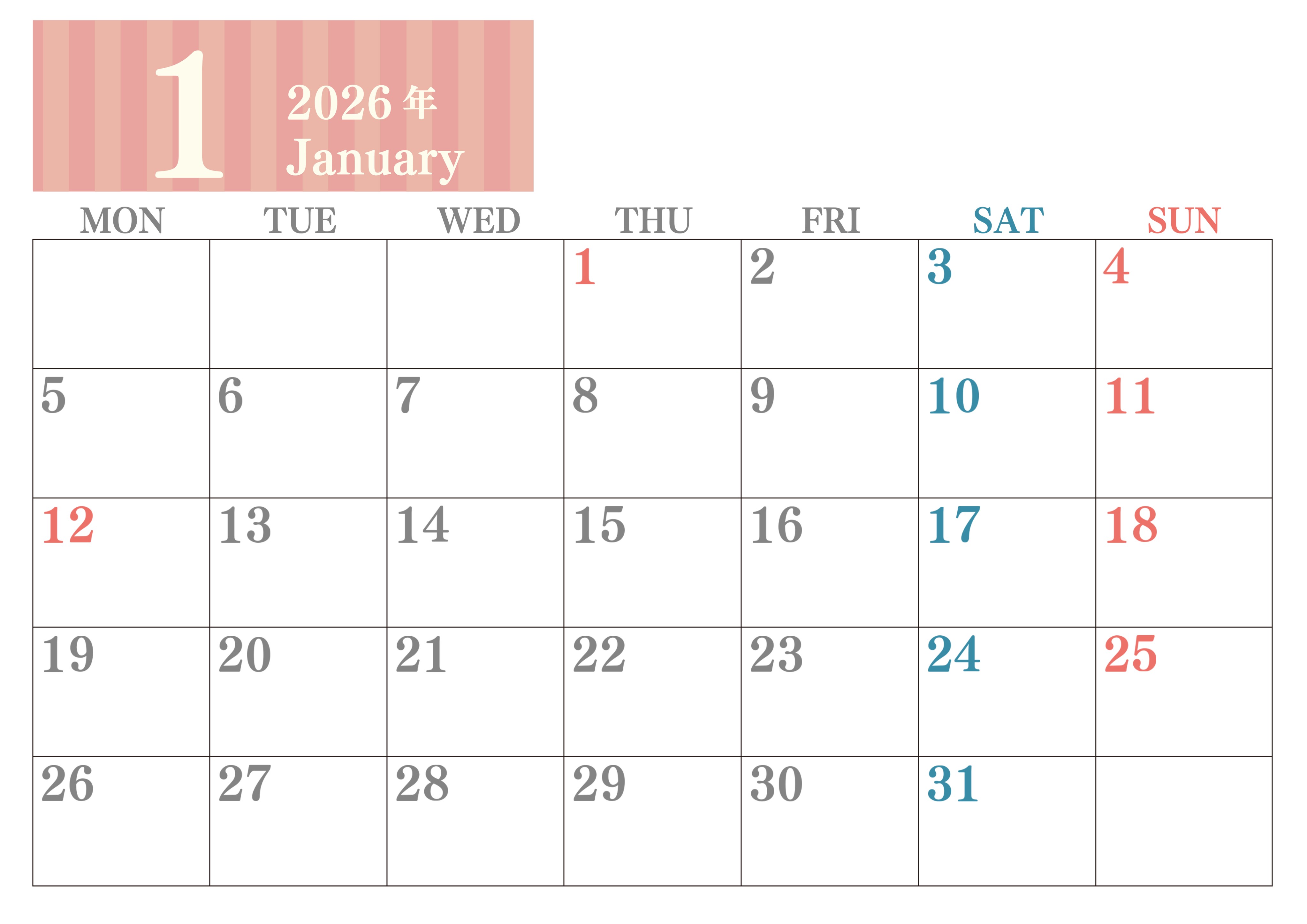 2026年・無料のカレンダーテンプレート 2026年1月横型月曜始まり 書き込みしやすい文字が大きなA4無料シンプルなカレンダー(2026-01130101) 素材状デザイン王 2025年4月8日 2026年1月横型月曜始まりの書き込みしやすい文字が大きなA4無料シンプルなカレンダーです。見やすいのでダウンロード利用をおすすめします。計画を立てるのに最適です。(2026-01130101) シンプル 1月 横型のカレンダー 月曜始まり カレンダーデザイン-0113