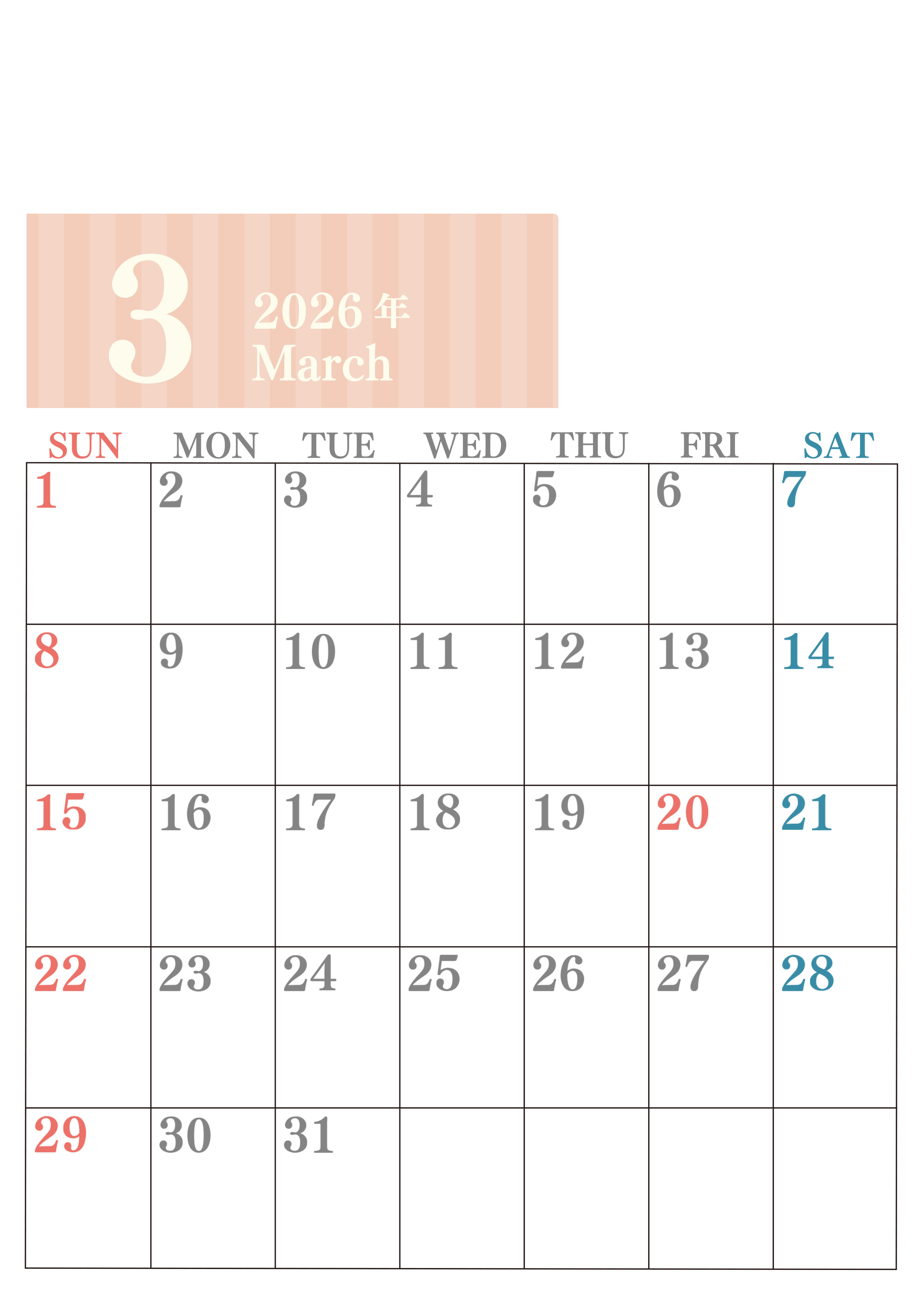 2026年・無料のカレンダーテンプレート 2026年3月縦型日曜始まり 書き込みしやすい文字が大きなA4無料シンプルなカレンダー(2026-01130310) 素材状デザイン王 2025年4月8日 2026年3月縦型日曜始まりの書き込みしやすい文字が大きなA4無料シンプルなカレンダーです。見やすいのでダウンロード利用をおすすめします。プランの整理にぴったりです。(2026-01130310) シンプル 3月 縦型のカレンダー 日曜始まり カレンダーデザイン-0113
