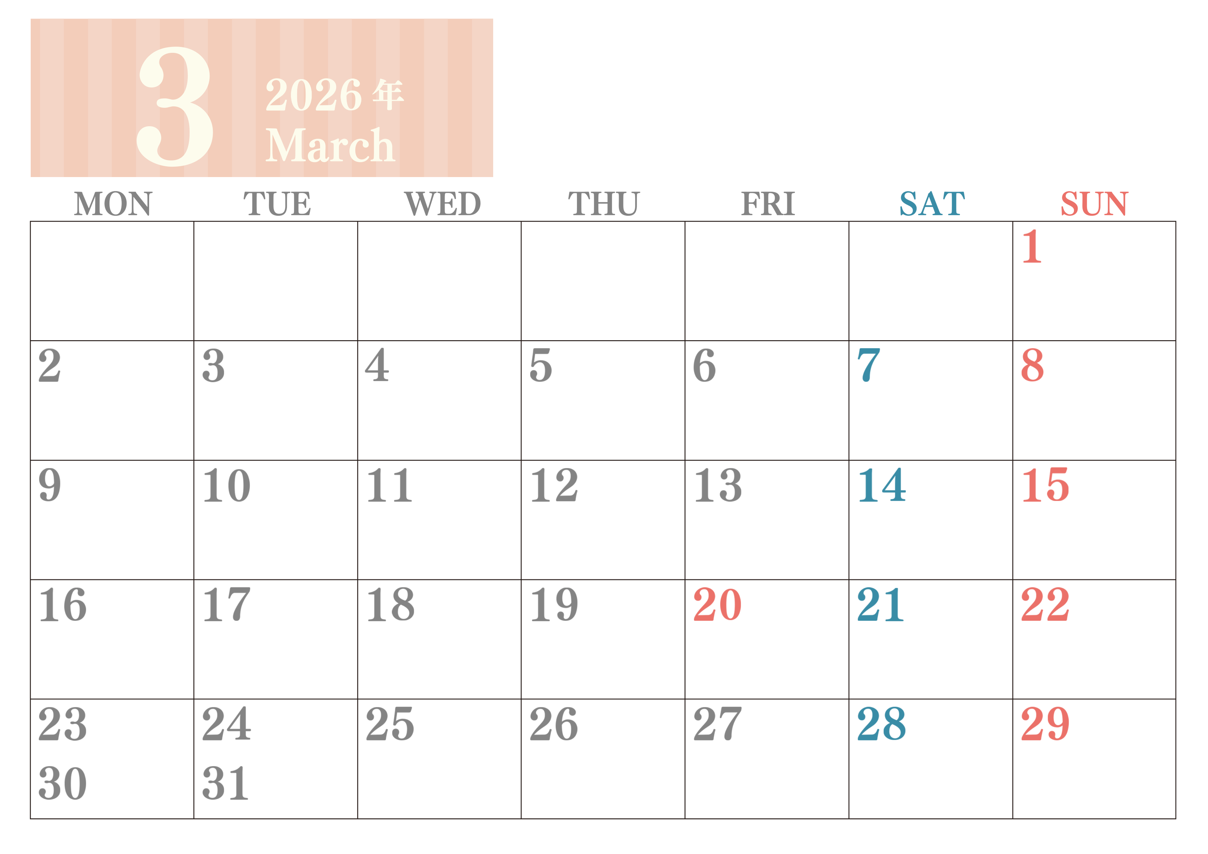 2026年・無料のカレンダーテンプレート 2026年3月横型月曜始まり 書き込みしやすい文字が大きなA4無料シンプルなカレンダー(2026-01130301) 素材状デザイン王 2025年4月8日 2026年3月横型月曜始まりの書き込みしやすい文字が大きなA4無料シンプルなカレンダーです。見やすいのでダウンロード利用をおすすめします。プランの整理にぴったりです。(2026-01130301) シンプル 3月 横型のカレンダー 月曜始まり カレンダーデザイン-0113