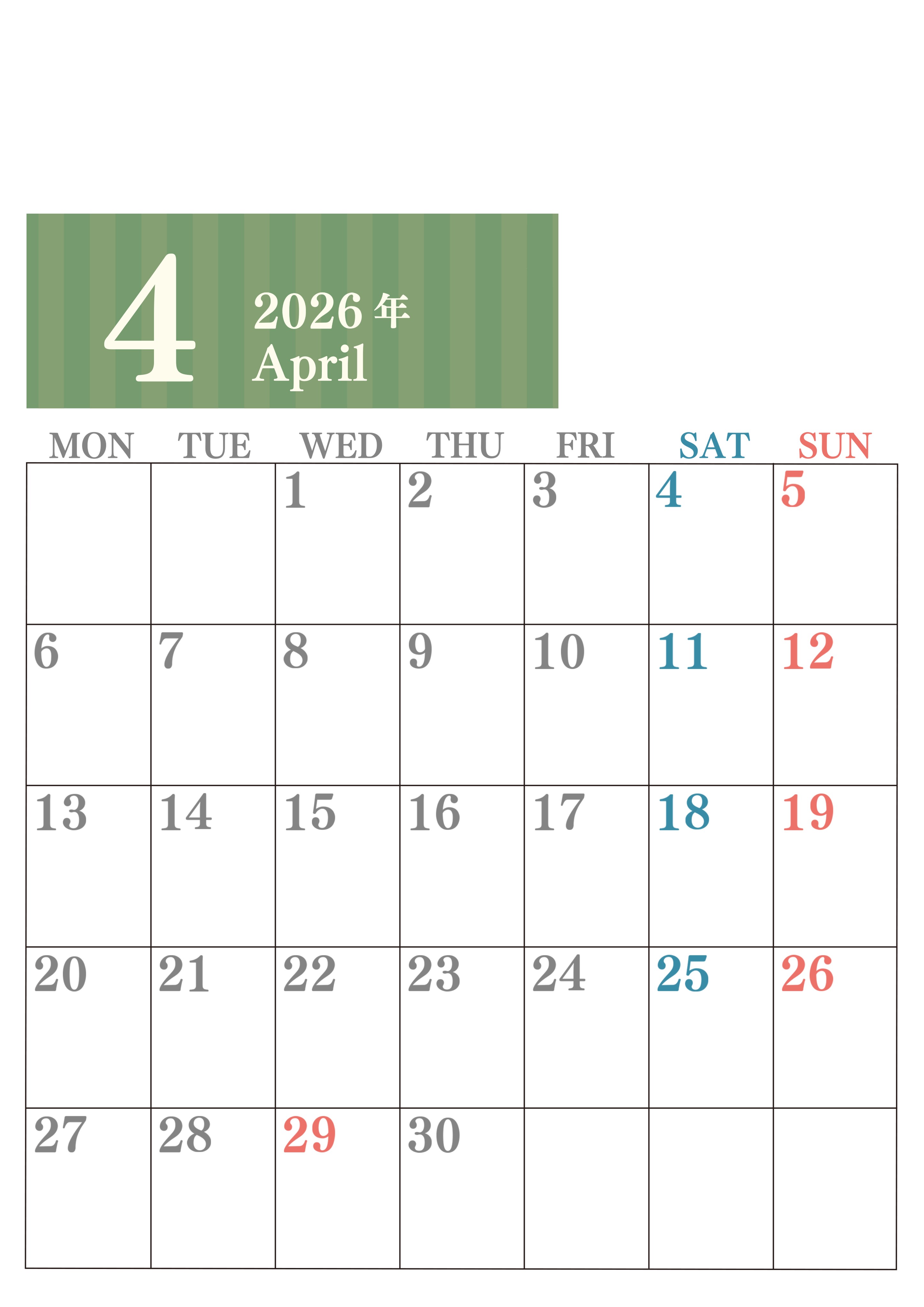 2026年4月縦型月曜始まりの書き込みしやすい文字が大きなA4無料シンプルなカレンダーです。見やすいのでダウンロード利用をおすすめします。計画を立てるのに最適です。(2026-01130411)