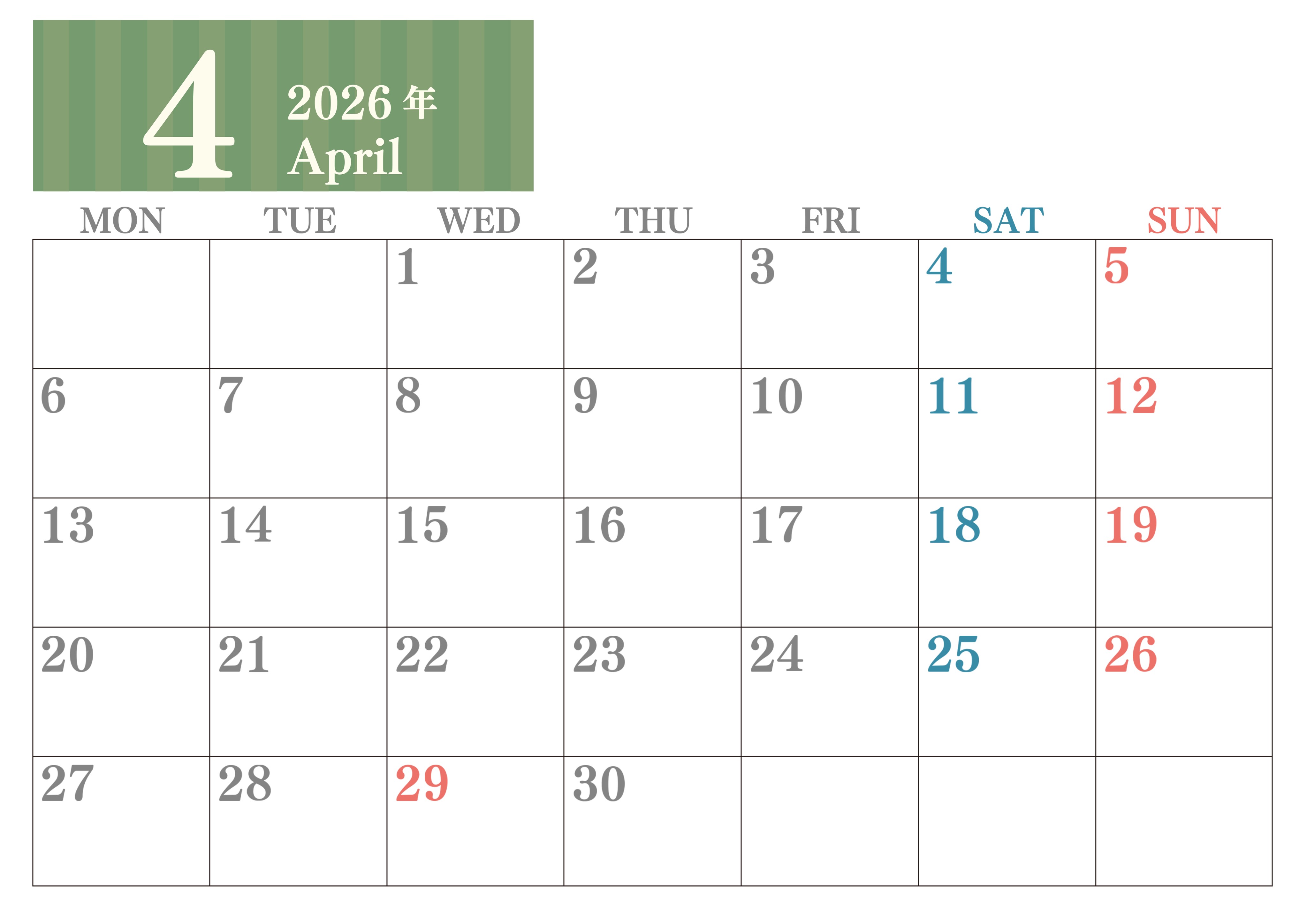 2026年4月横型月曜始まり 書き込みしやすい文字が大きなA4無料シンプルなカレンダー(2026-01130401)