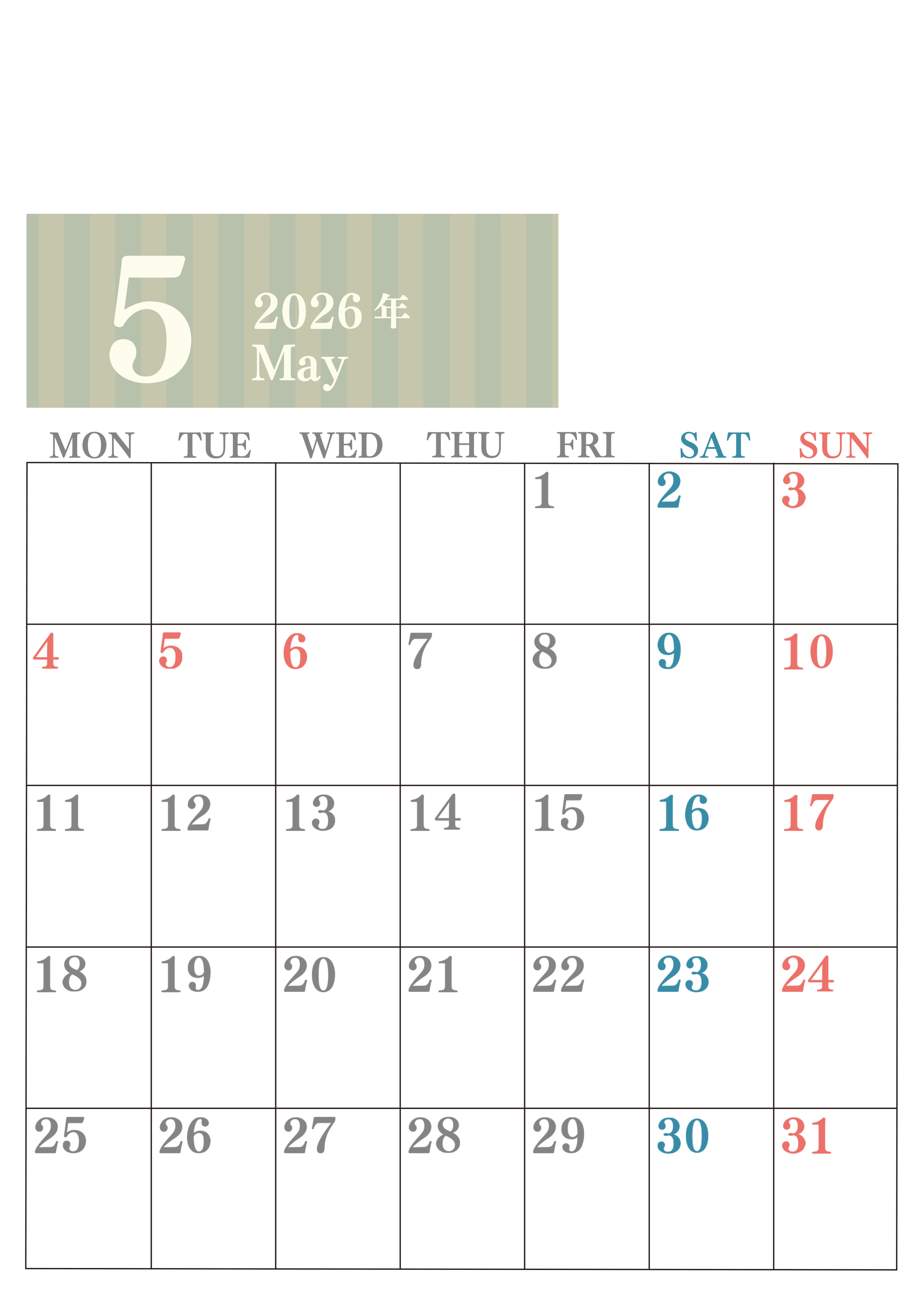 2026年・無料のカレンダーテンプレート 2026年5月縦型月曜始まり 書き込みしやすい文字が大きなA4無料シンプルなカレンダー(2026-01130511) 素材状デザイン王 2025年4月8日 2026年5月縦型月曜始まりの書き込みしやすい文字が大きなA4無料シンプルなカレンダーです。見やすいのでダウンロード利用をおすすめします。スケジュールを管理しやすいです。(2026-01130511) シンプル 5月 縦型のカレンダー 月曜始まり カレンダーデザイン-0113