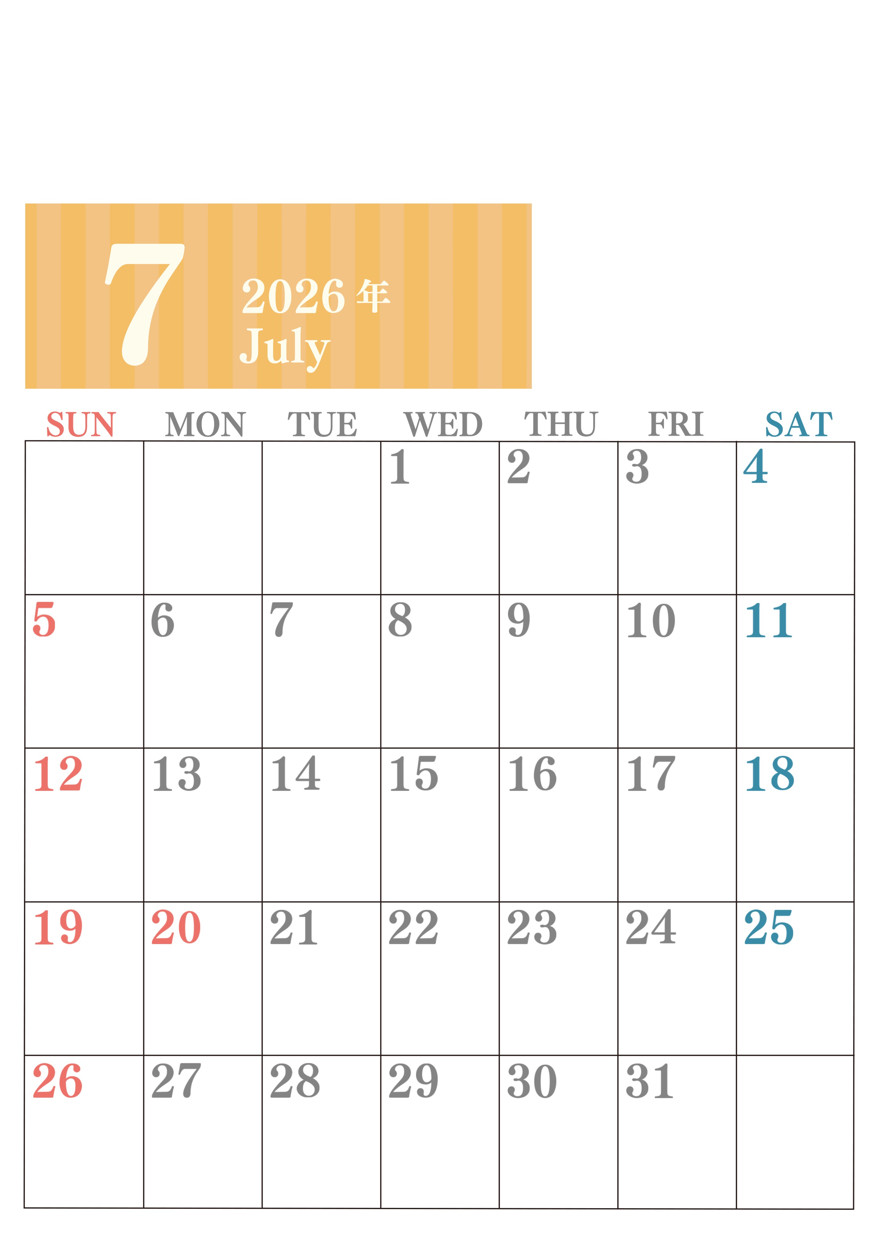 2026年・無料のカレンダーテンプレート 2026年7月縦型日曜始まり 書き込みしやすい文字が大きなA4無料シンプルなカレンダー(2026-01130710) 素材状デザイン王 2025年4月8日 2026年7月縦型日曜始まりの書き込みしやすい文字が大きなA4無料シンプルなカレンダーです。見やすいのでダウンロード利用をおすすめします。計画を立てるのに最適です。(2026-01130710) シンプル 7月 縦型のカレンダー 日曜始まり カレンダーデザイン-0113