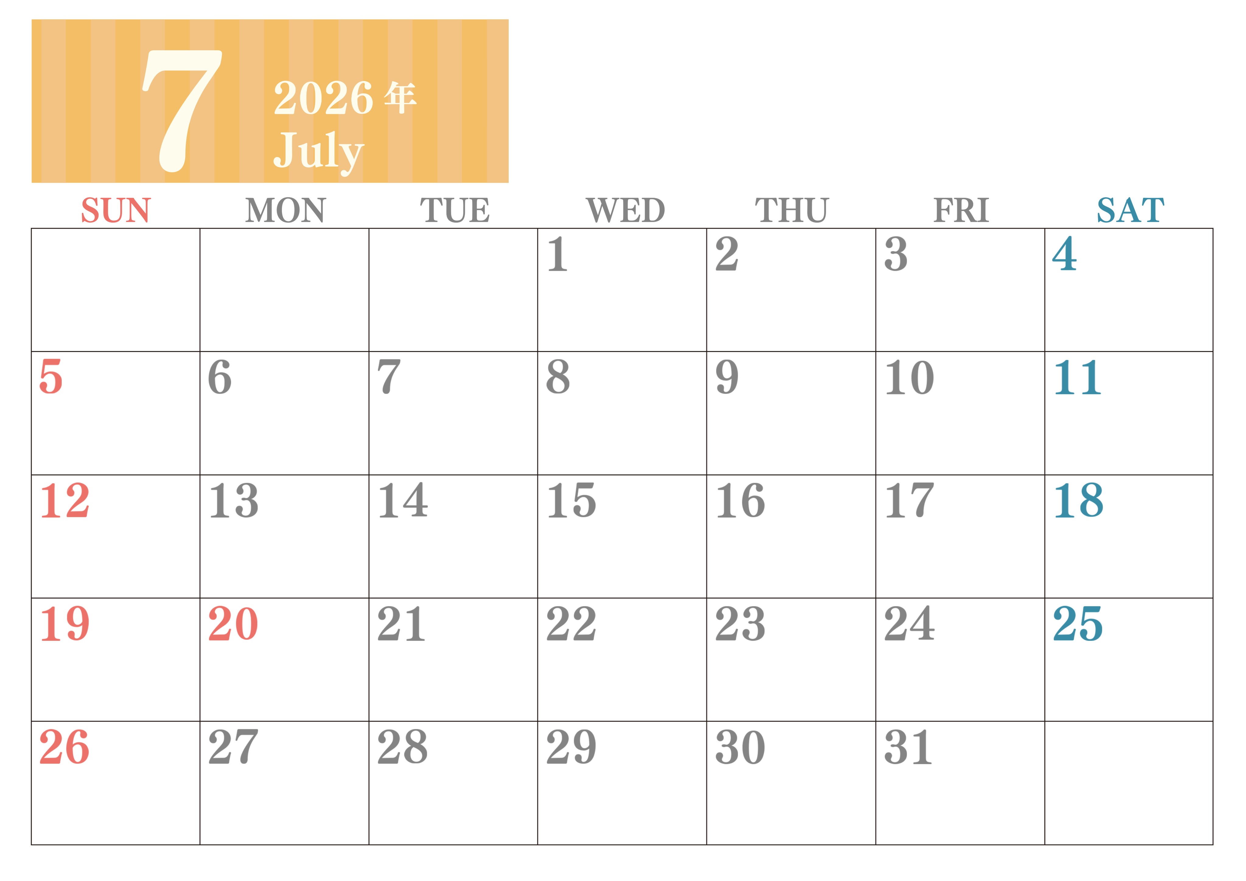 2026年7月横型日曜始まり 書き込みしやすい文字が大きなA4無料シンプルなカレンダー(2026-01130700)
