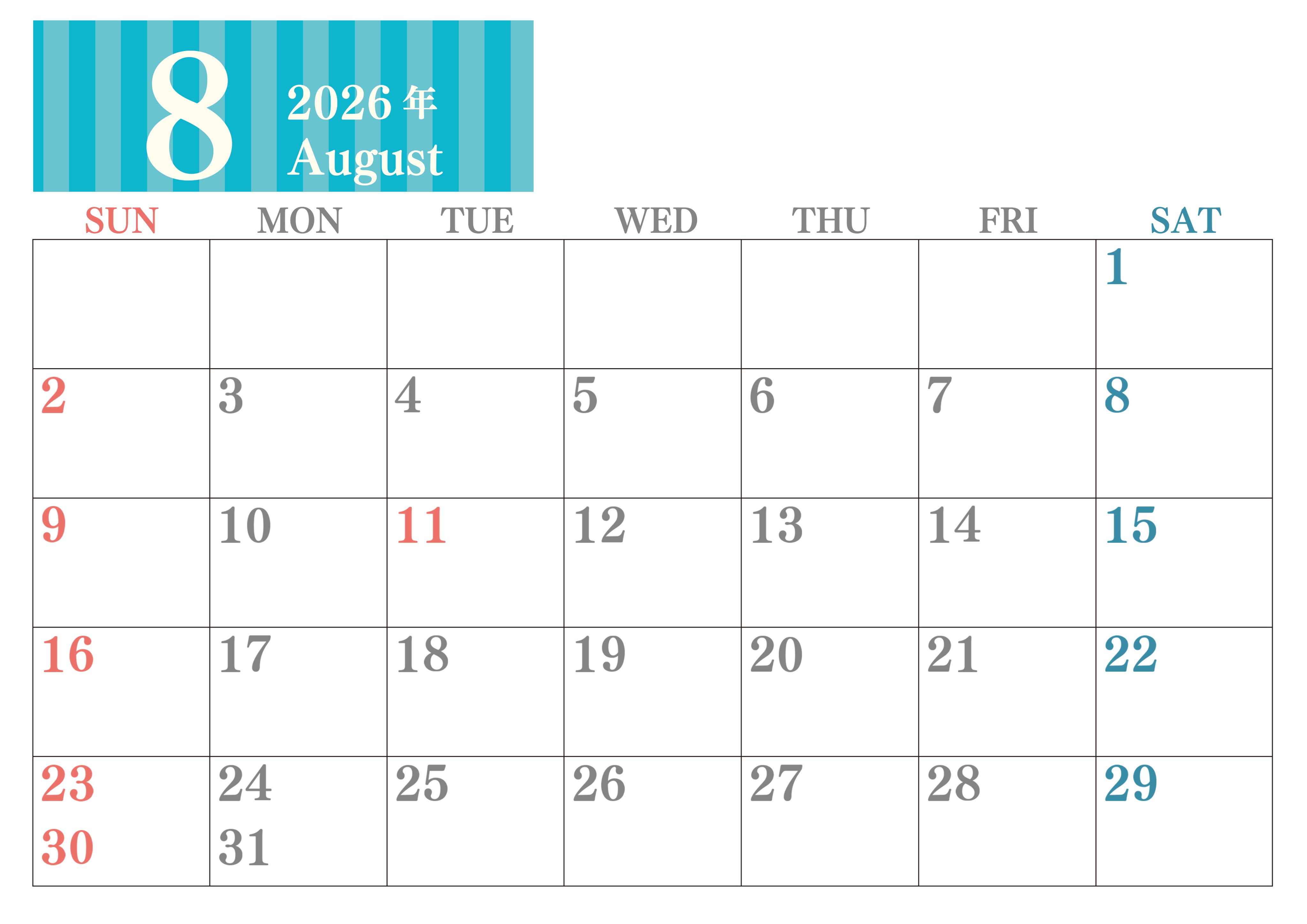 2026年・無料のカレンダーテンプレート 2026年8月横型日曜始まり 書き込みしやすい文字が大きなA4無料シンプルなカレンダー(2026-01130800) 素材状デザイン王 2025年4月8日 2026年8月横型日曜始まりの書き込みしやすい文字が大きなA4無料シンプルなカレンダーです。見やすいのでダウンロード利用をおすすめします。スケジュールを管理しやすいです。(2026-01130800) シンプル 8月 横型のカレンダー 日曜始まり カレンダーデザイン-0113