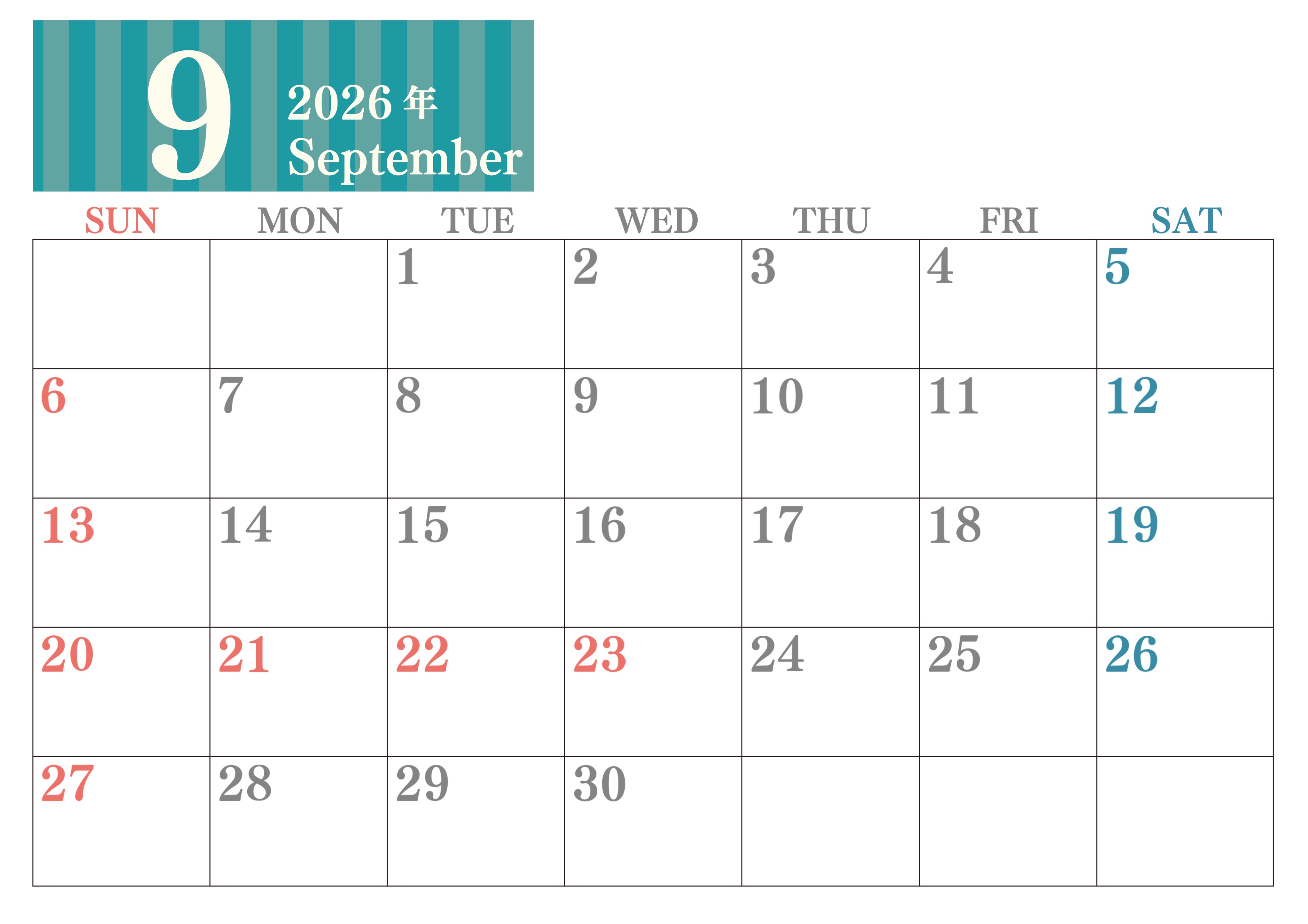 2026年9月横型日曜始まり 書き込みしやすい文字が大きなA4無料シンプルなカレンダー(2026-01130900)