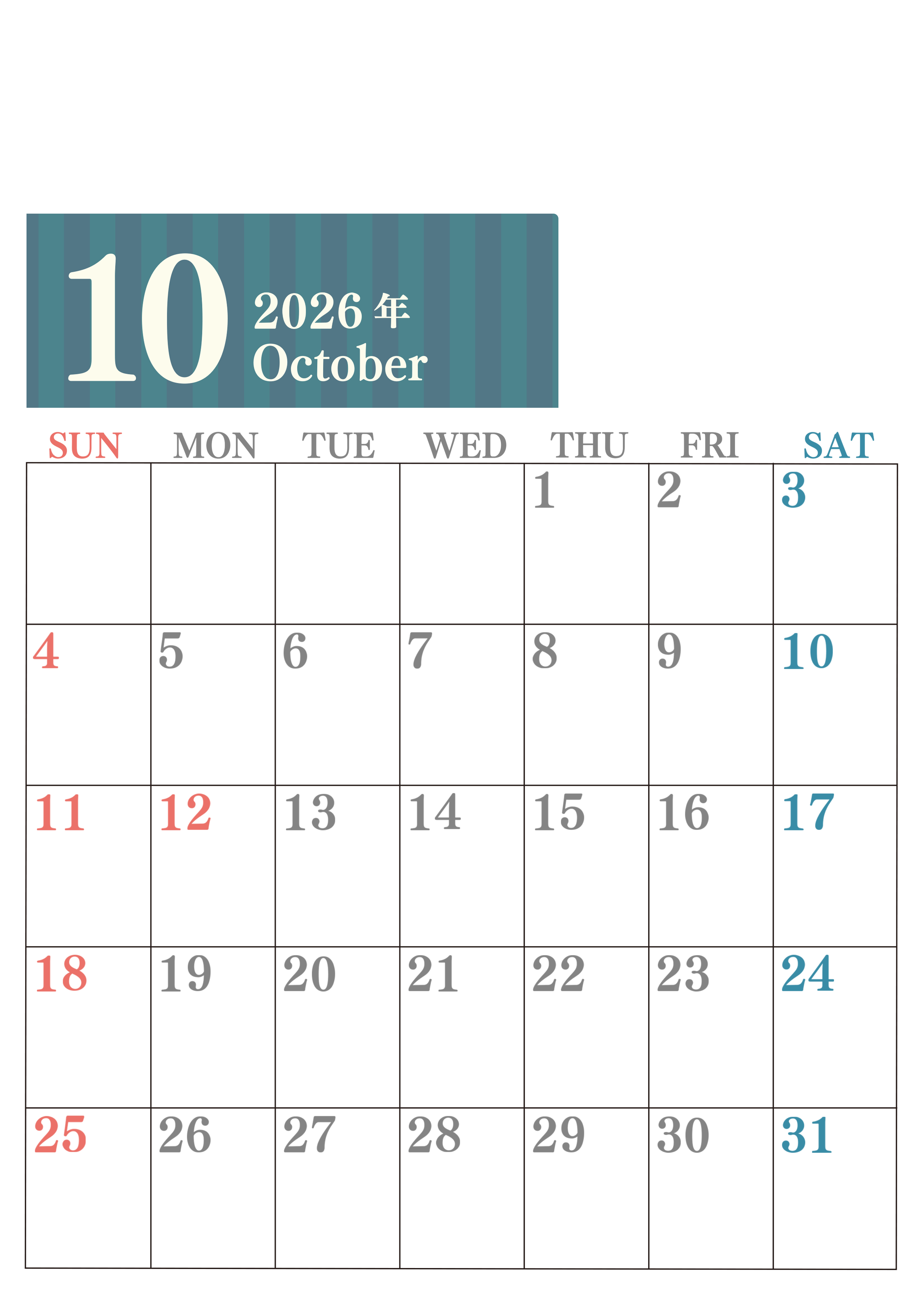 2026年・無料のカレンダーテンプレート 2026年10月縦型日曜始まり 書き込みしやすい文字が大きなA4無料シンプルなカレンダー(2026-01131010) 素材状デザイン王 2025年4月8日 2026年10月縦型日曜始まりの書き込みしやすい文字が大きなA4無料シンプルなカレンダーです。見やすいのでダウンロード利用をおすすめします。計画を立てるのに最適です。(2026-01131010) シンプル 10月 縦型のカレンダー 日曜始まり カレンダーデザイン-0113