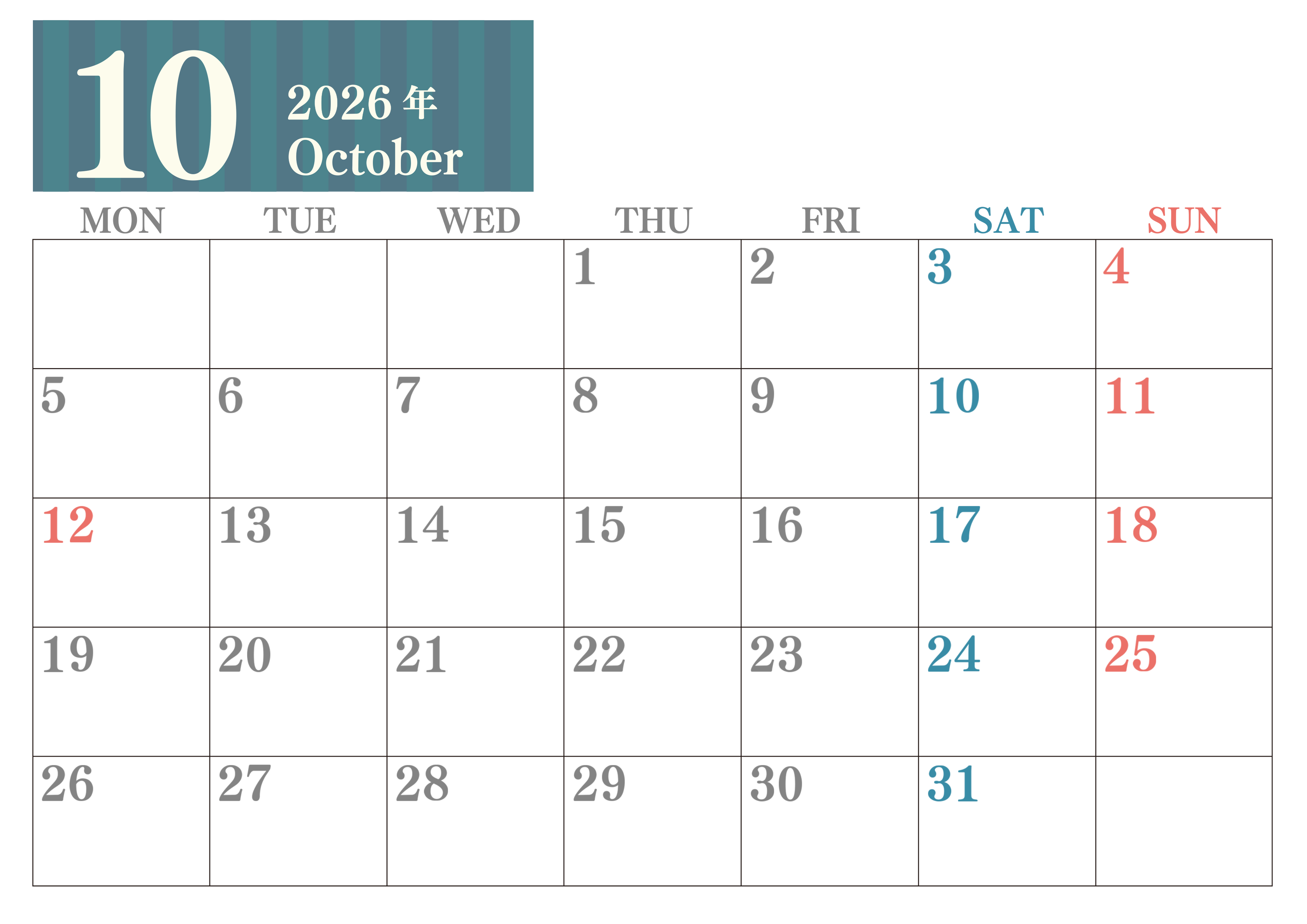 2026年・無料のカレンダーテンプレート 2026年10月横型月曜始まり 書き込みしやすい文字が大きなA4無料シンプルなカレンダー(2026-01131001) 素材状デザイン王 2025年4月8日 2026年10月横型月曜始まりの書き込みしやすい文字が大きなA4無料シンプルなカレンダーです。見やすいのでダウンロード利用をおすすめします。計画を立てるのに最適です。(2026-01131001) シンプル 10月 横型のカレンダー 月曜始まり カレンダーデザイン-0113