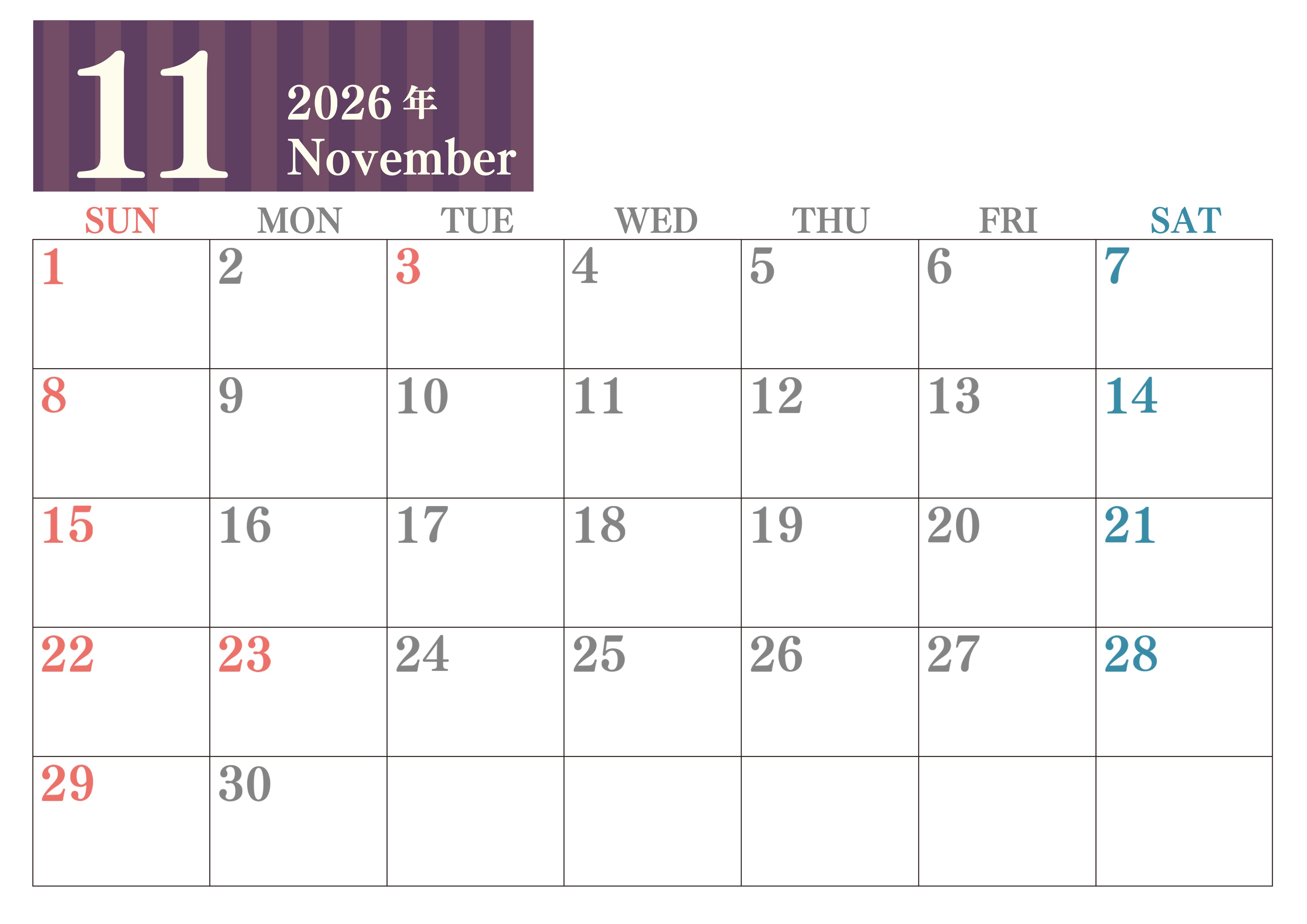 2026年・無料のカレンダーテンプレート 2026年11月横型日曜始まり 書き込みしやすい文字が大きなA4無料シンプルなカレンダー(2026-01131100) 素材状デザイン王 2025年4月8日 2026年11月横型日曜始まりの書き込みしやすい文字が大きなA4無料シンプルなカレンダーです。見やすいのでダウンロード利用をおすすめします。スケジュールを管理しやすいです。(2026-01131100) シンプル 11月 横型のカレンダー 日曜始まり カレンダーデザイン-0113