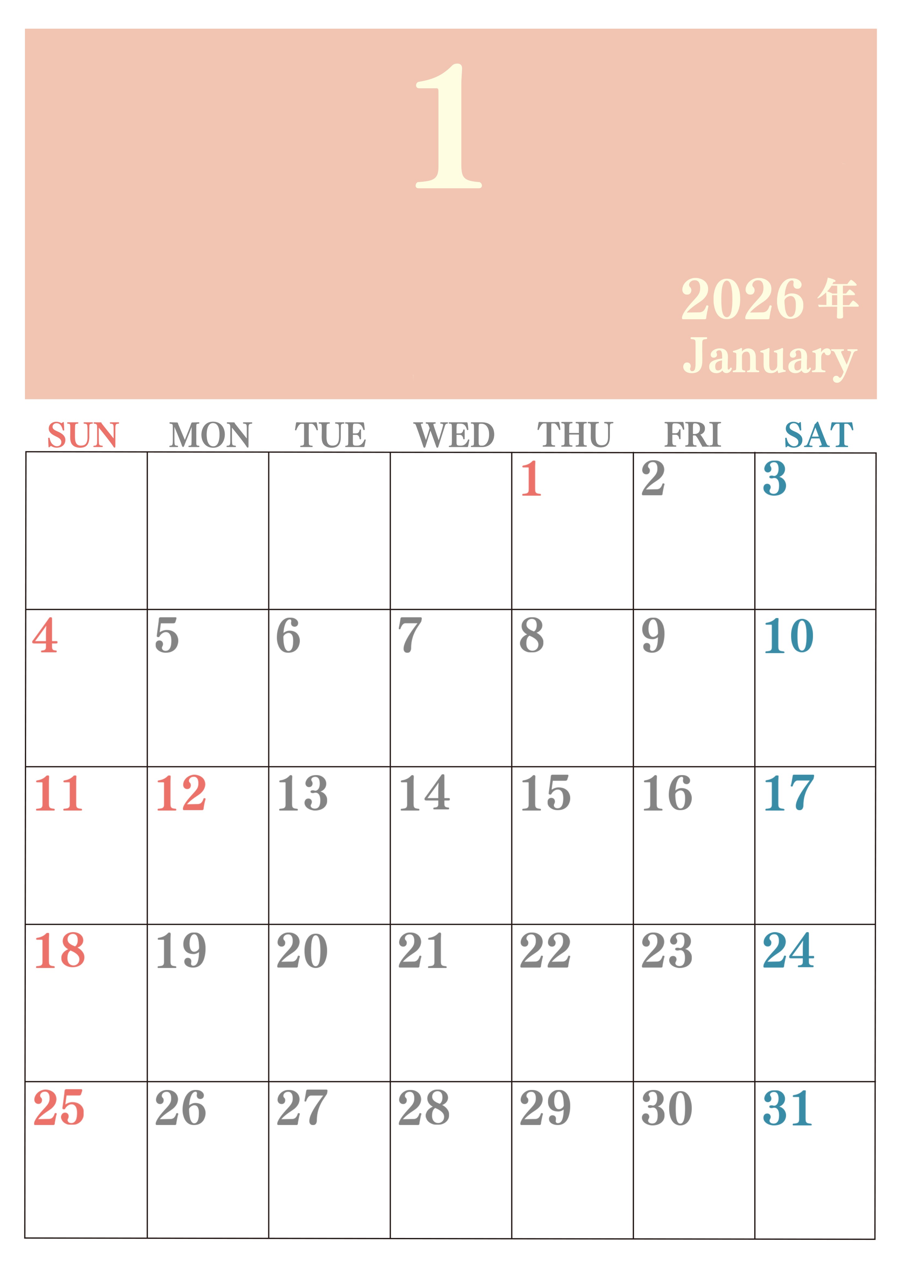 2026年・無料のカレンダーテンプレート 2026年1月縦型日曜始まり 大きい文字が見やすく書き込みも楽なA4無料シンプルカレンダー(2026-01140110) 素材状デザイン王 2025年4月8日 2026年1月縦型日曜始まりの大きい文字が見やすく書き込みも楽なA4無料シンプルカレンダーです。スケジュールの整理におすすめのフリー素材です。計画を効率的に立てましょう。(2026-01140110) シンプル 1月 縦型のカレンダー 日曜始まり カレンダーデザイン-0114