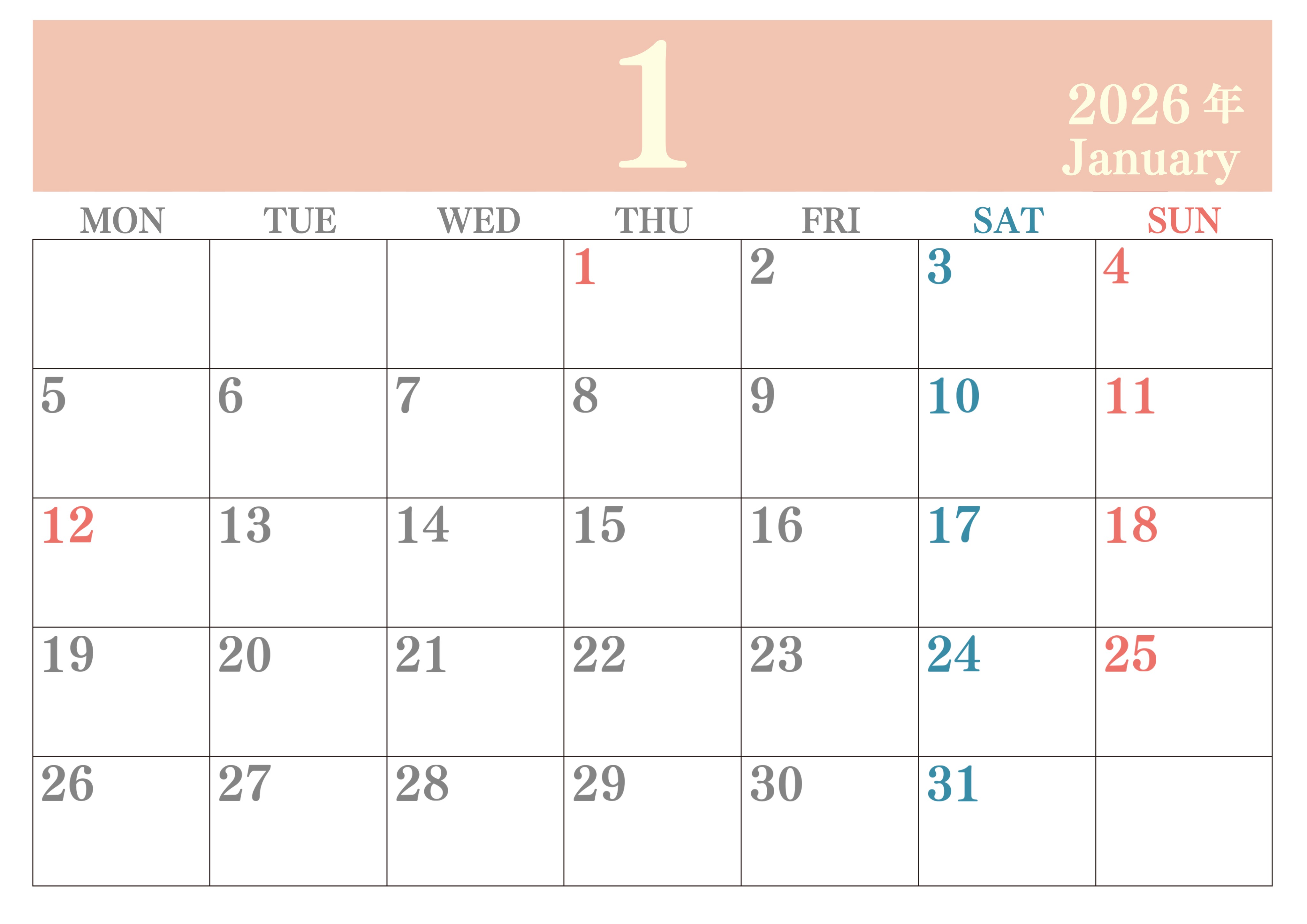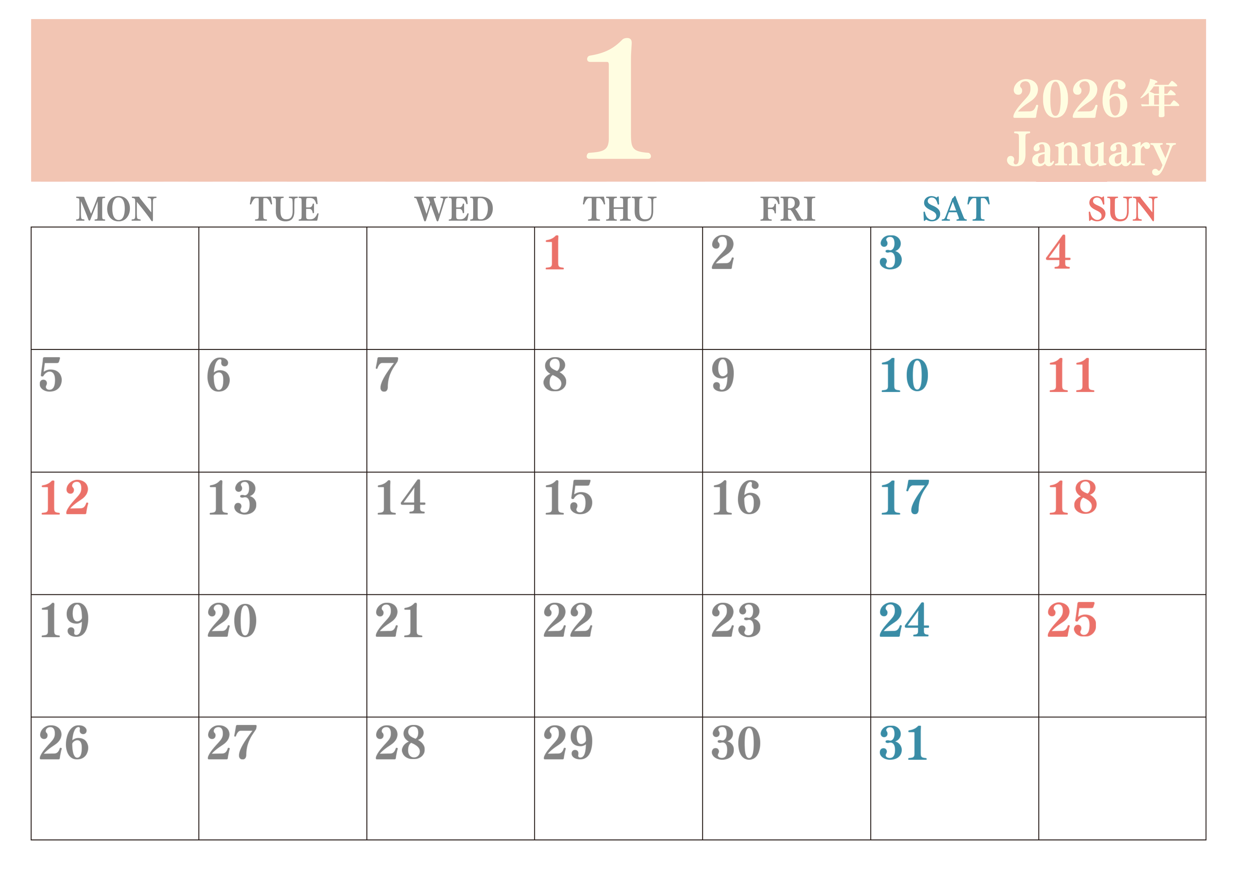2026年・無料のカレンダーテンプレート 2026年1月横型月曜始まり 大きい文字が見やすく書き込みも楽なA4無料シンプルカレンダー(2026-01140101) 素材状デザイン王 2025年4月8日 2026年1月横型月曜始まりの大きい文字が見やすく書き込みも楽なA4無料シンプルカレンダーです。スケジュールの整理におすすめのフリー素材です。計画を効率的に立てましょう。(2026-01140101) シンプル 1月 横型のカレンダー 月曜始まり カレンダーデザイン-0114