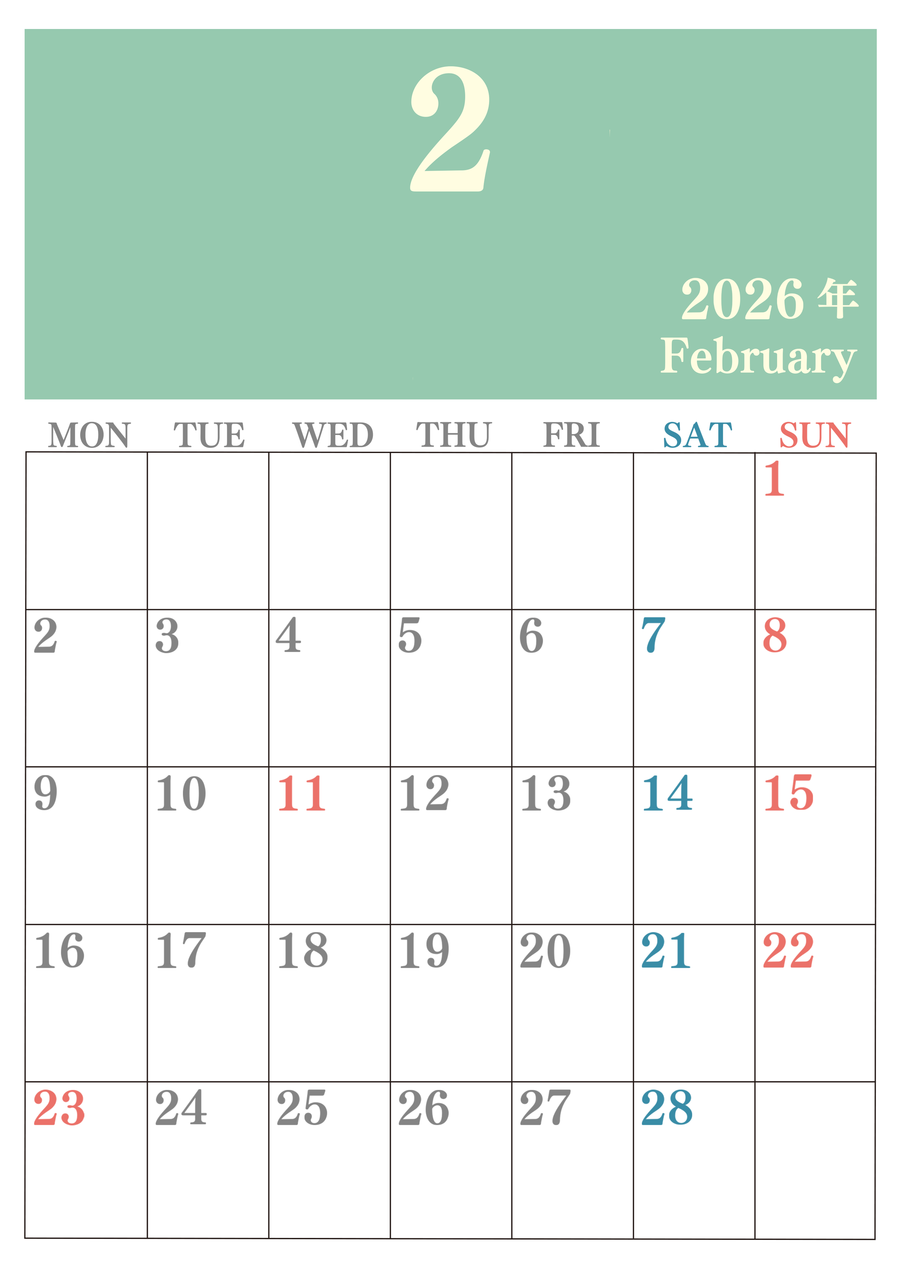 2026年2月縦型月曜始まり 大きい文字が見やすく書き込みも楽なA4無料シンプルカレンダー(2026-01140211)