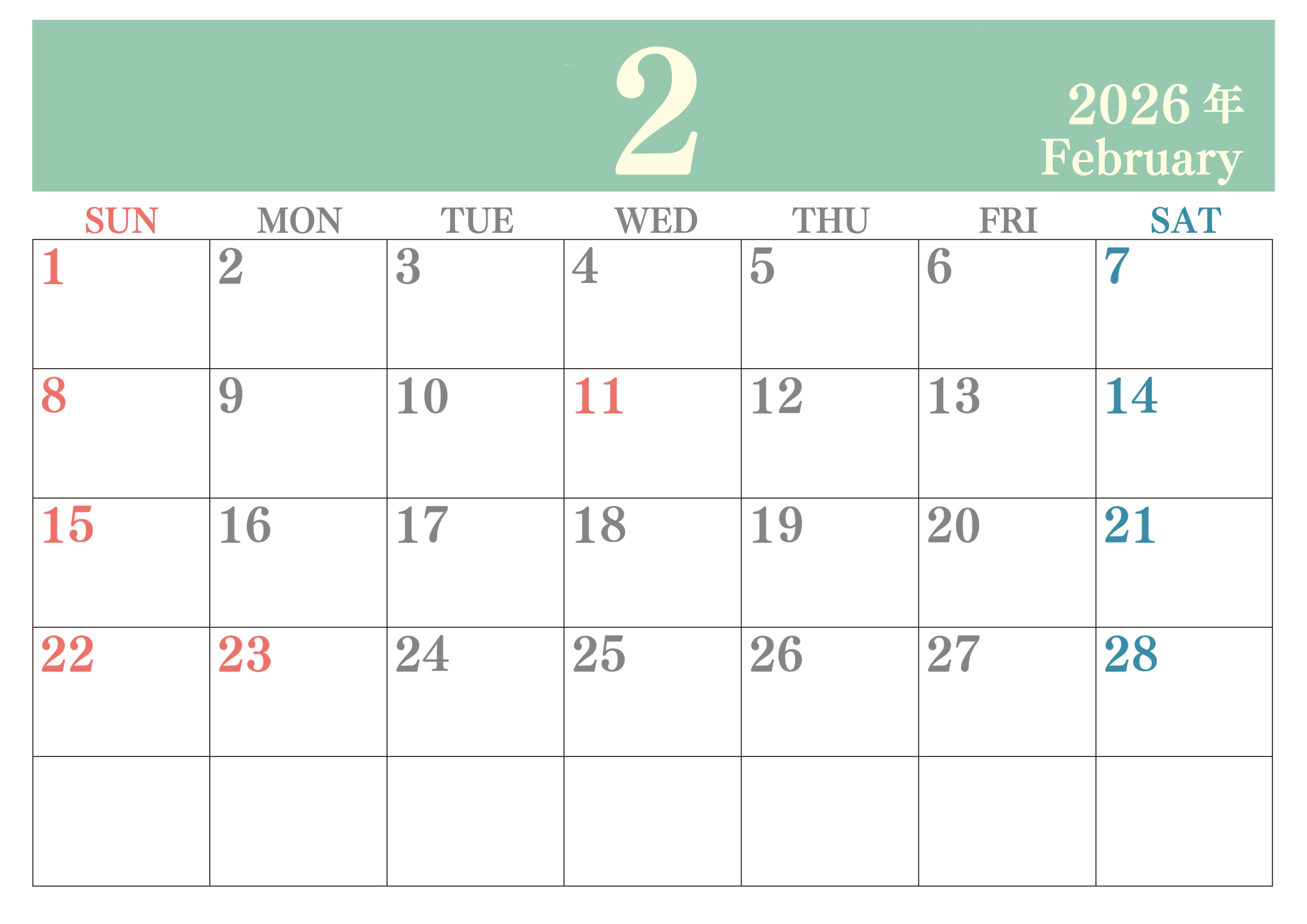 2026年・無料のカレンダーテンプレート 2026年2月横型日曜始まり 書き込みしやすい文字が大きなA4無料シンプルなカレンダー(2026-01140200) 素材状デザイン王 2025年4月8日 2026年2月横型日曜始まりの大きい文字が見やすく書き込みも楽なA4無料シンプルカレンダーです。スケジュールの整理におすすめのフリー素材です。忙しいスケジュールを簡単にまとめて書き込みましょう。(2026-01140200) シンプル 2月 横型のカレンダー 日曜始まり カレンダーデザイン-0114