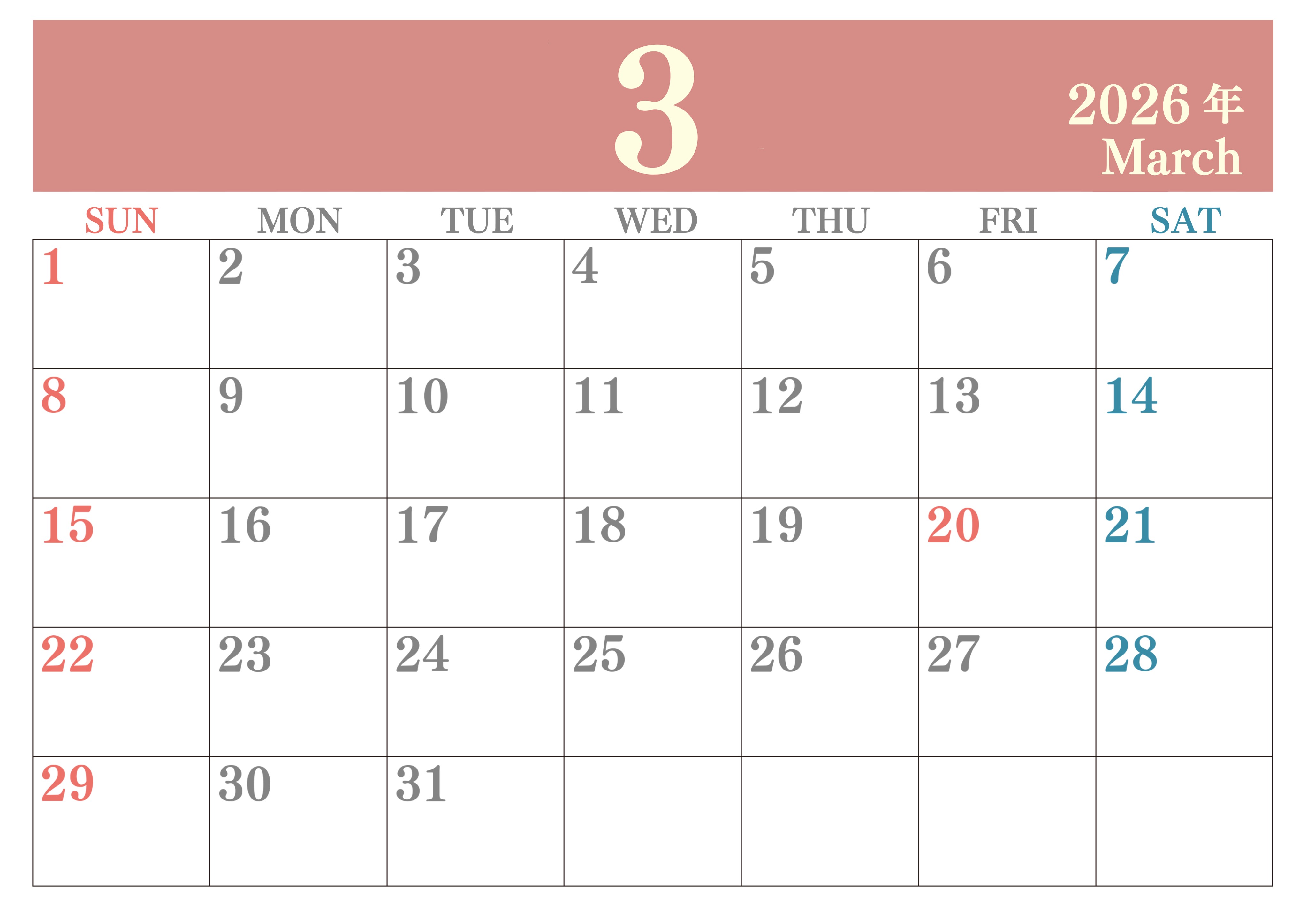 2026年・無料のカレンダーテンプレート 2026年3月横型日曜始まり 大きい文字が見やすく書き込みも楽なA4無料シンプルカレンダー(2026-01140300) 素材状デザイン王 2025年4月8日 2026年3月横型日曜始まりの大きい文字が見やすく書き込みも楽なA4無料シンプルカレンダーです。スケジュールの整理におすすめのフリー素材です。多忙なプランの可視化に役立ちます。(2026-01140300) シンプル 3月 横型のカレンダー 日曜始まり カレンダーデザイン-0114