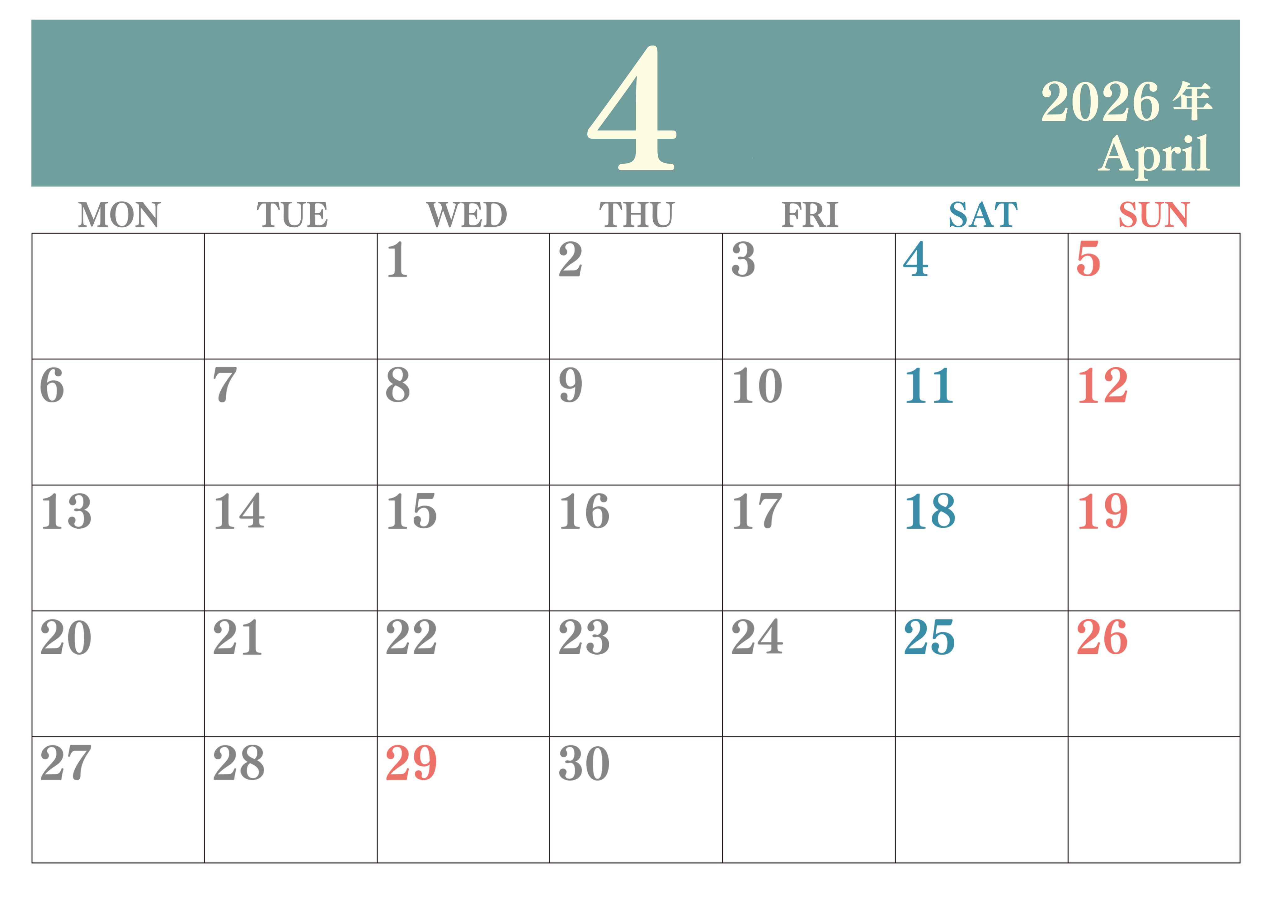 2026年4月横型月曜始まり 大きい文字が見やすく書き込みも楽なA4無料シンプルカレンダー(2026-01140401)