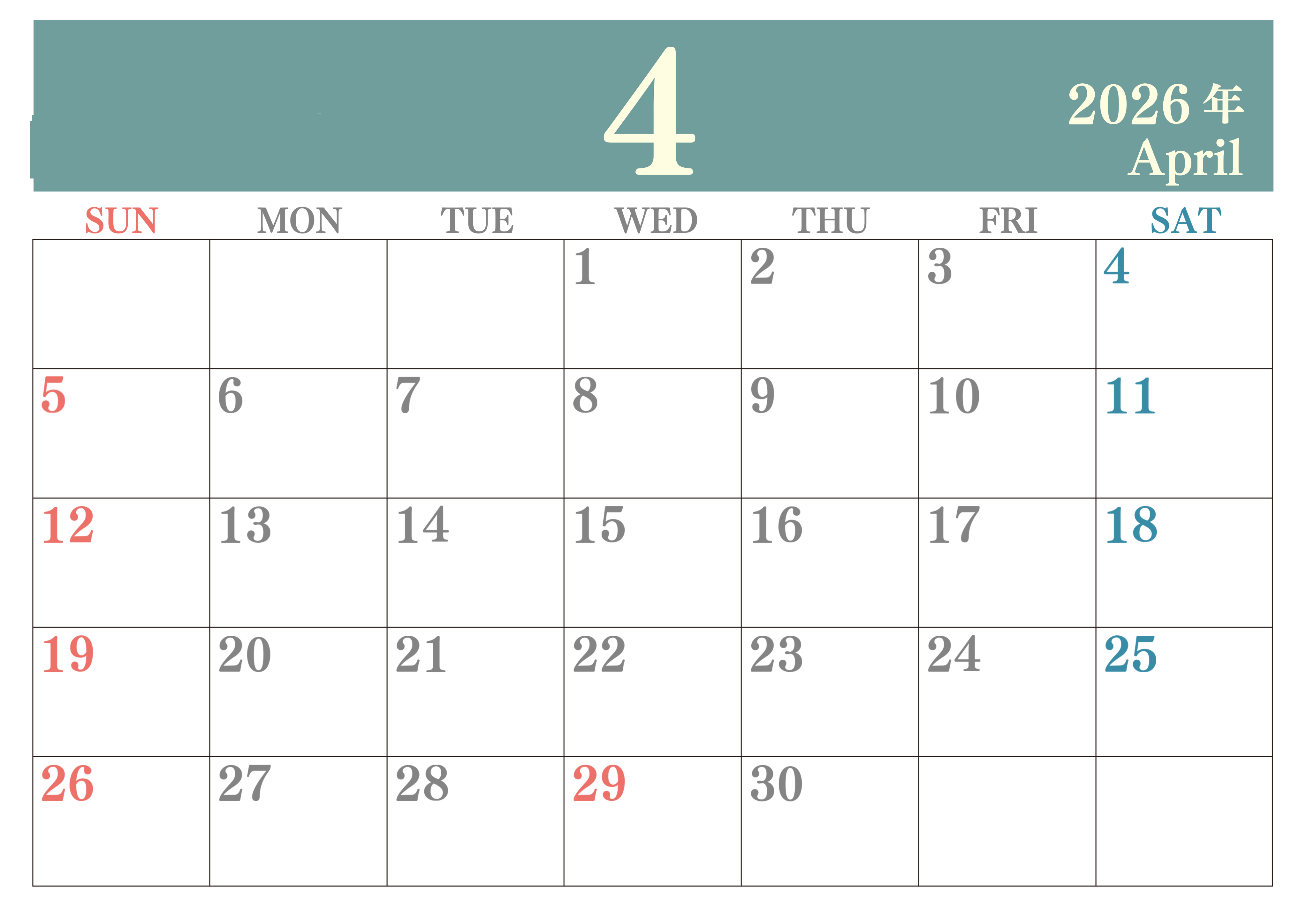 2026年・無料のカレンダーテンプレート 2026年4月横型日曜始まり 大きい文字が見やすく書き込みも楽なA4無料シンプルカレンダー(2026-01140400) 素材状デザイン王 2025年4月8日 2026年4月横型日曜始まりの大きい文字が見やすく書き込みも楽なA4無料シンプルカレンダーです。スケジュールの整理におすすめのフリー素材です。計画を効率的に立てましょう。(2026-01140400) シンプル 4月 横型のカレンダー 日曜始まり カレンダーデザイン-0114