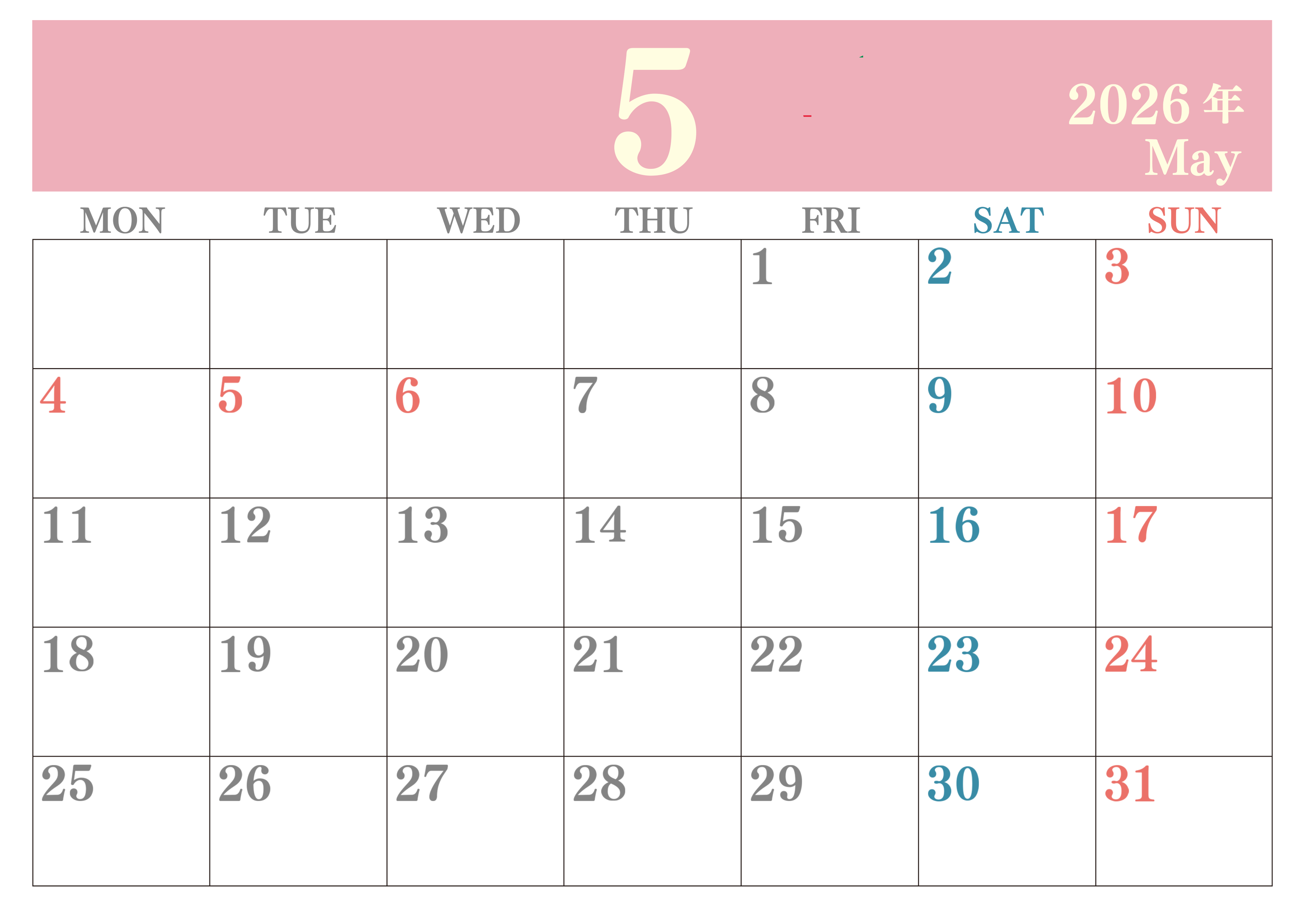 2026年・無料のカレンダーテンプレート 2026年5月横型月曜始まり 大きい文字が見やすく書き込みも楽なA4無料シンプルカレンダー(2026-01140501) 素材状デザイン王 2025年4月8日 2026年5月横型月曜始まりの大きい文字が見やすく書き込みも楽なA4無料シンプルカレンダーです。スケジュールの整理におすすめのフリー素材です。忙しいスケジュールを簡単にまとめて書き込みましょう。(2026-01140501) シンプル 5月 横型のカレンダー 月曜始まり カレンダーデザイン-0114